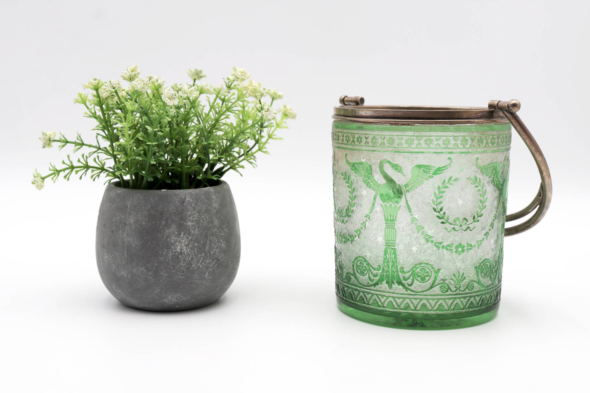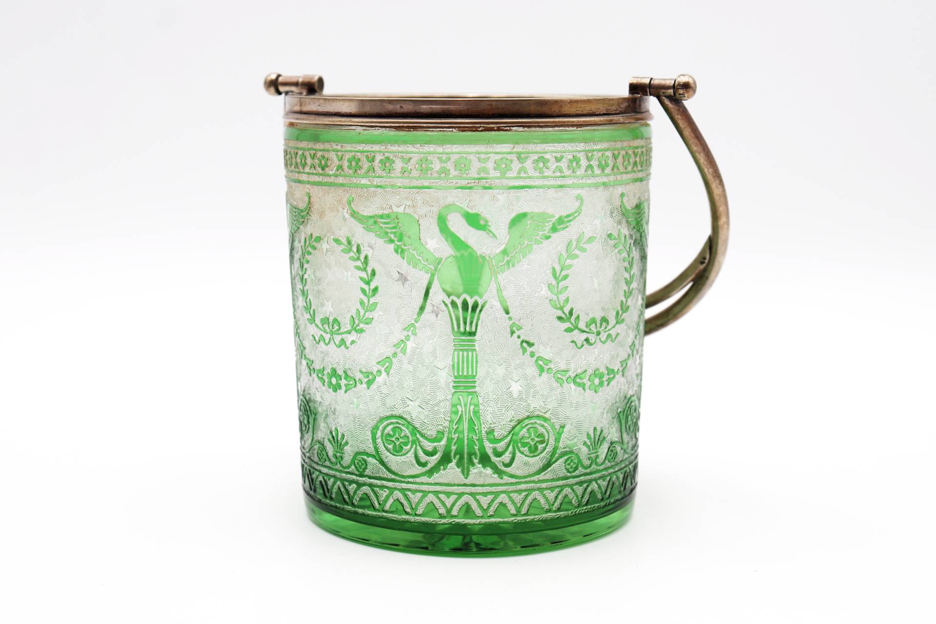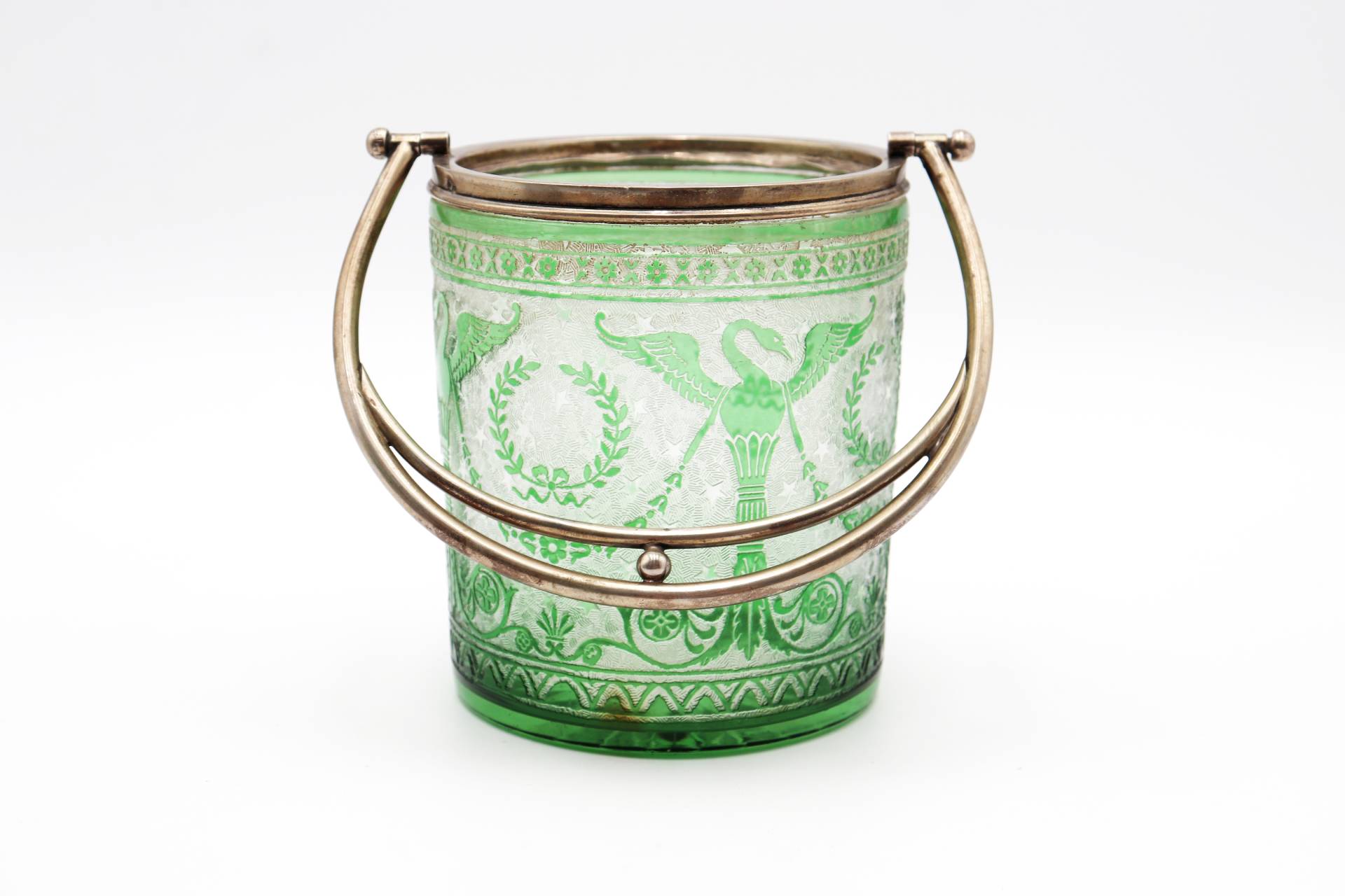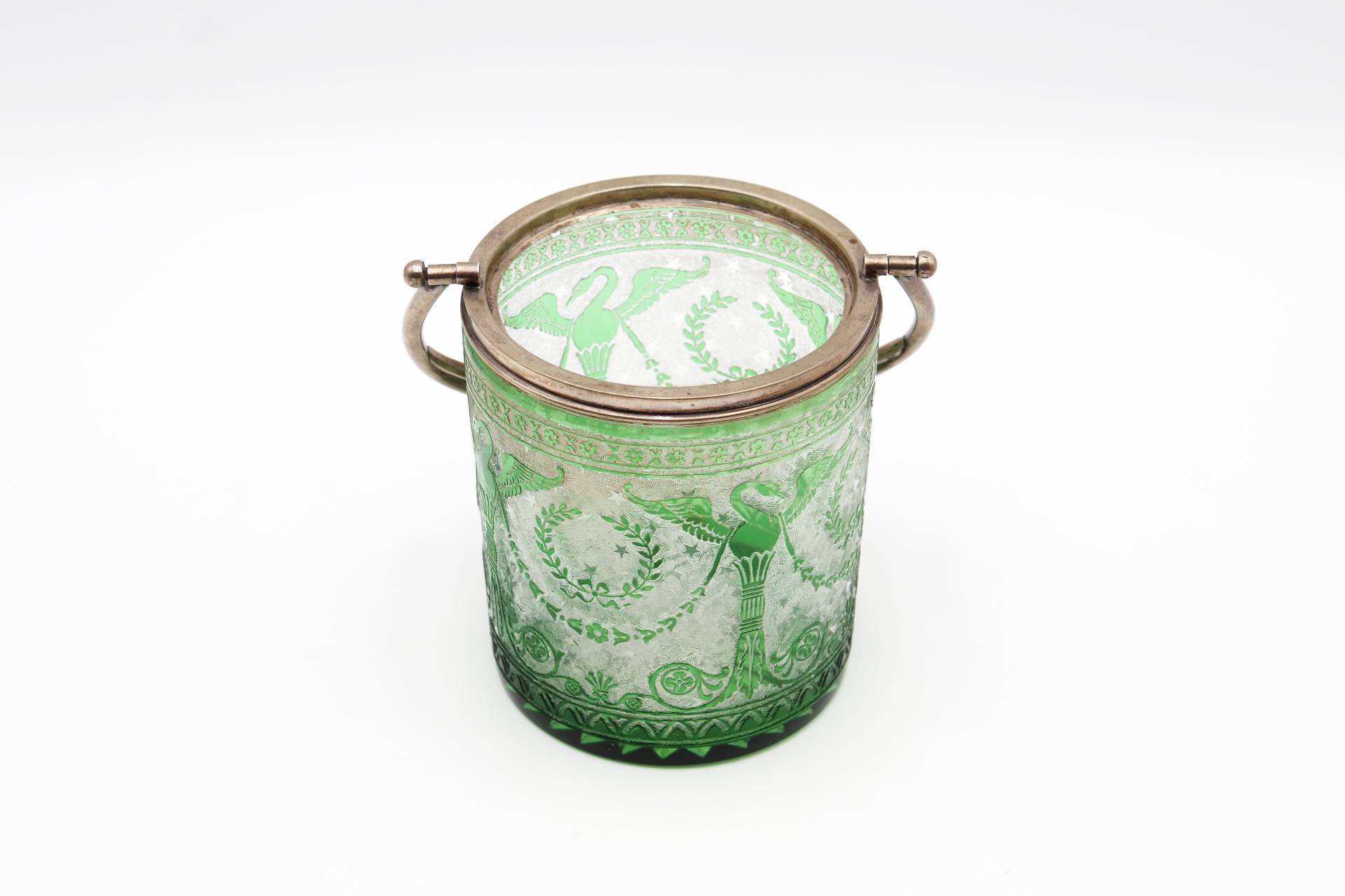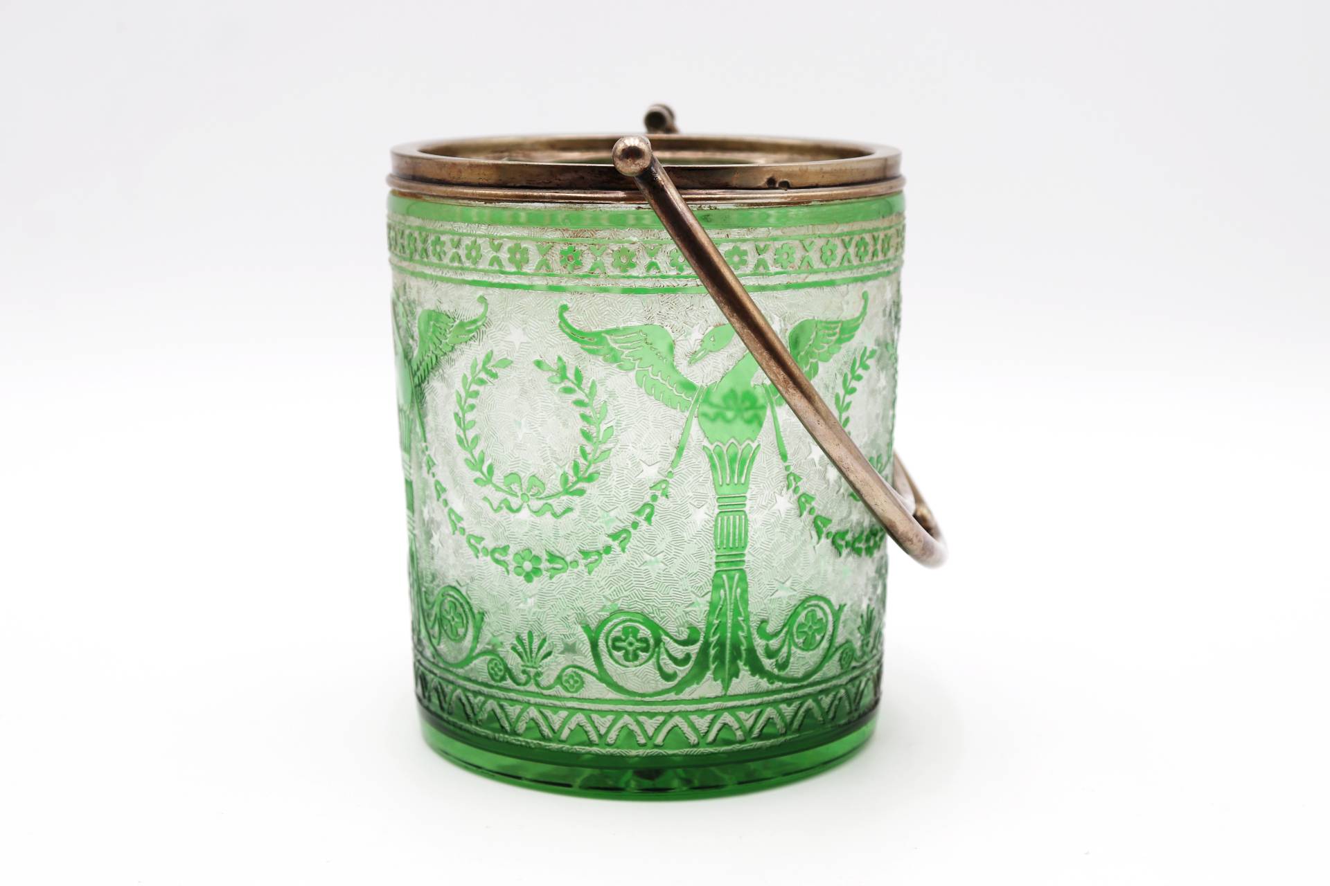 Balde de gelo em vidro verde gravado a ácido com estrutura em prata e asa