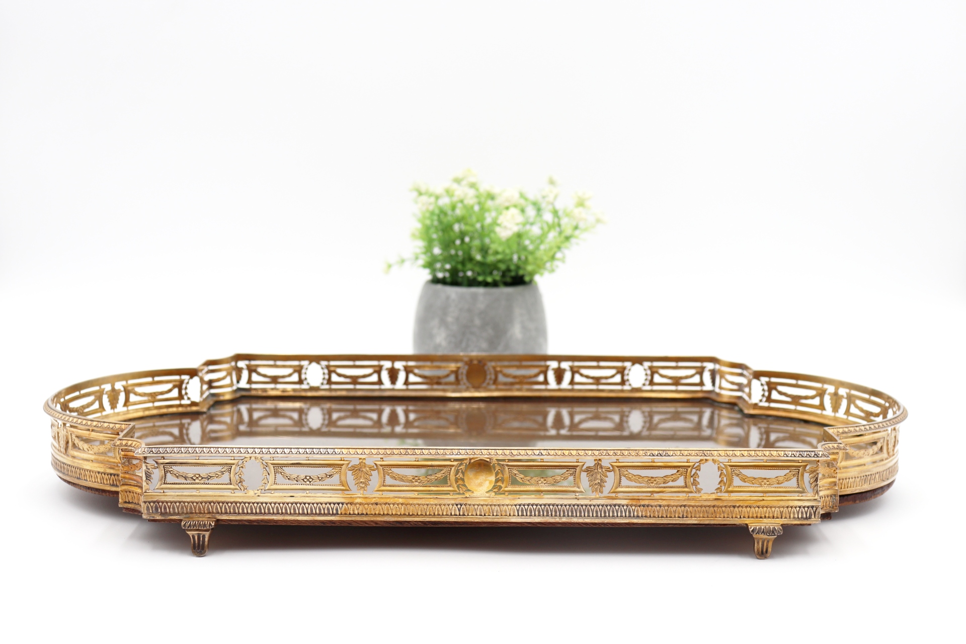 • Descrição: Bandeja de mesa com gradinha recortada, com grinaldas, coroas e frisos envolventes em prata dourada com assente em quatro pés recortados, centro em vidro sobre madeira.