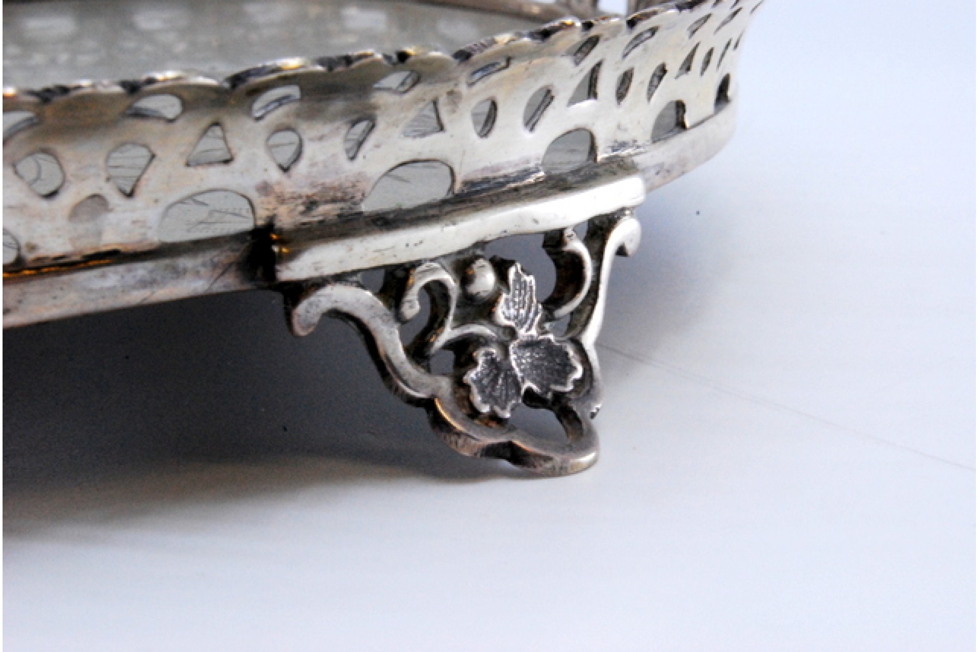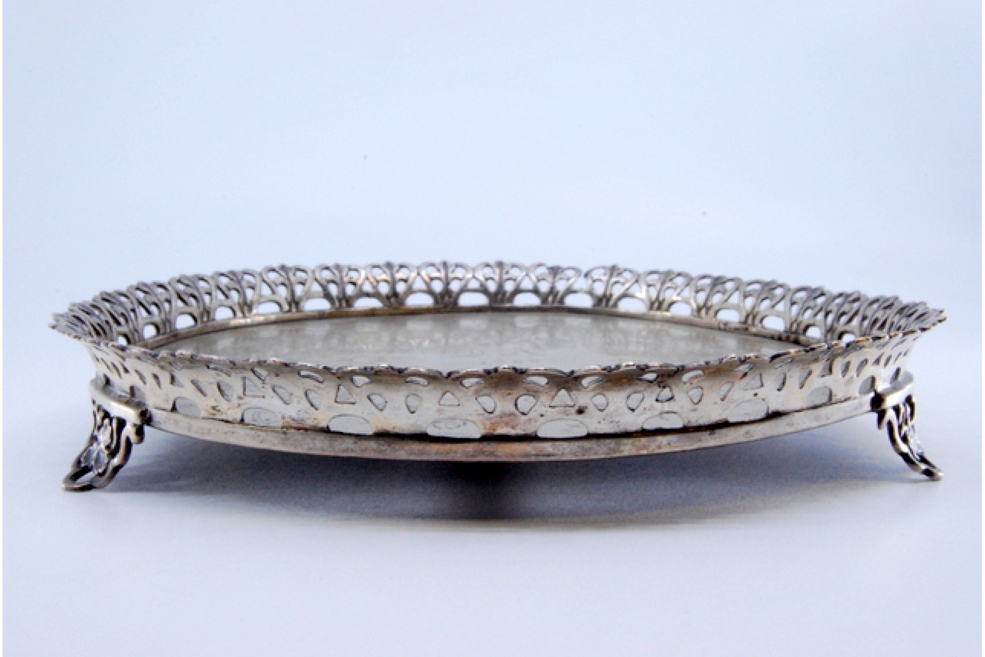 • Descrição: Bilheteira em prata com gradinha e centro gravado com motivos florais, assente em três pés.