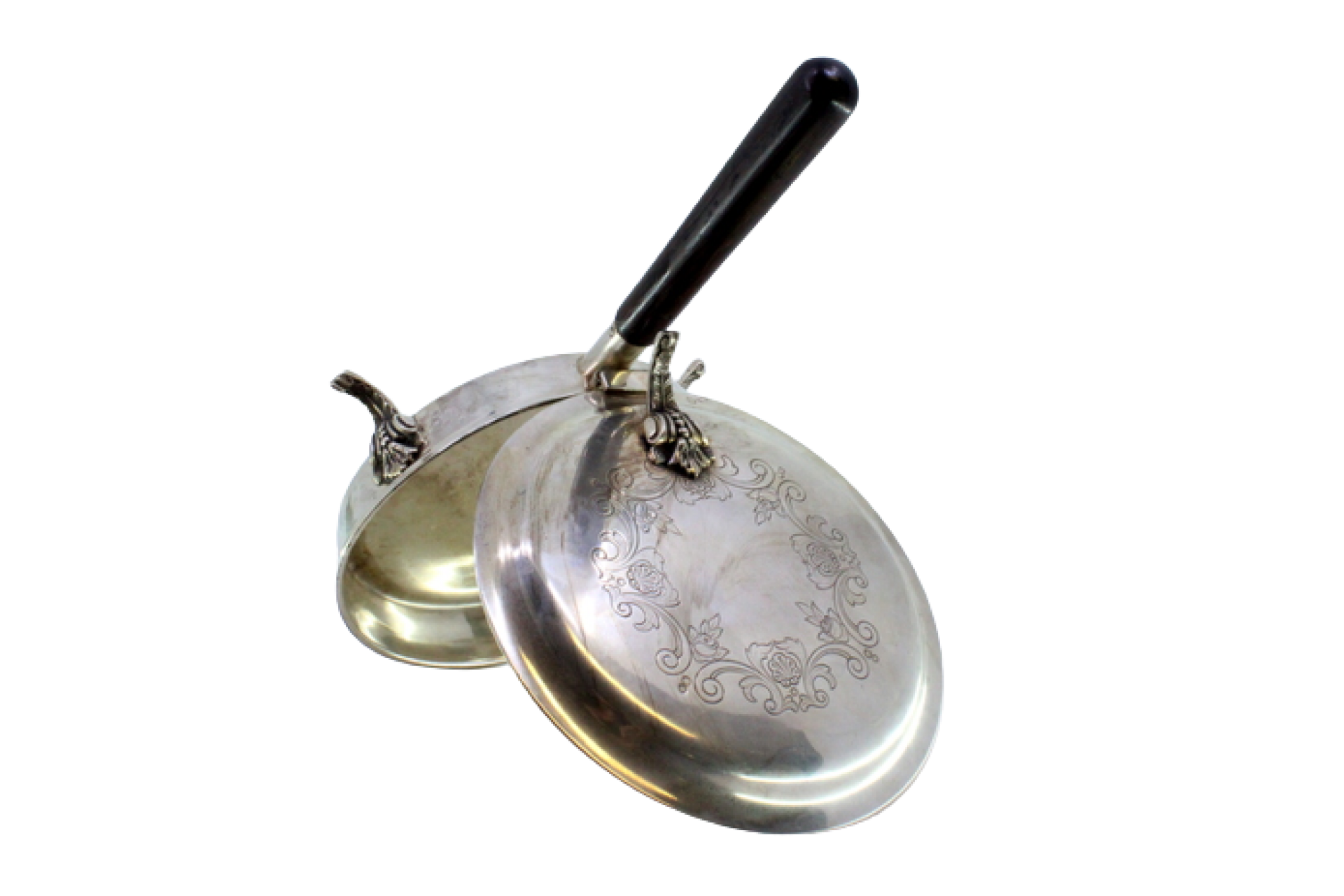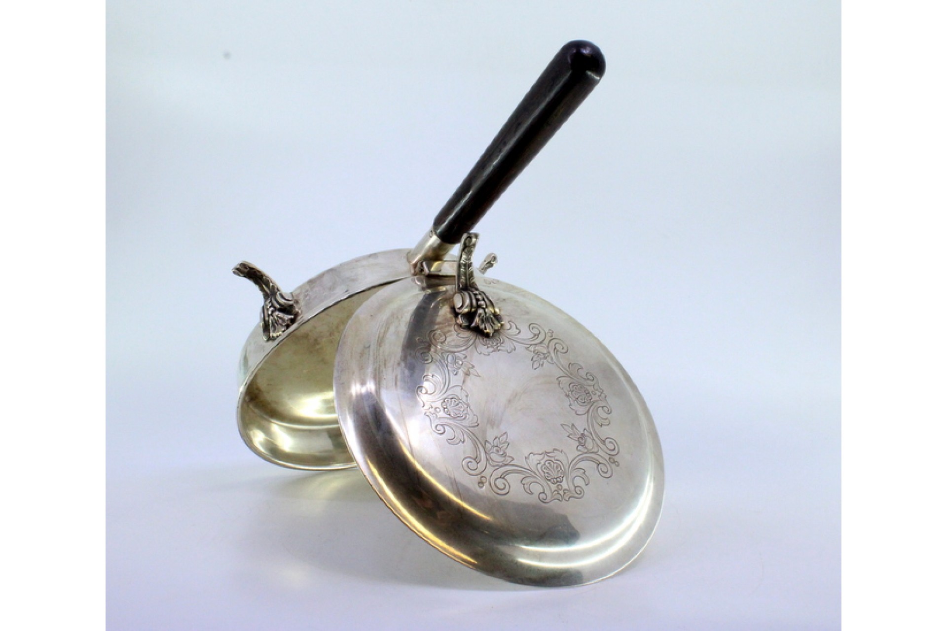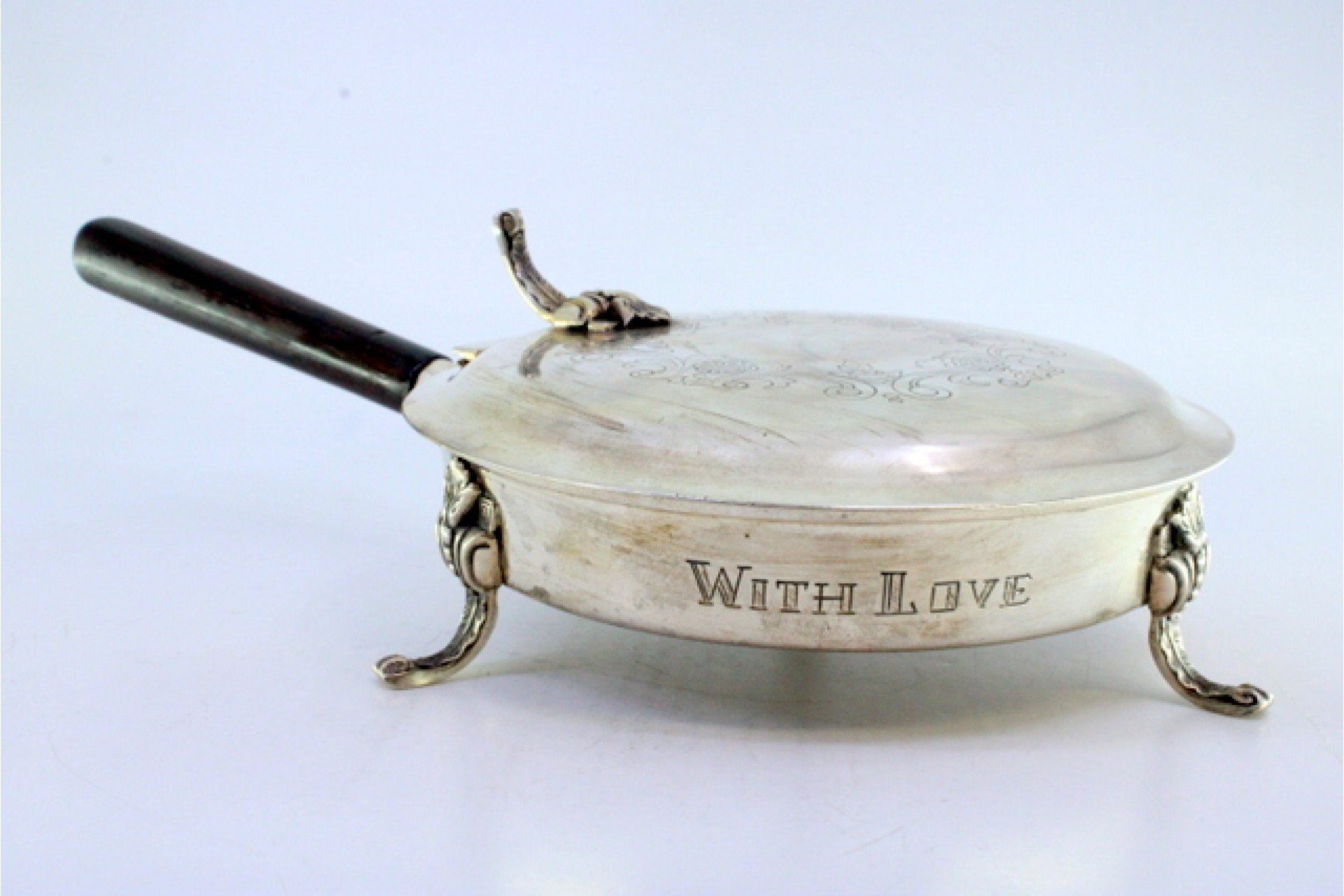 Beateira em prata com motivos florais gravados na tampa, assente sobre três pés relevados e cabo em madeira.