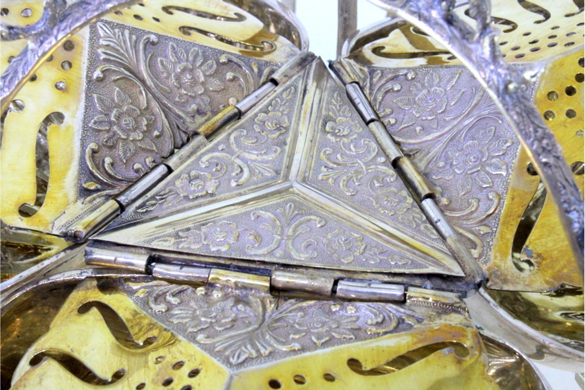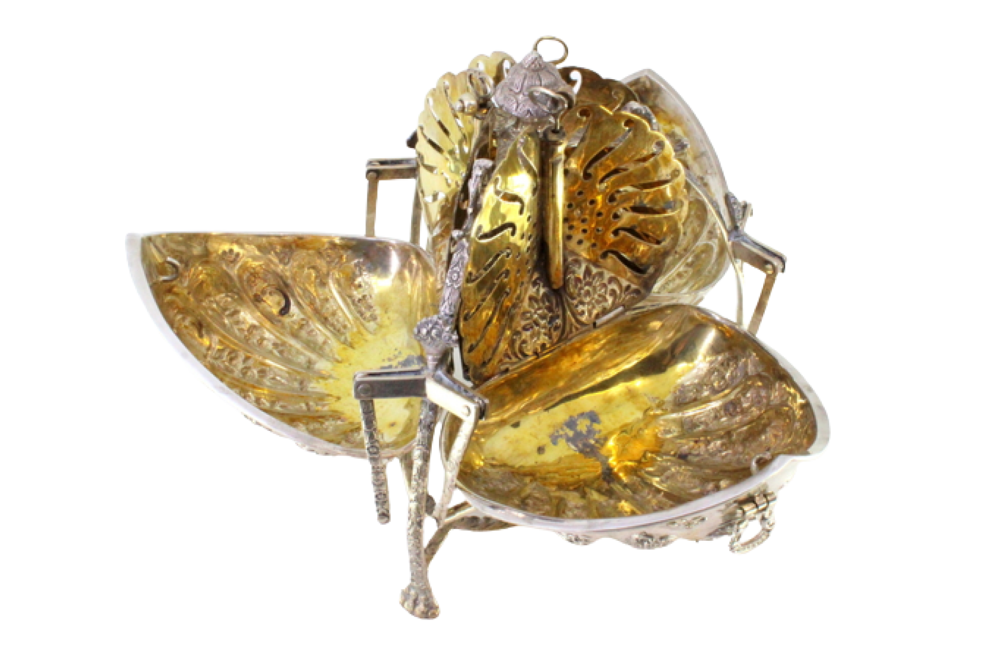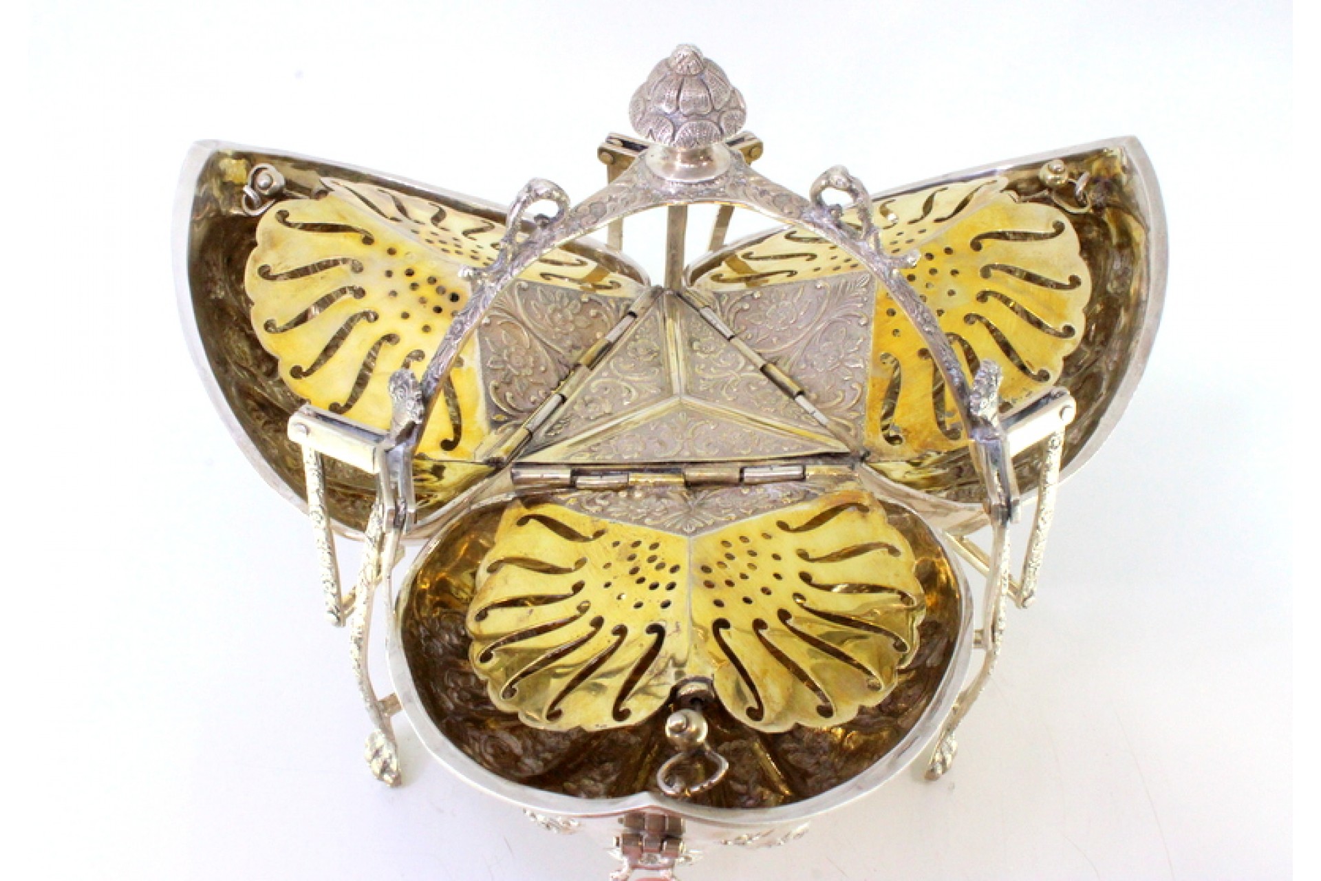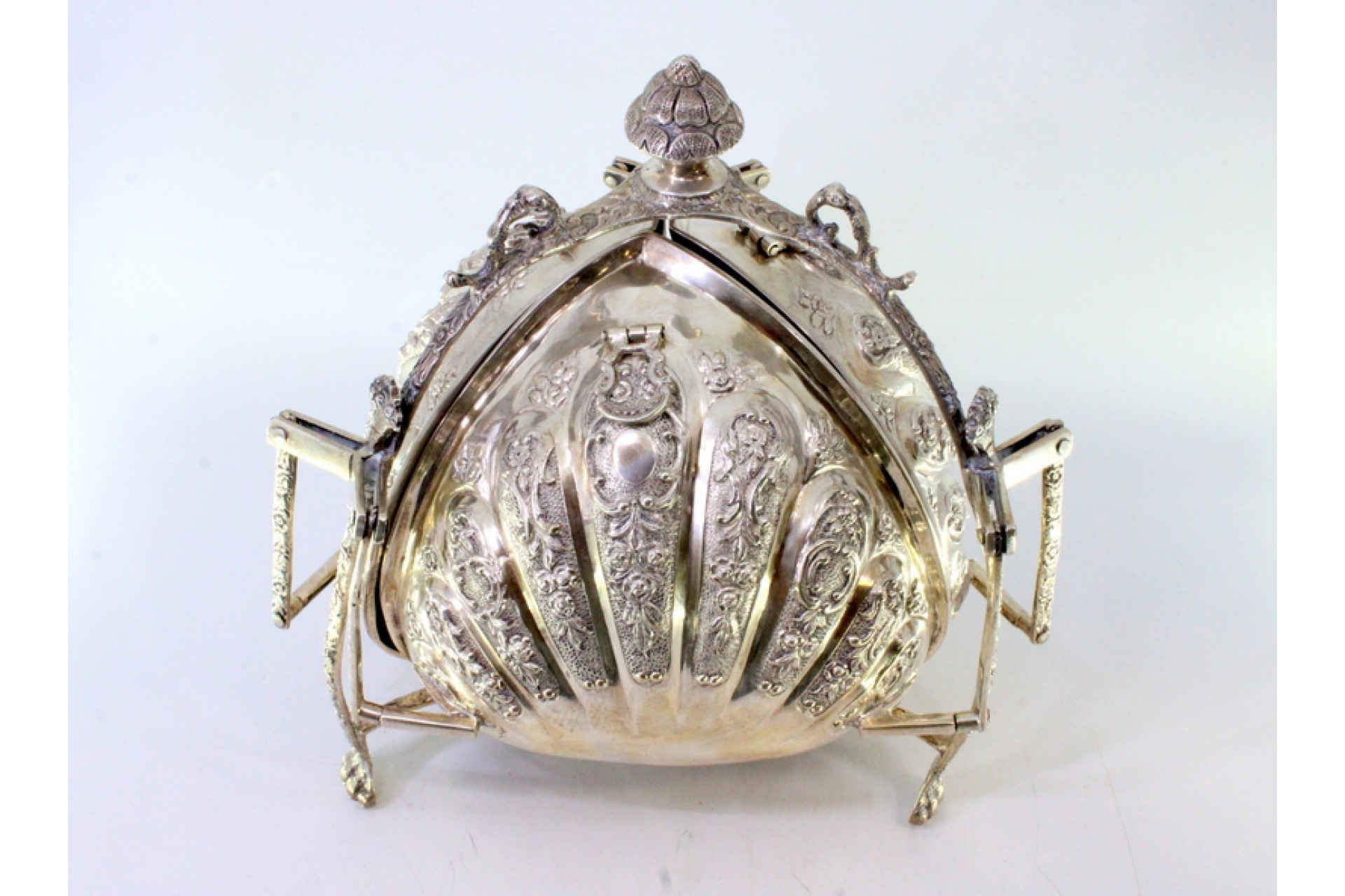 Biscoiteira em prata em forma de concha com relevos e aplicações, interior dourado recortado de forma triforme assente em três pés em forma de garras