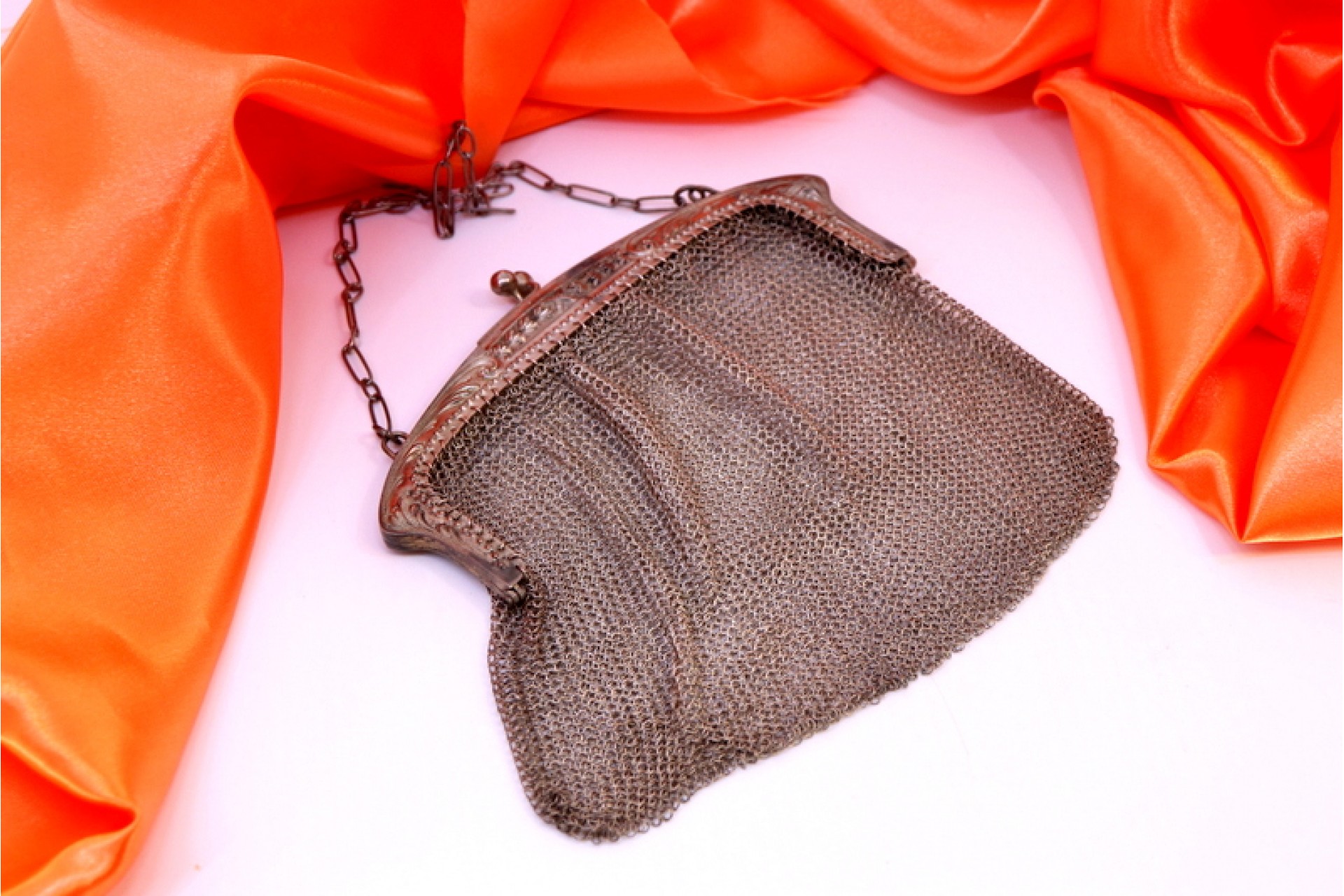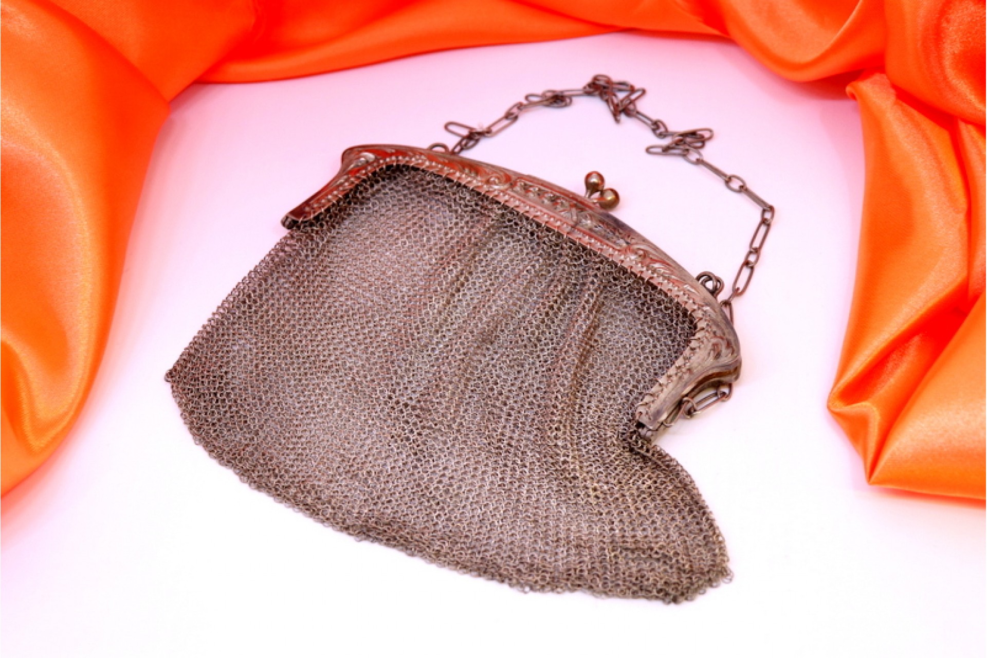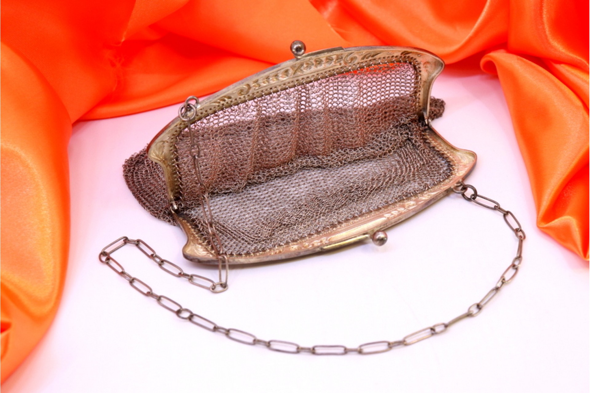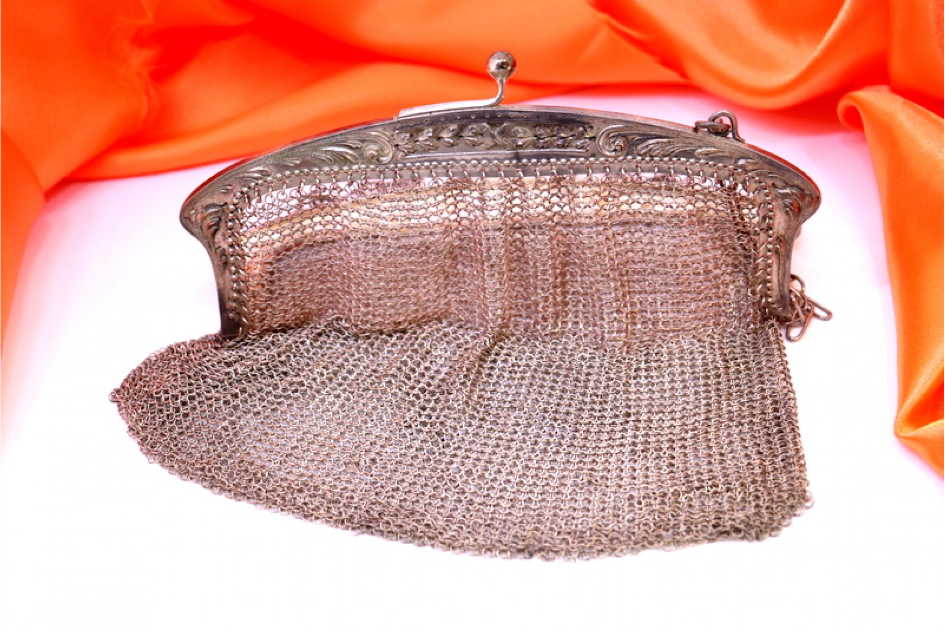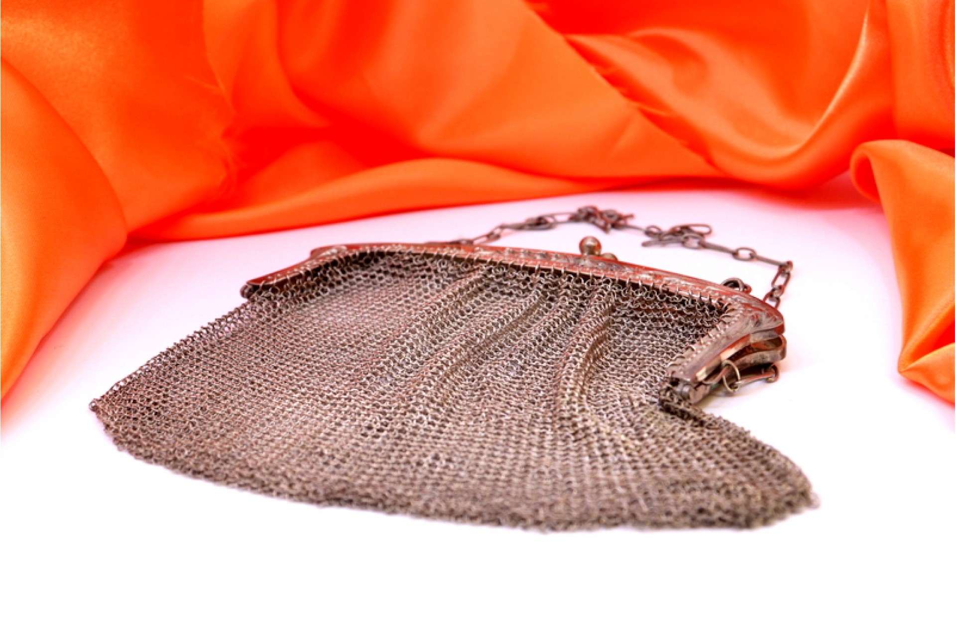 • Descrição: Bolsa em malha de prata com relevos no arco e corrente em malha cadeado.