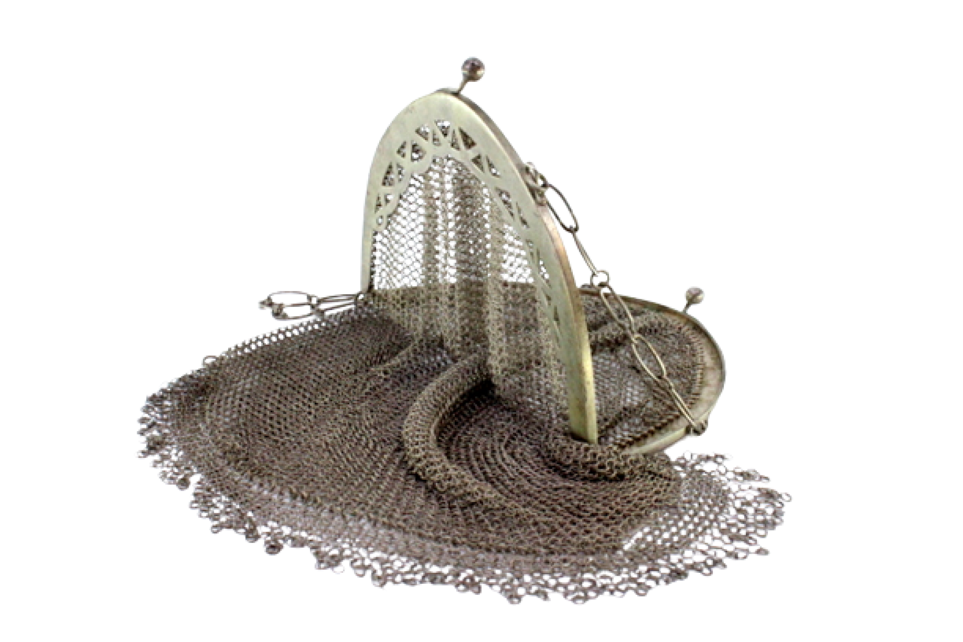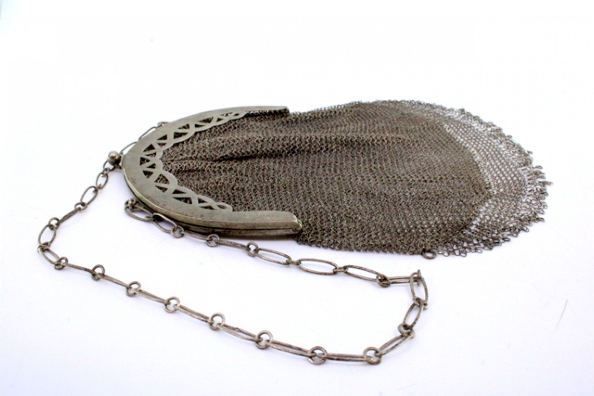 • Descrição: Bolsa de mão em malha de prata com arco recortado, franjas pendentes e corrente em malha cadeado.