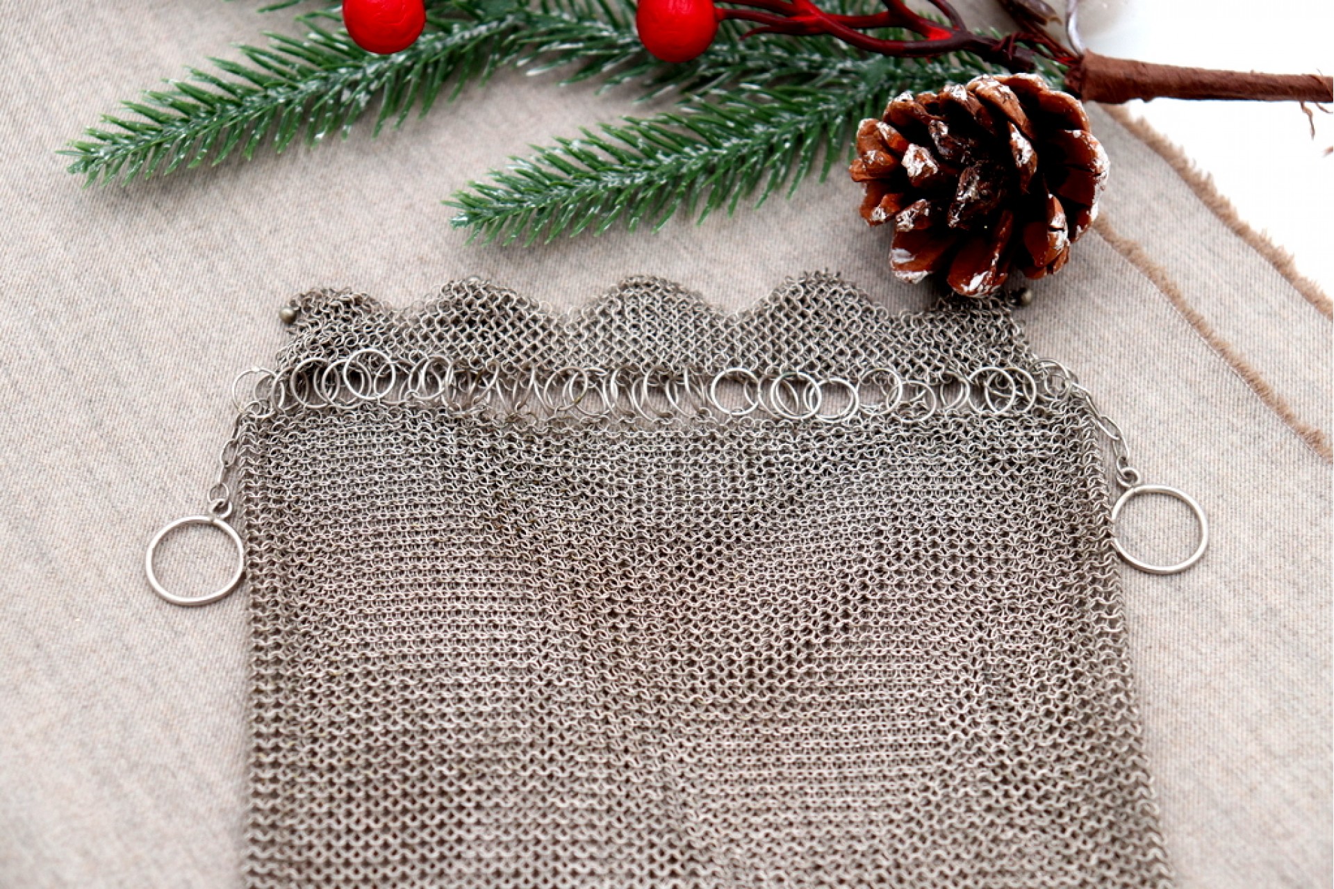 • Descrição: Bolsa de mão em malha de prata com argolas e pingentes articulados em forma esféricas.