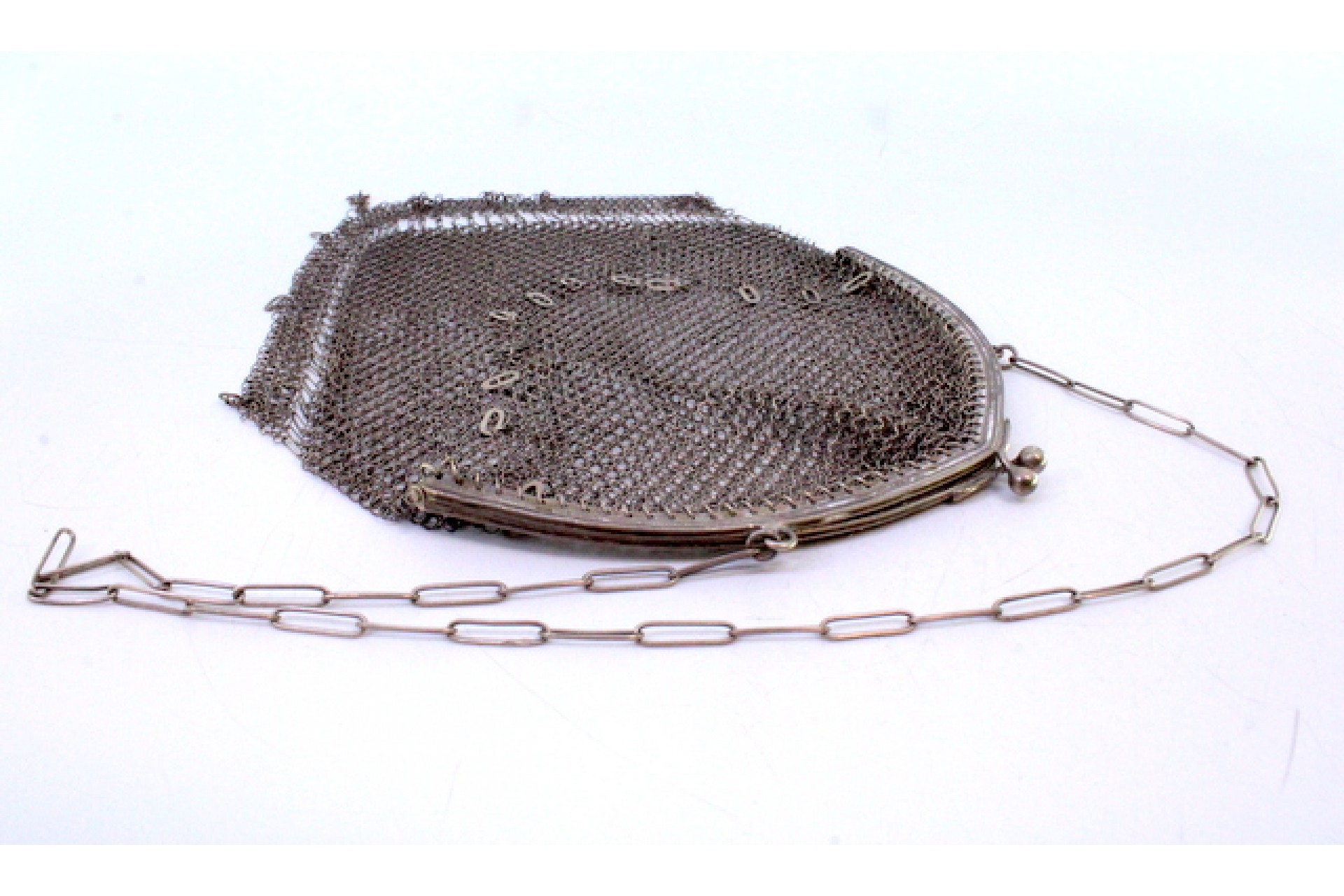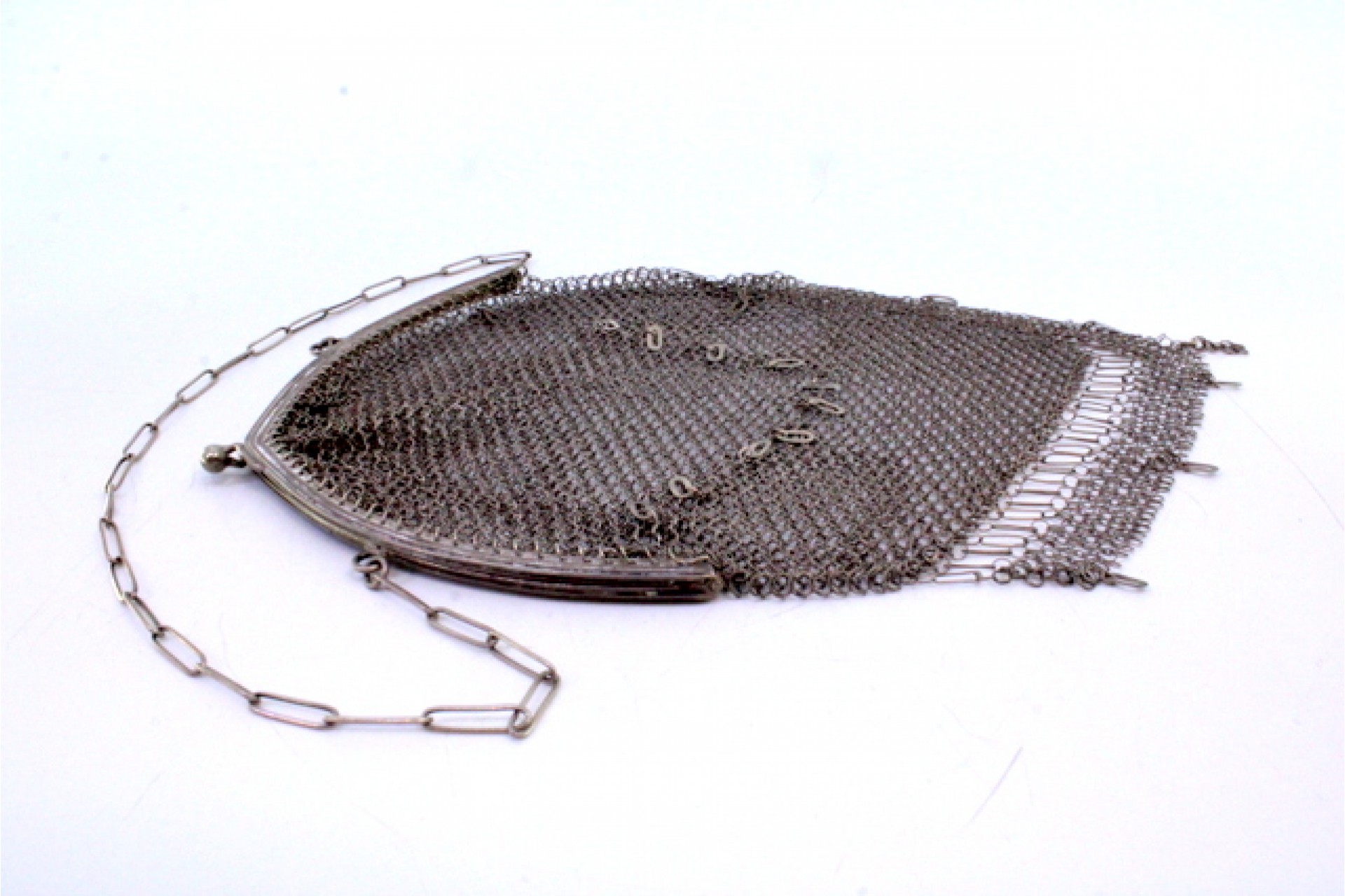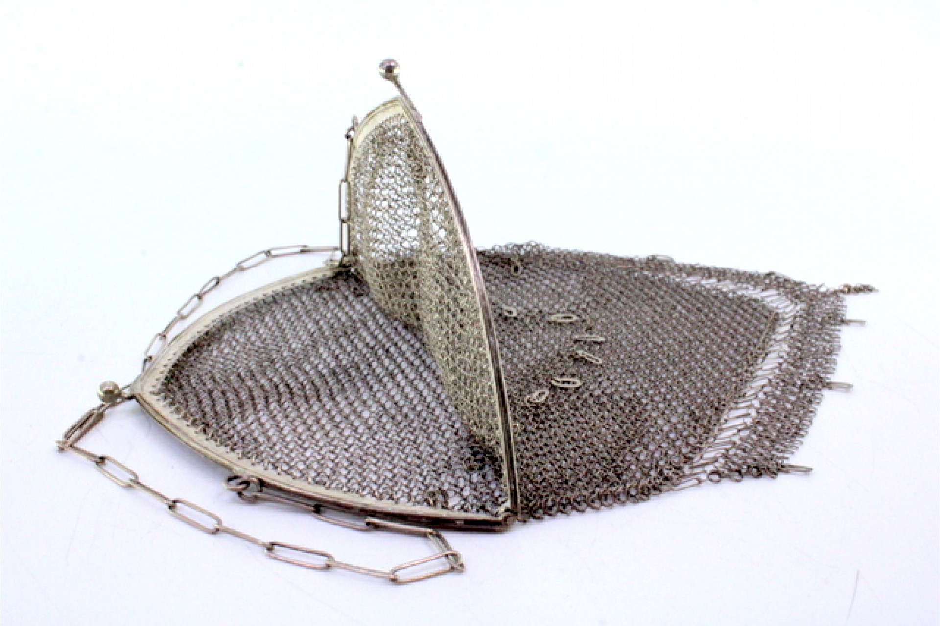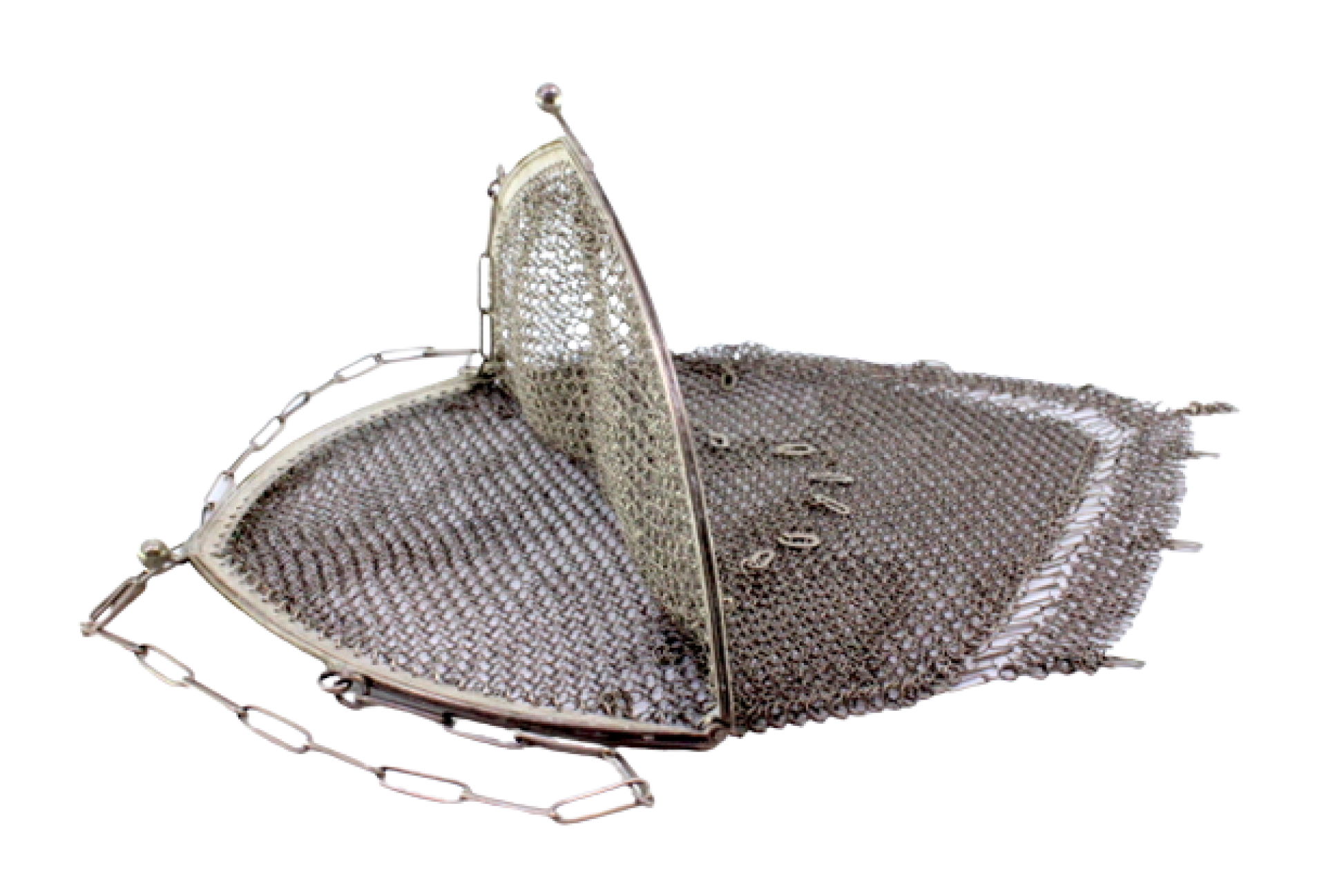 • Descrição: Bolsa de mão em malha de prata com franjas pendentes, arco com duplo friso e corrente em malha de cadeado.