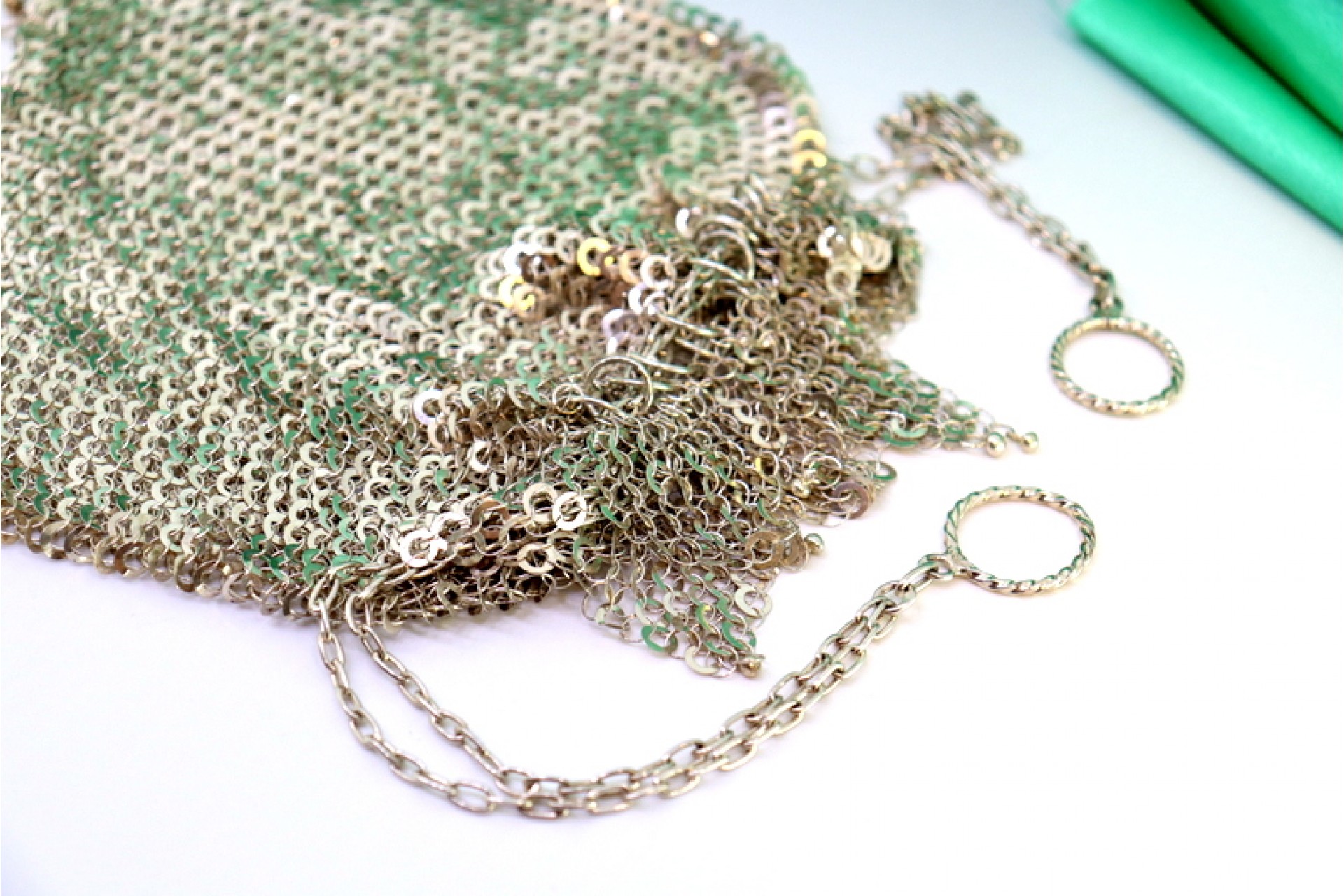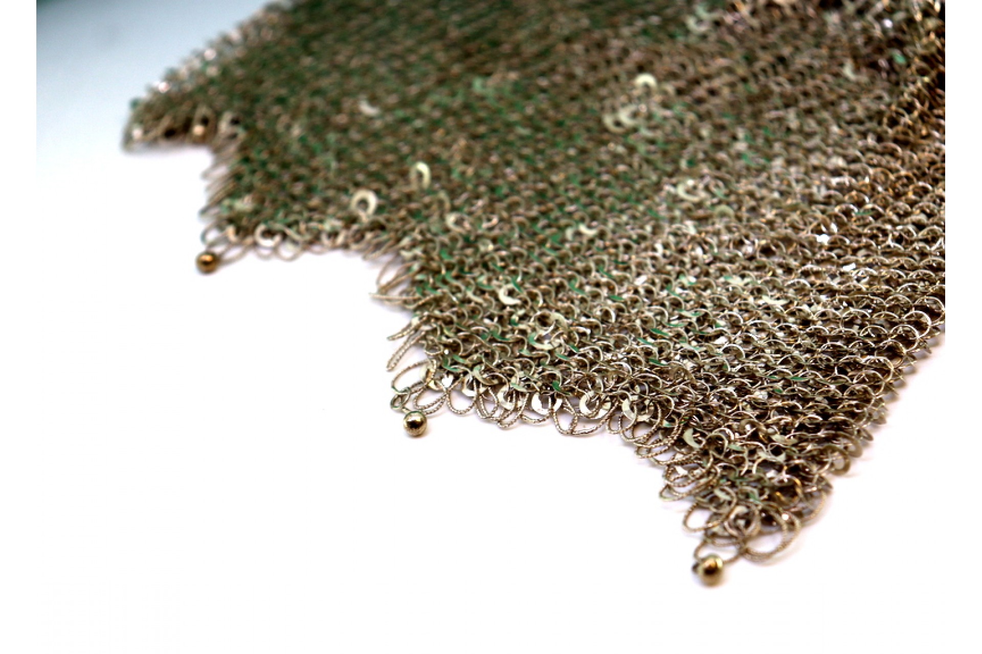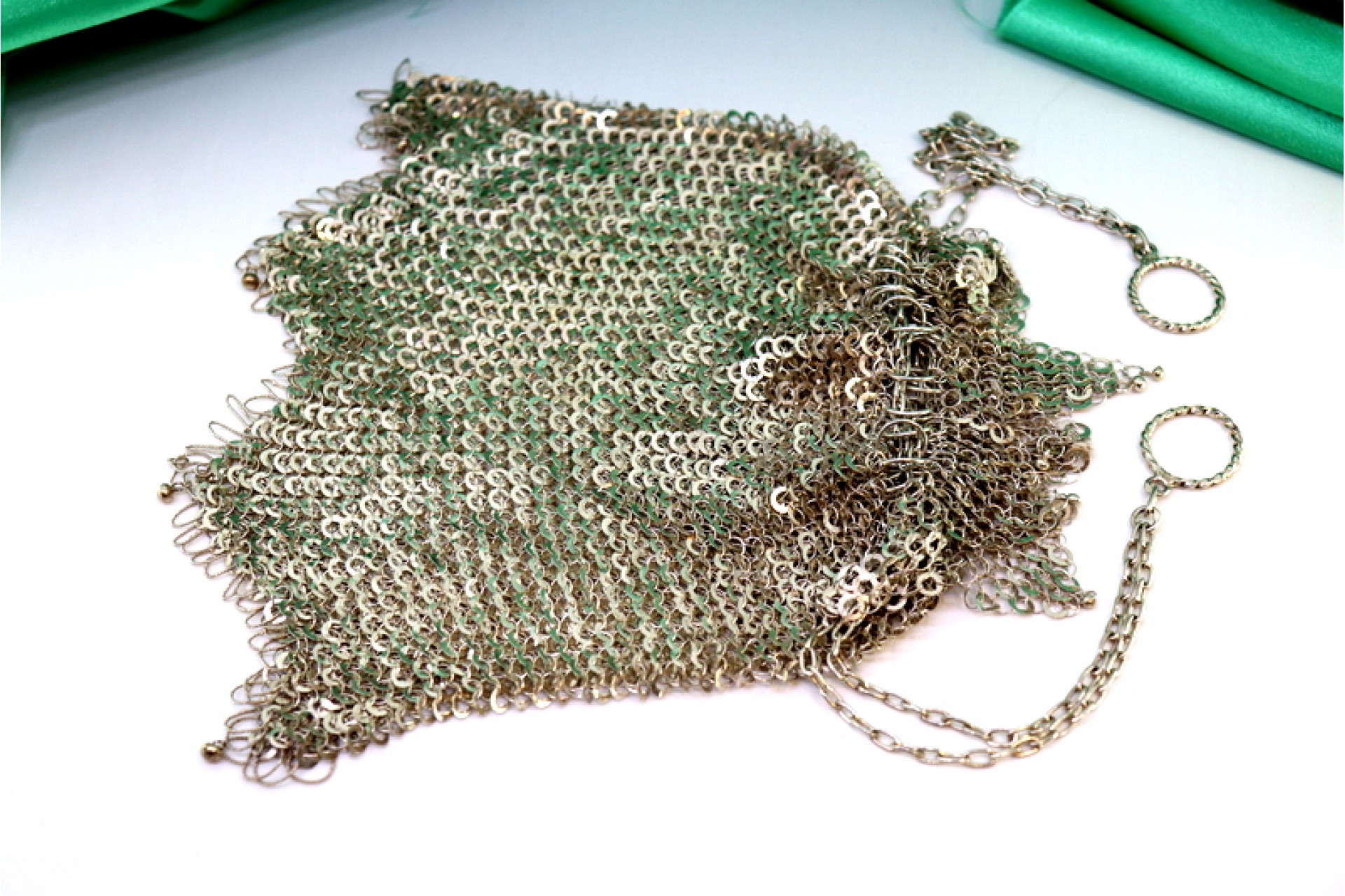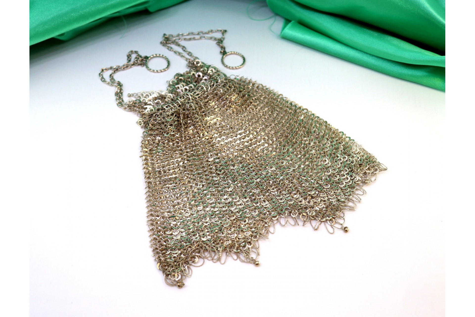 • Descrição: Bolsa de mão em malha de prata fantasiada com duas argolas e franjas suspensas com quatro bolas.