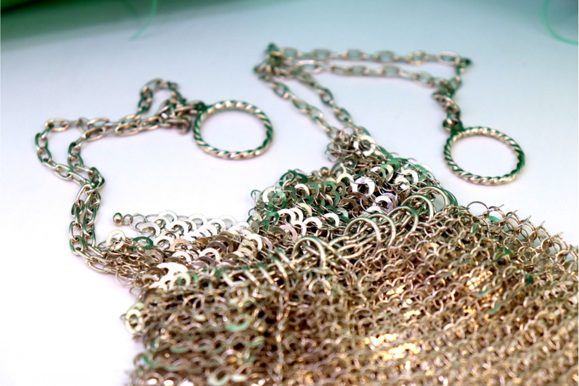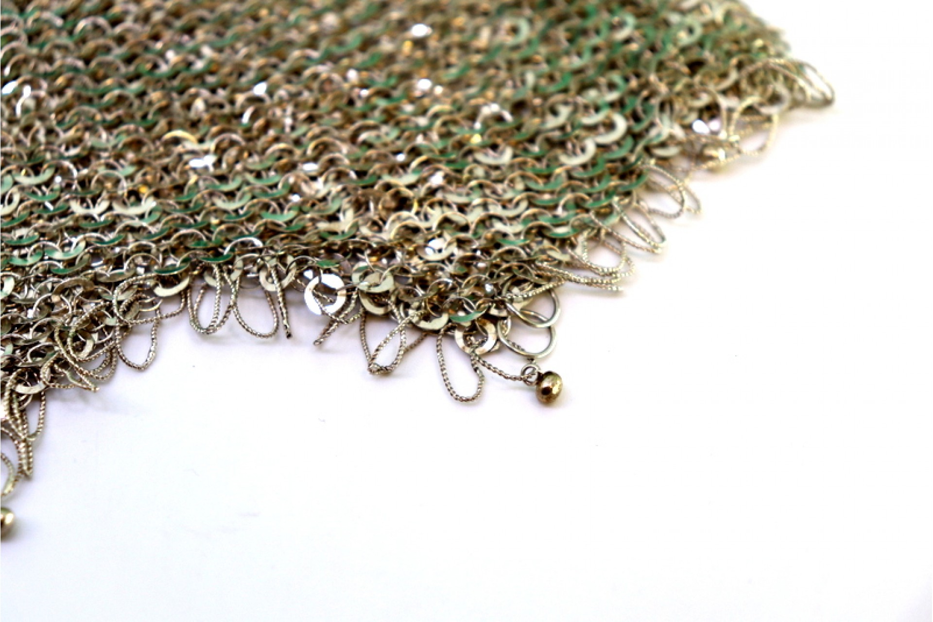 Bolsa de mão em malha de prata fantasiada com duas argolas e franjas suspensas