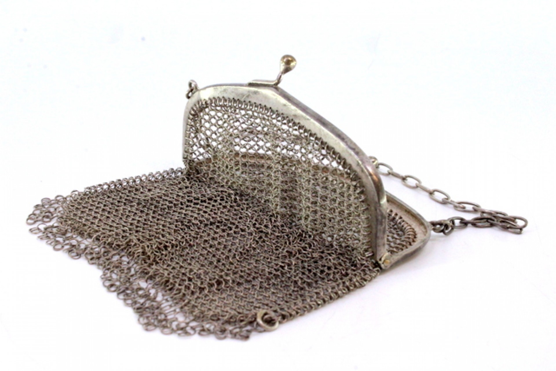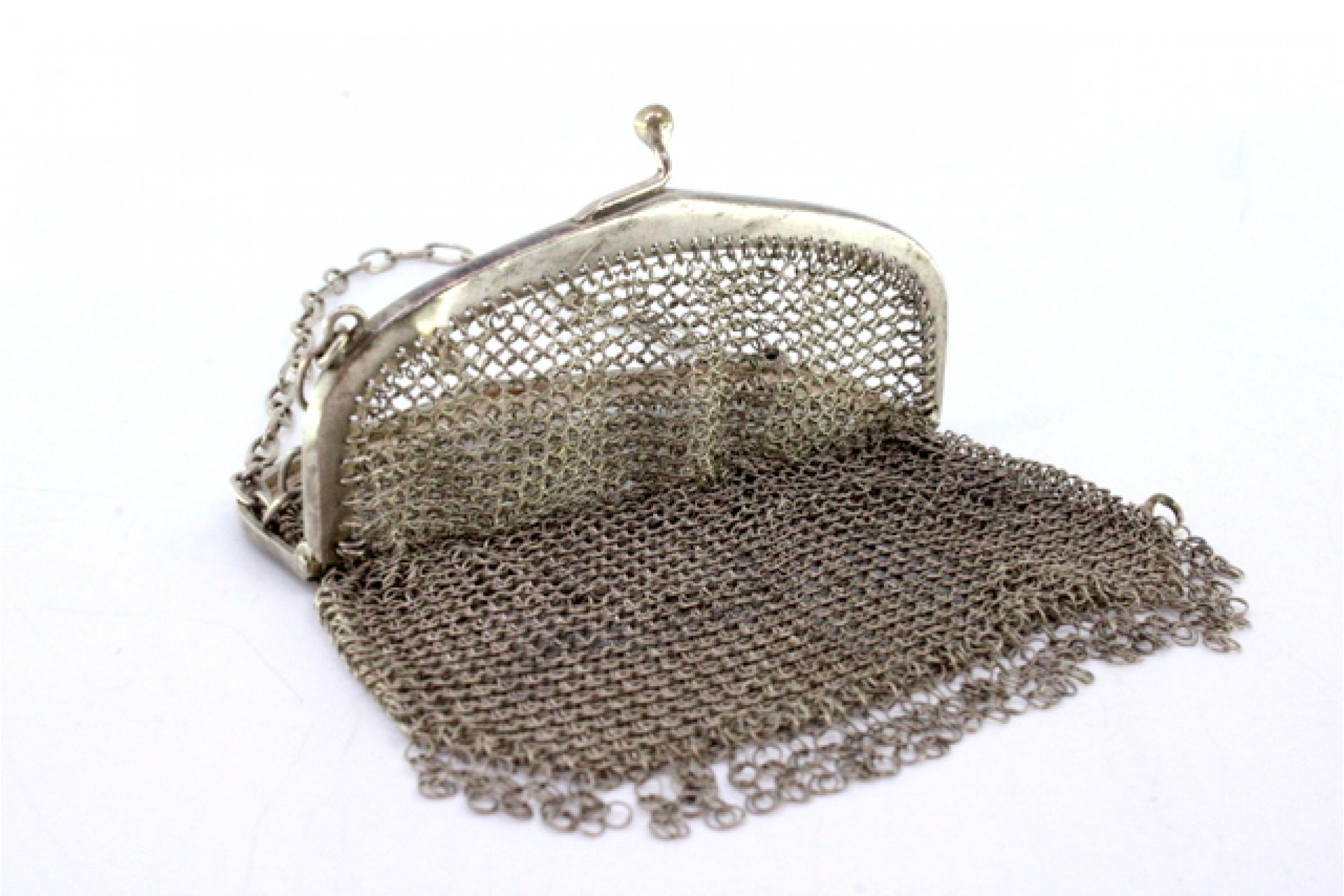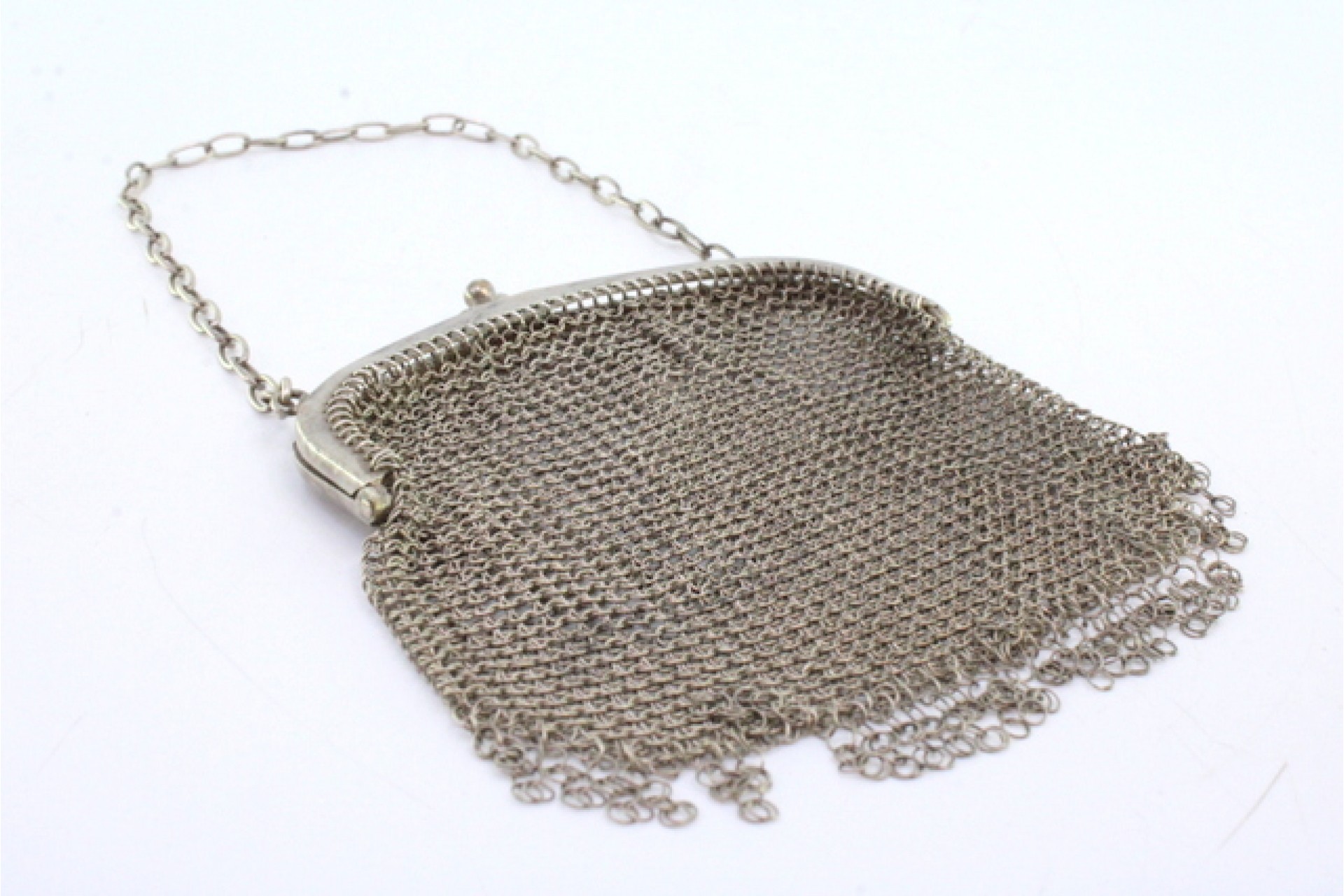 • Descrição: Bolsa de mão em malha de prata com franjas e corrente em malha cadeado.