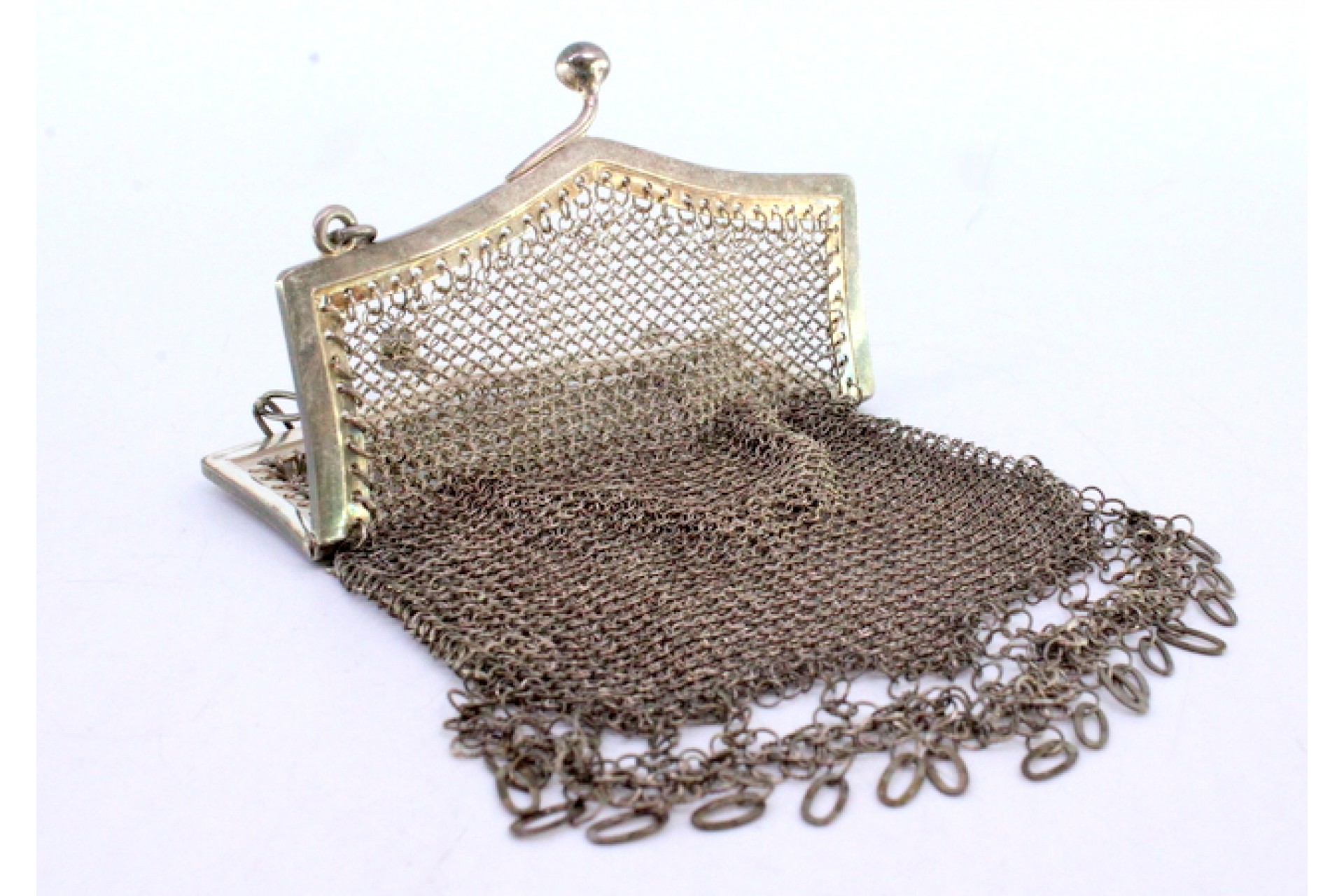 • Descrição: Bolsa de mão pequena em malha de prata com franjas suspensas e corrente em malha cadeado.