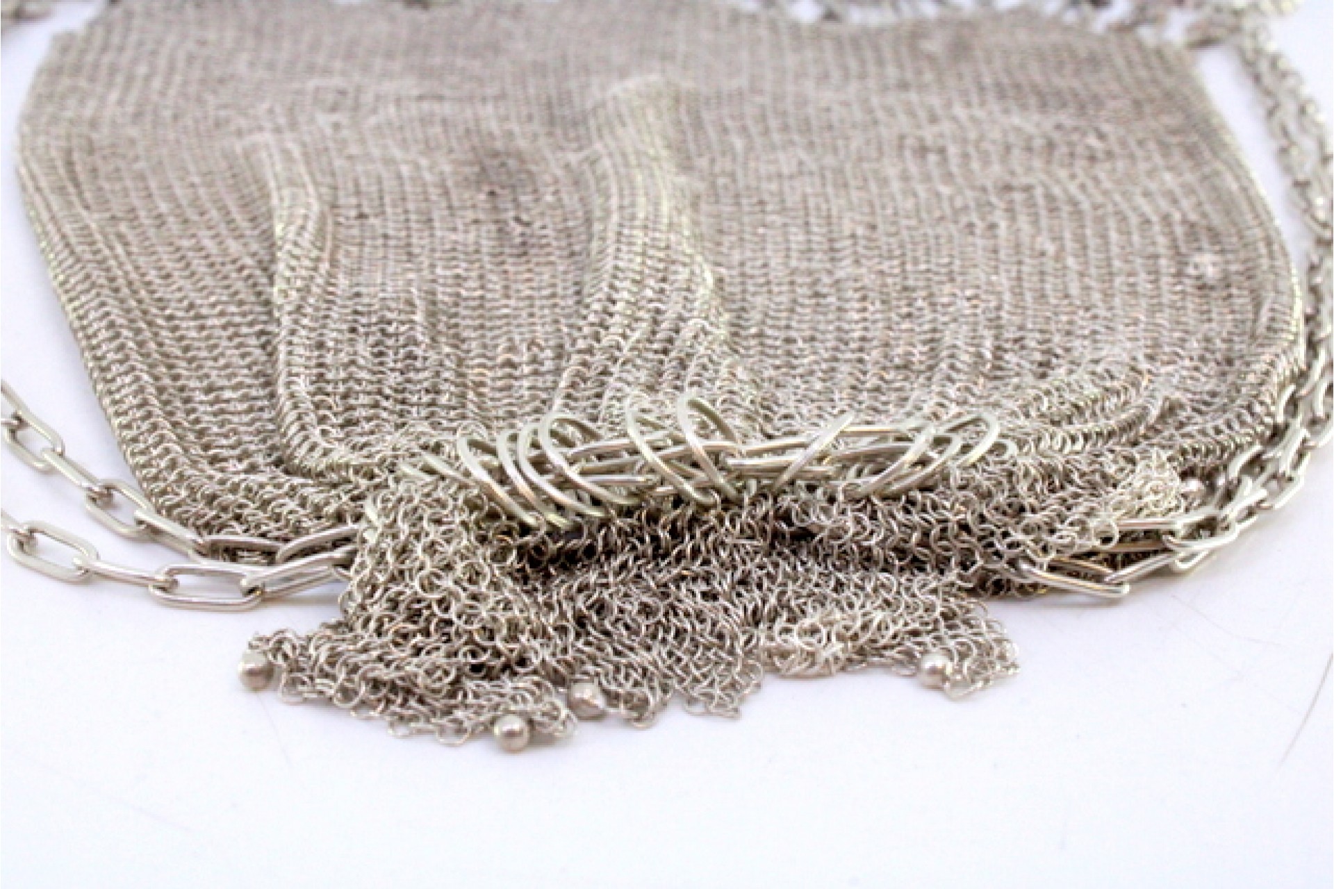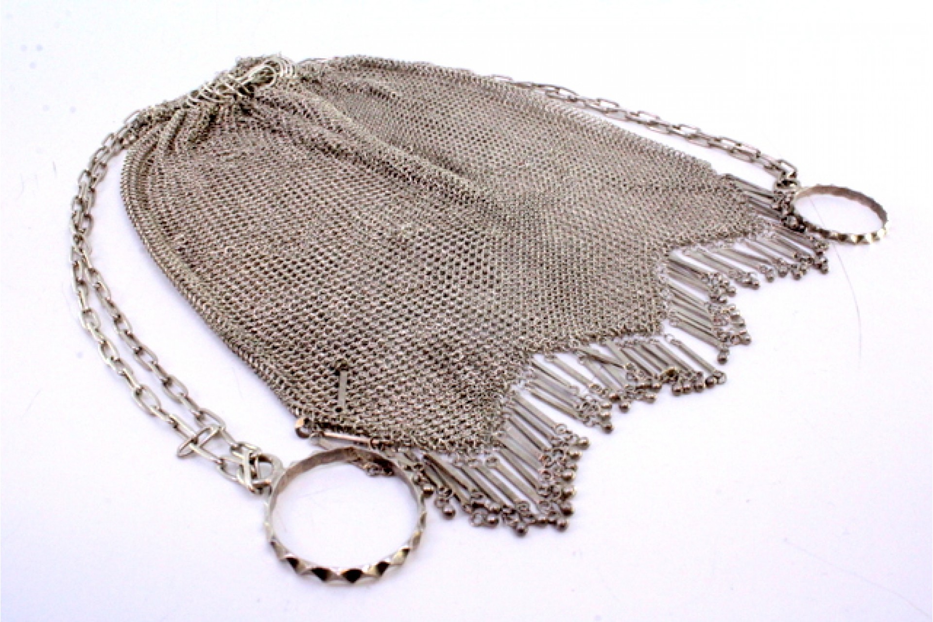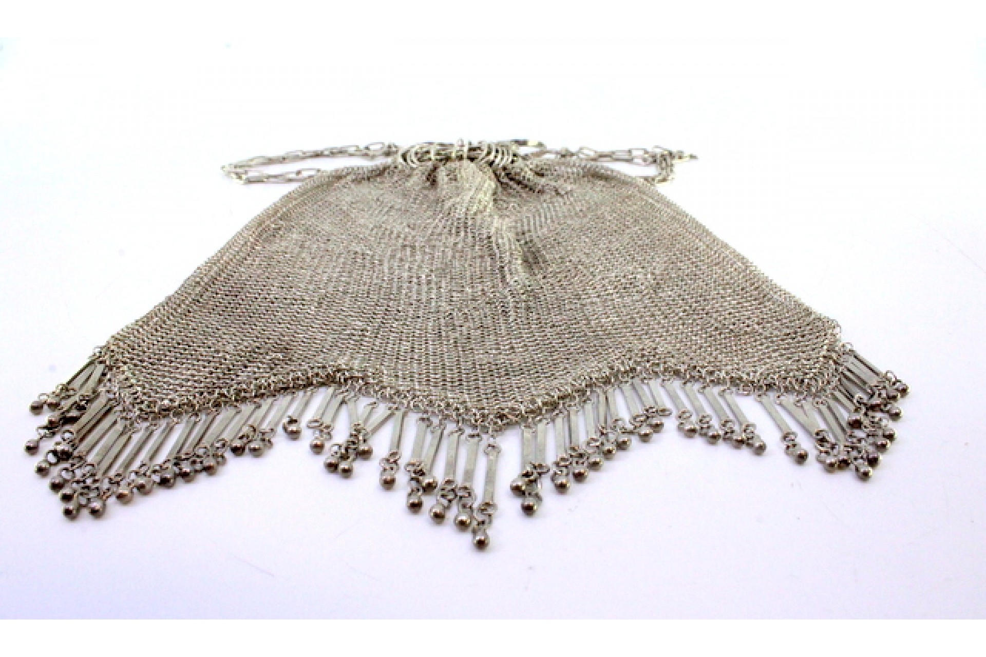 • Descrição: Bolsa de mão tipo saco em malha de prata com franjas, bolas suspensas e corrente em malha cadeado.
