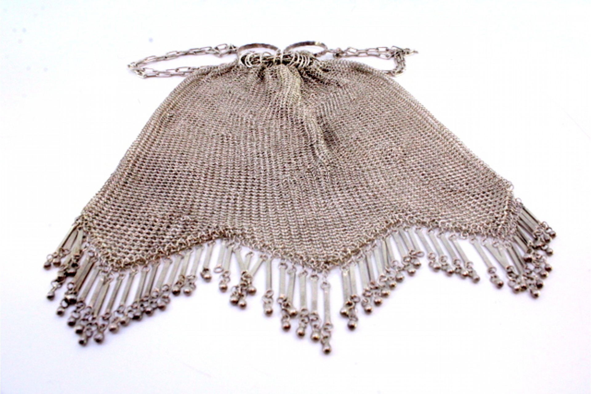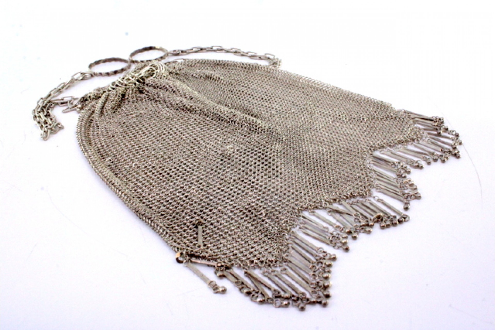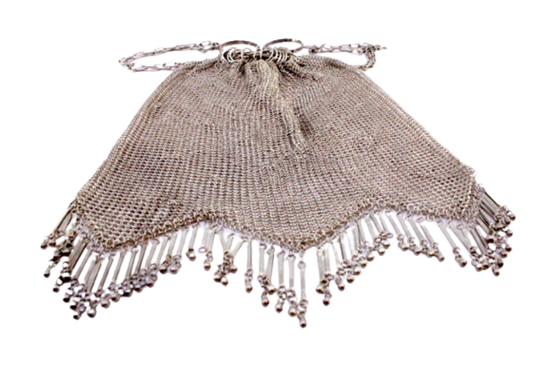 • Descrição: Bolsa de mão tipo saco em malha de prata com franjas, bolas suspensas e corrente em malha cadeado.