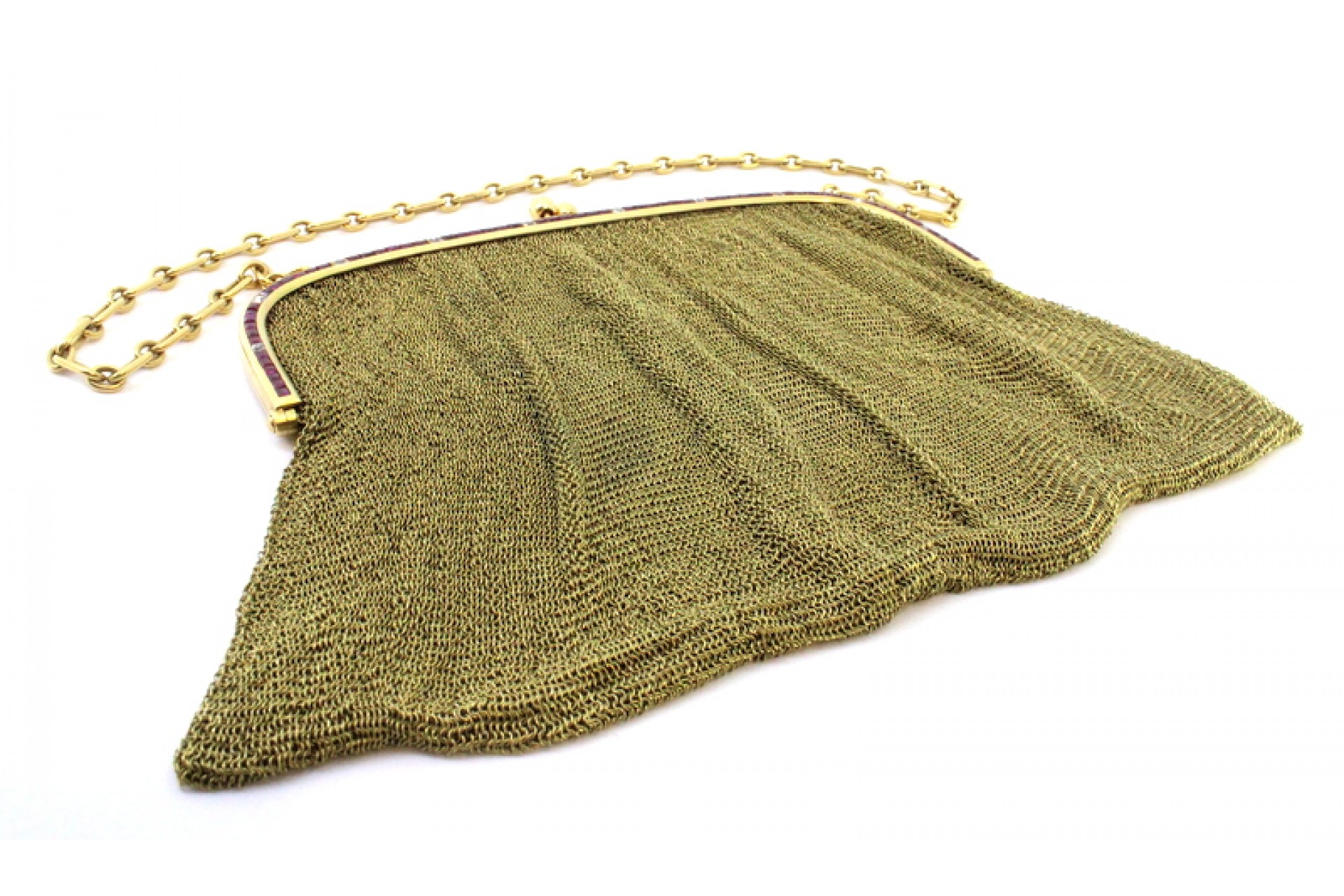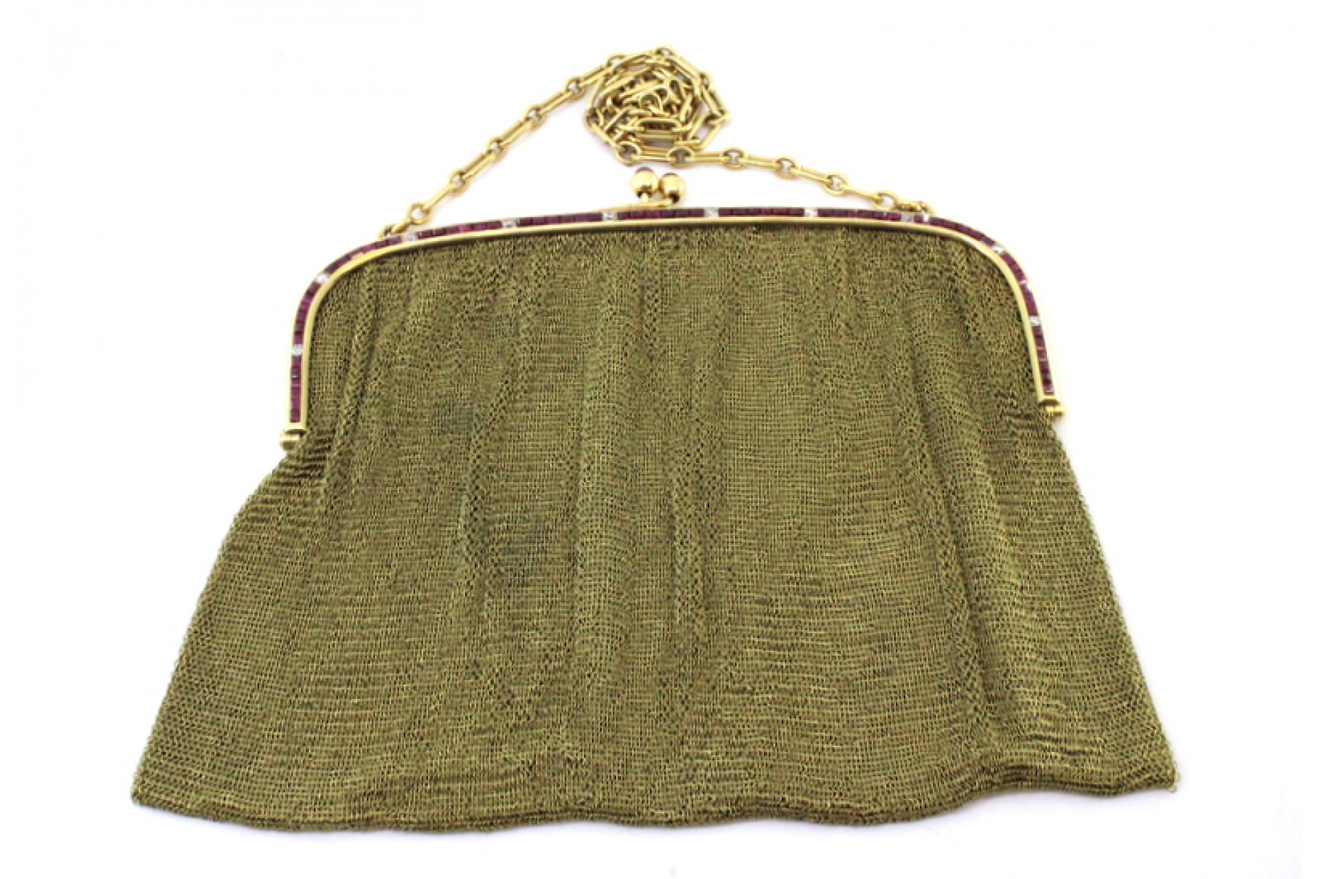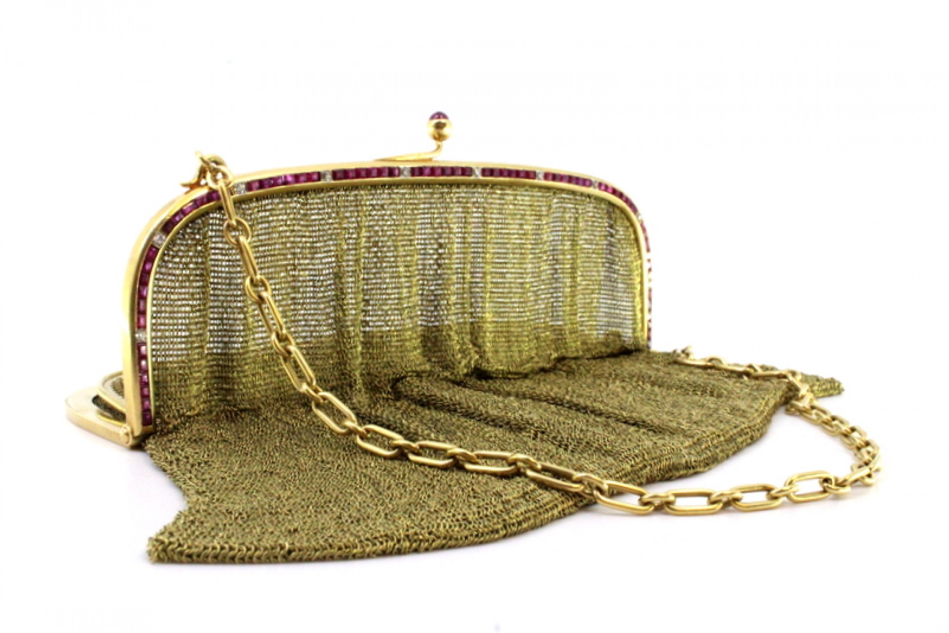 • Descrição: Bolsa em malha de ouro com rubis calibrados e diamantes em talhe brilhante no arco, interior com duas divisórias e corrente em malha cadeado.