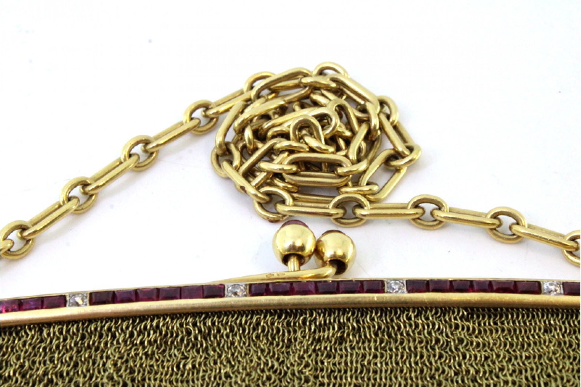 Bolsa em malha de ouro com rubis calibrados e diamantes em talhe brilhante