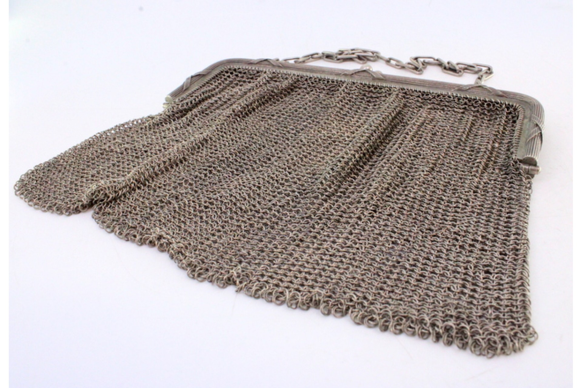 • Descrição: Bolsa de mão em malha de prata com arco frisado e relevado, corrente em forma cadeado.