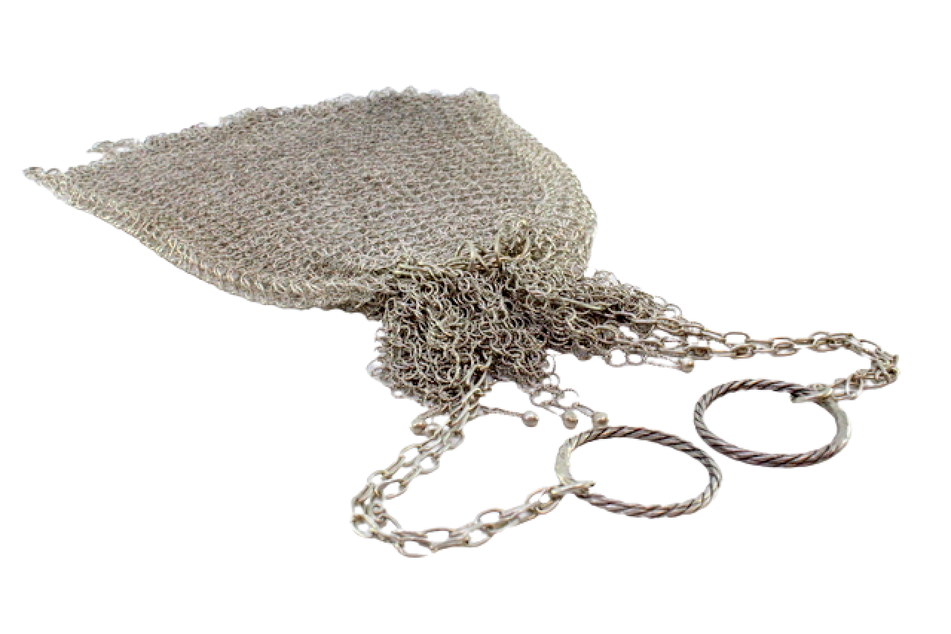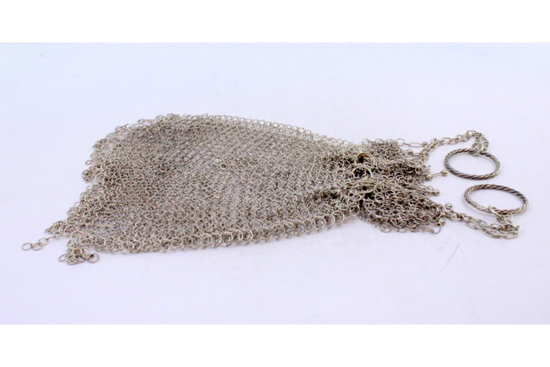 • Descrição: Bolsa de mão tipo saco em malha de prata com franjas suspensas e corrente em malha cadeado.