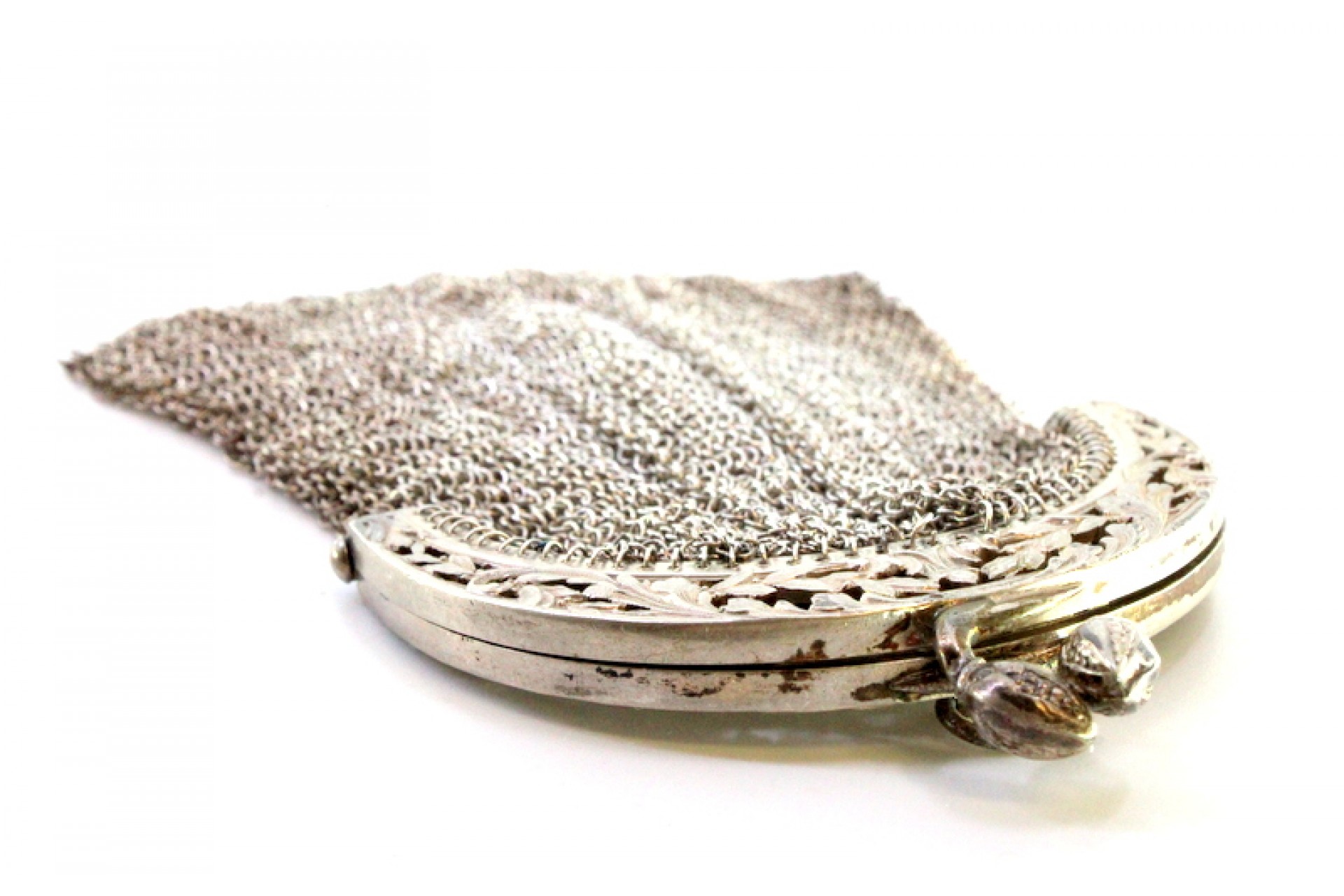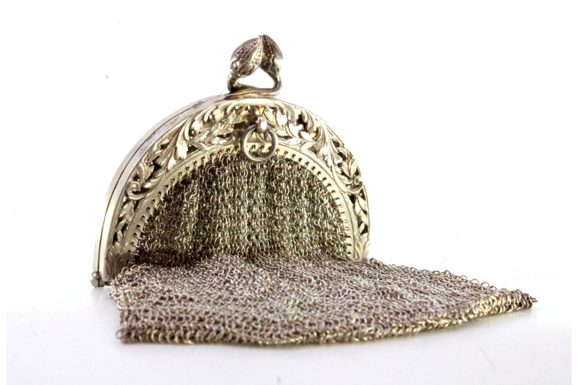 • Descrição: Bolsa porta moedas em malha de prata com duas divisórias, relevo recortado no arco e argola de suspensão.