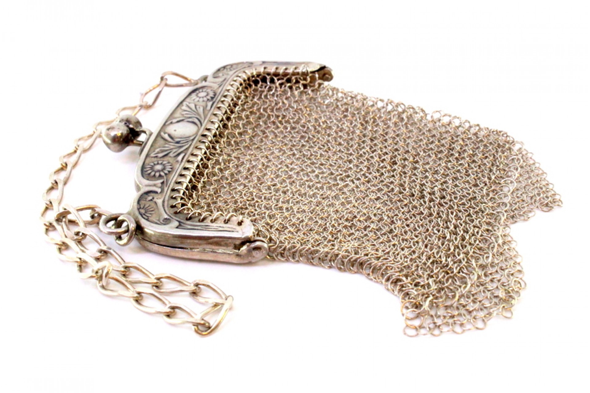 • Descrição: Bolsa porta moedas em prata com arco relevado, cadilhes suspensos e corrente em malha barbela batida.