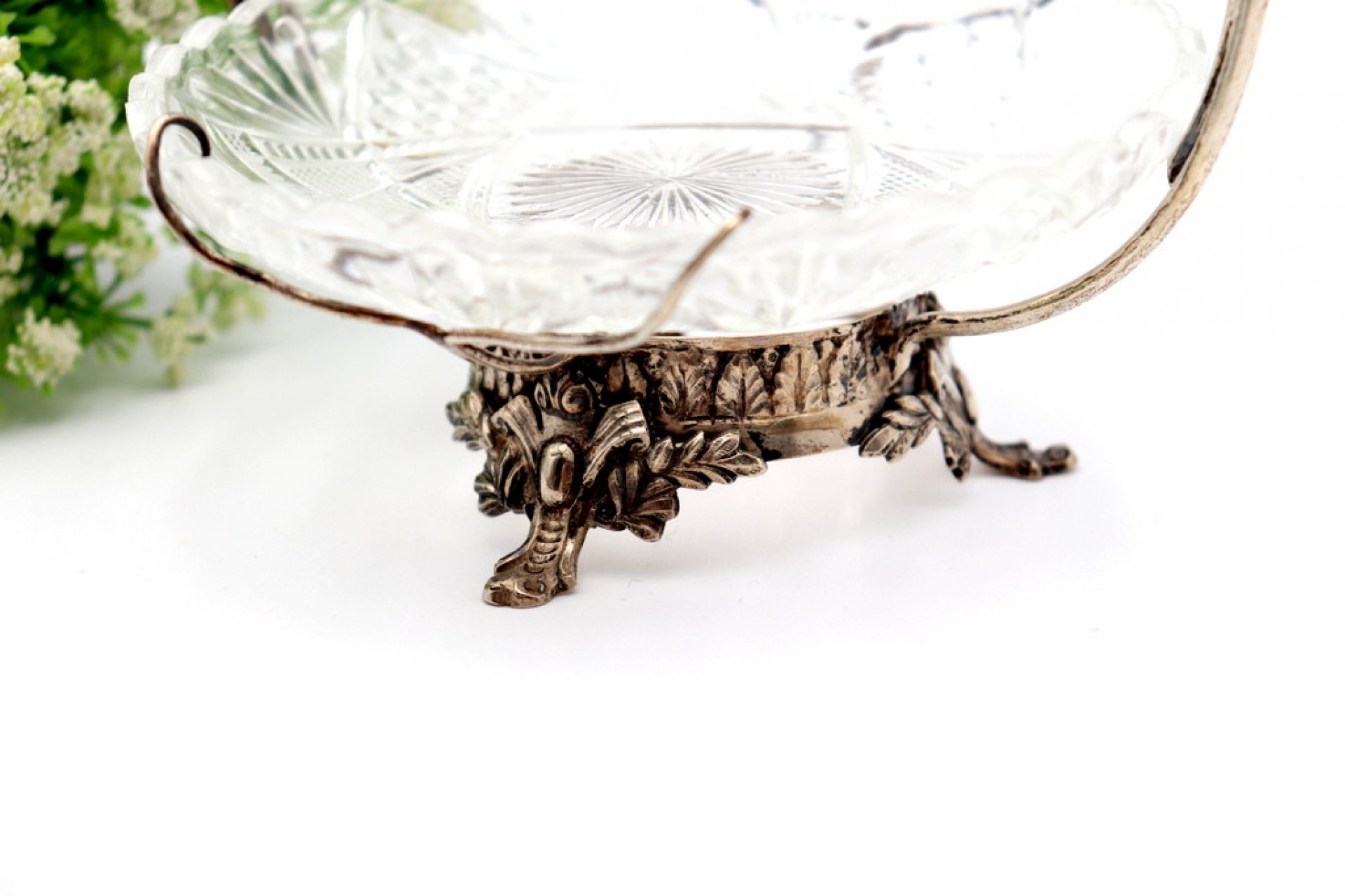 Bomboneira com estrutura em prata com alma em vidro lapidado e assente em três