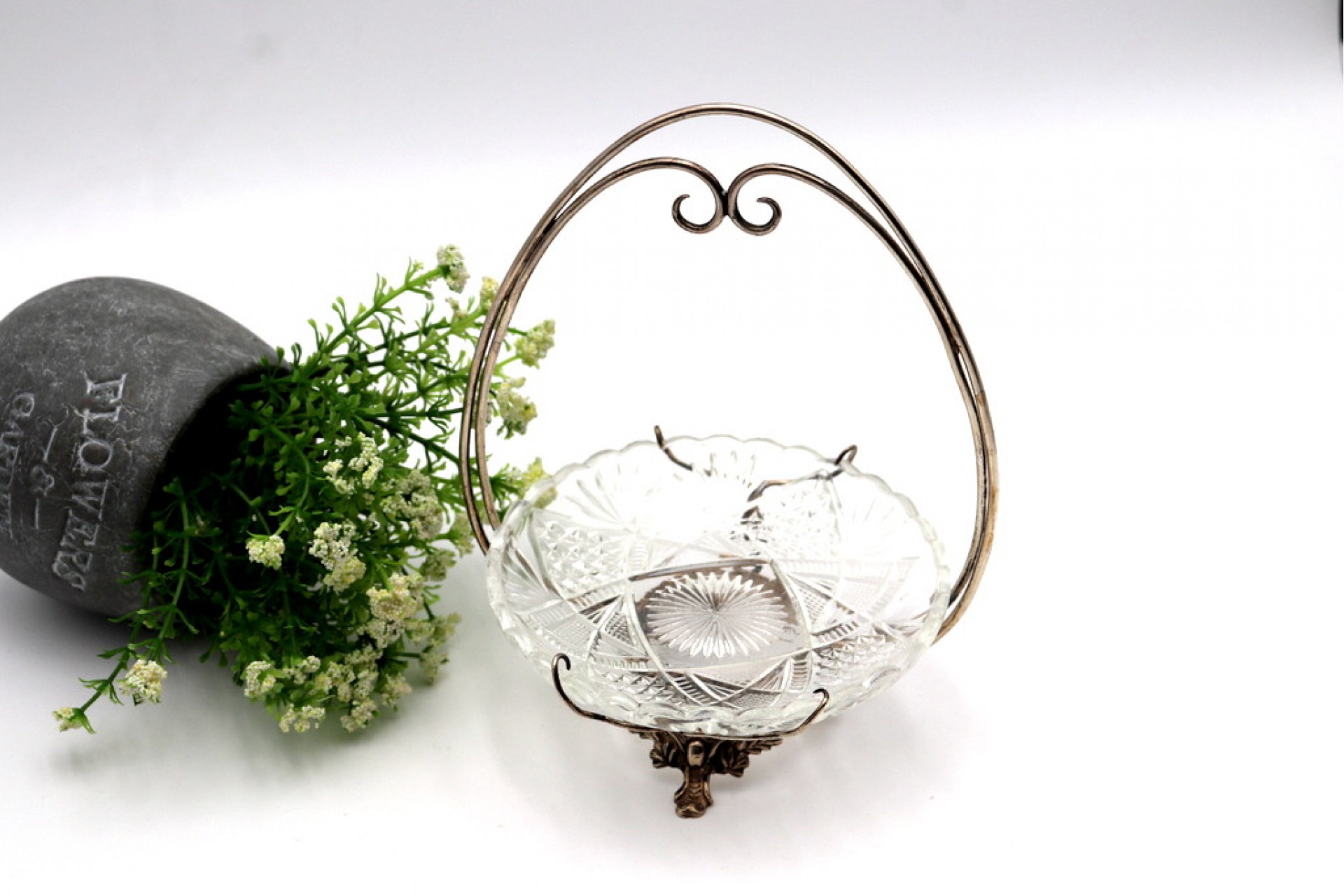 • Descrição:  Bomboneira com estrutura em prata com alma em vidro lapidado e assente em três.