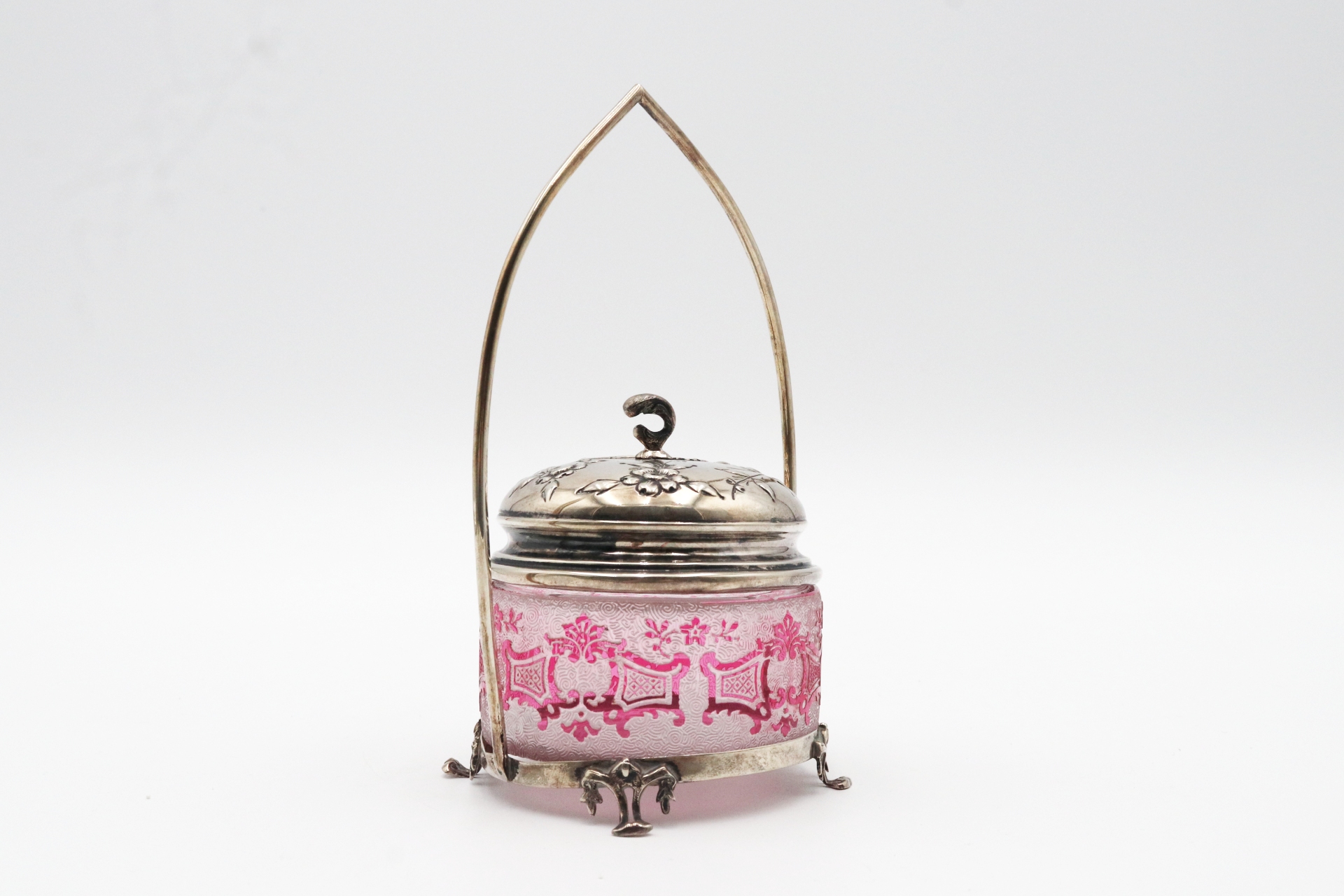 Compoteira com estrutura em prata com asa fixa, tampa amovivel com relevos e pomo, corpo em vidro gravado a ácido.