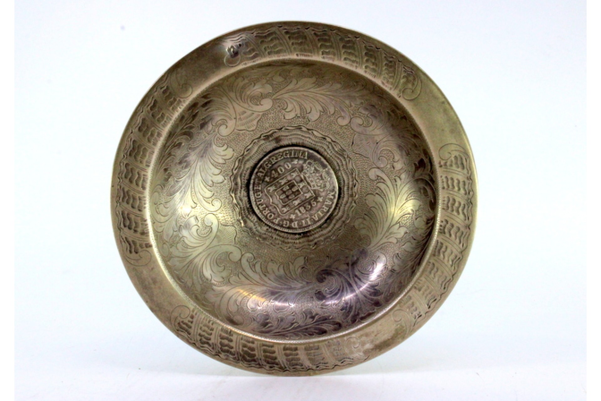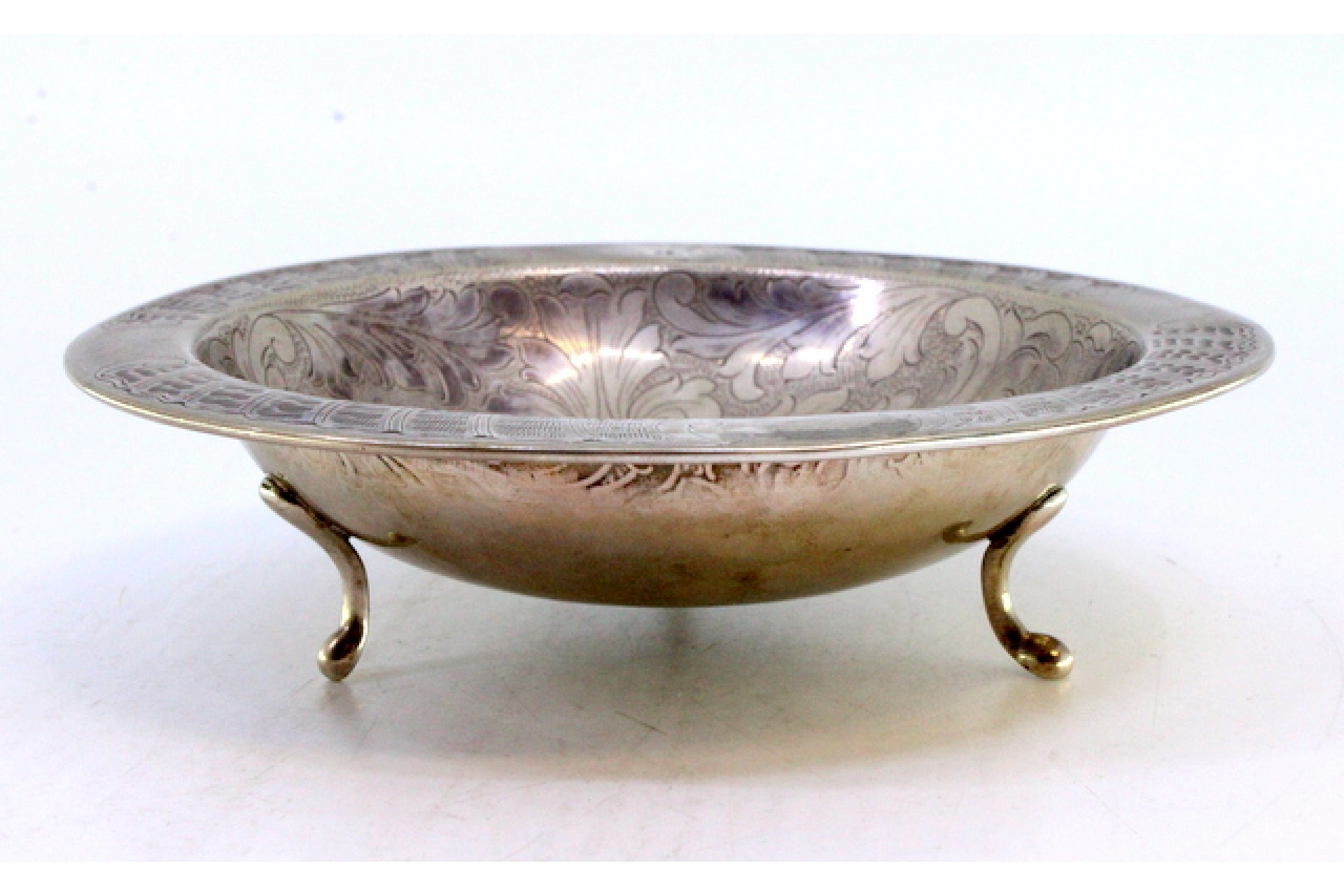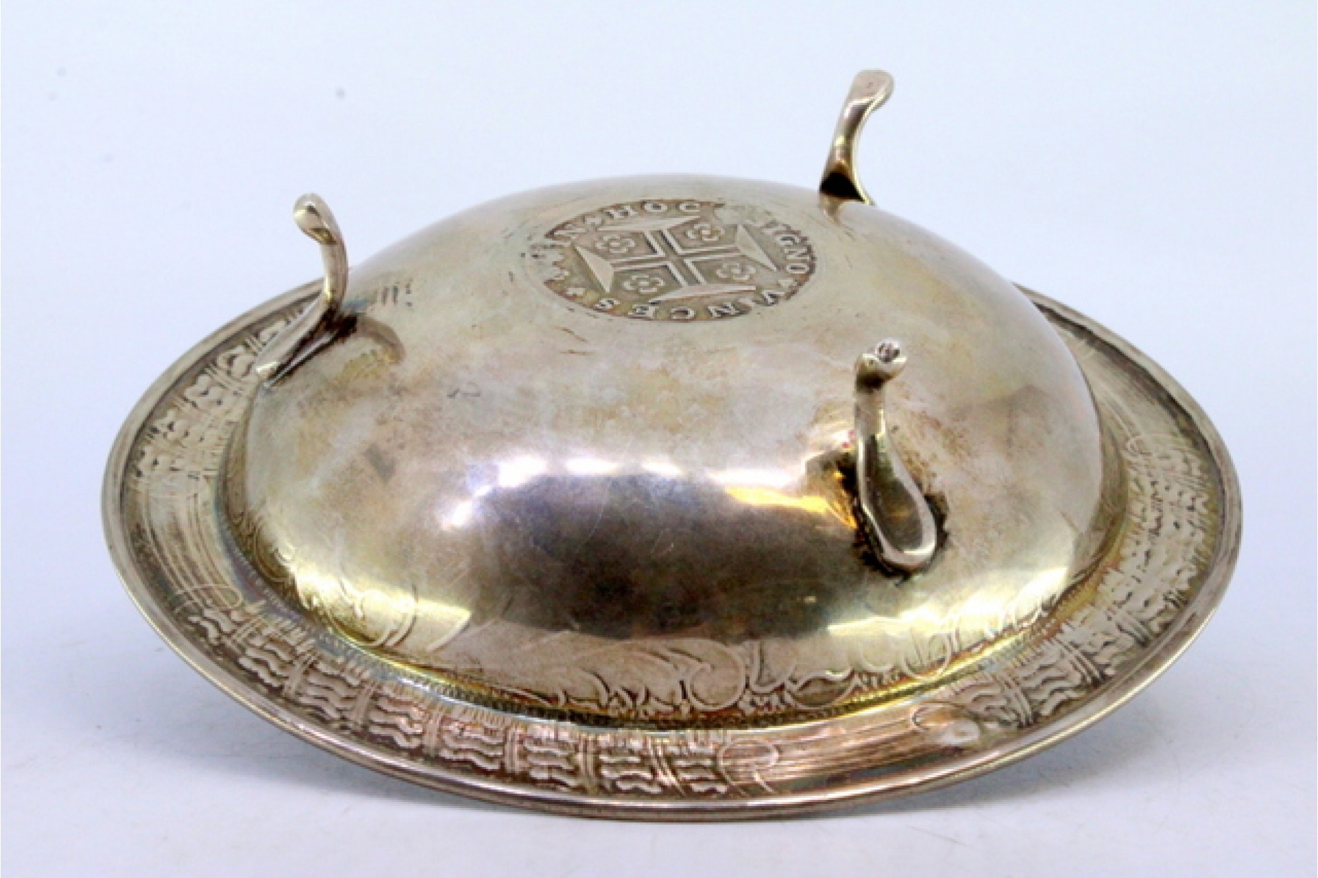 • Descrição: Bomboneira em prata com motivos florais gravados e moeda de 400 reis ao centro apoiada em três pés.