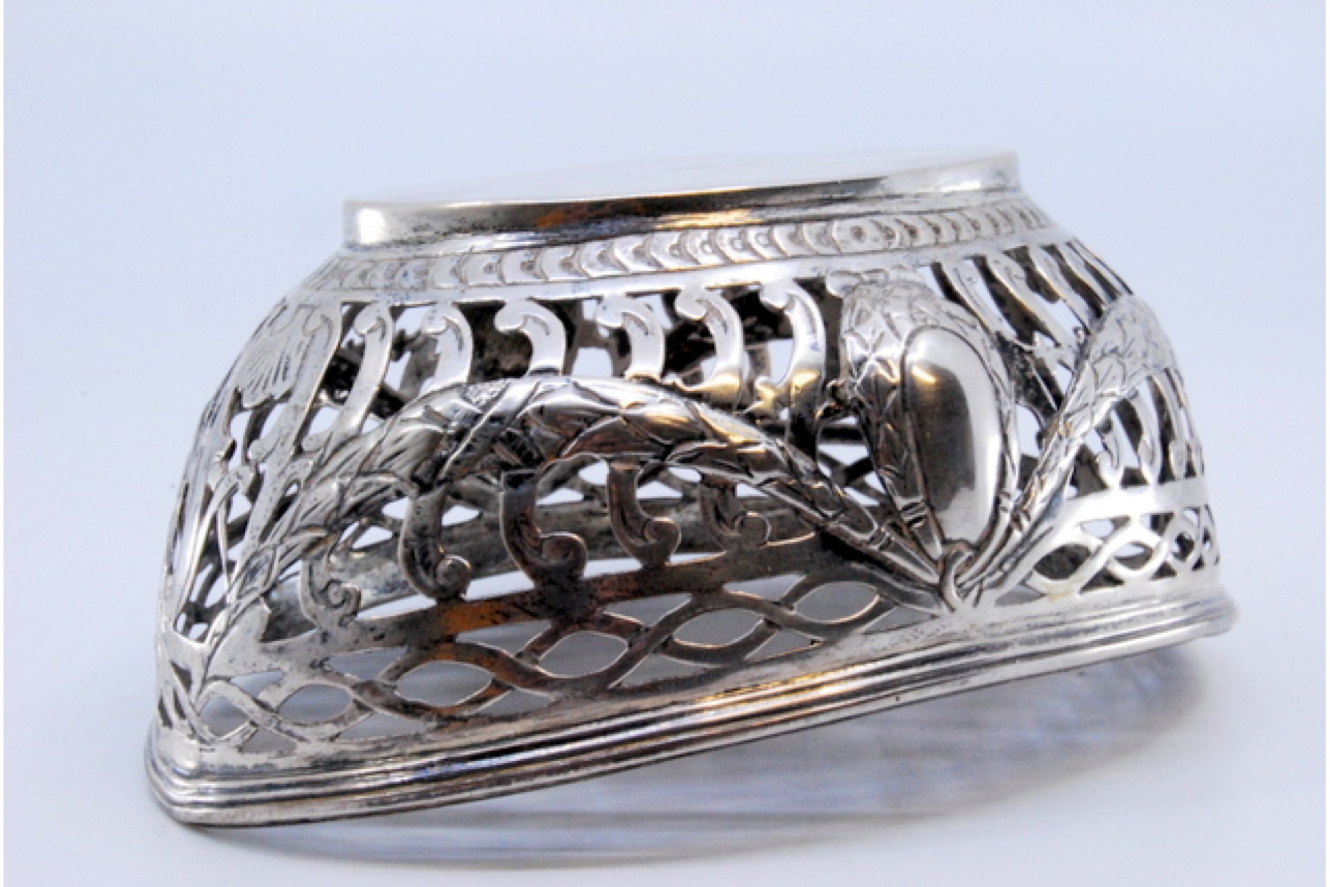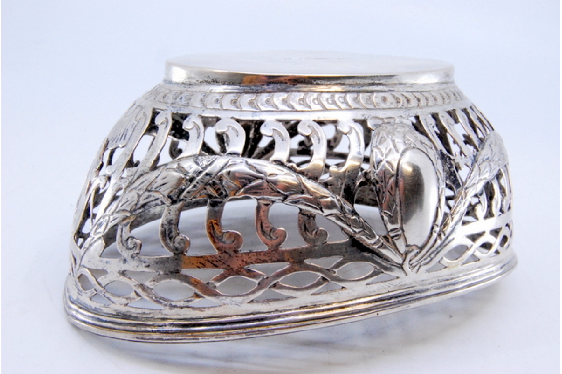 • Descrição: Bomboneira em prata recortada com decoração de grinaldas e frisada no bordo e base.
