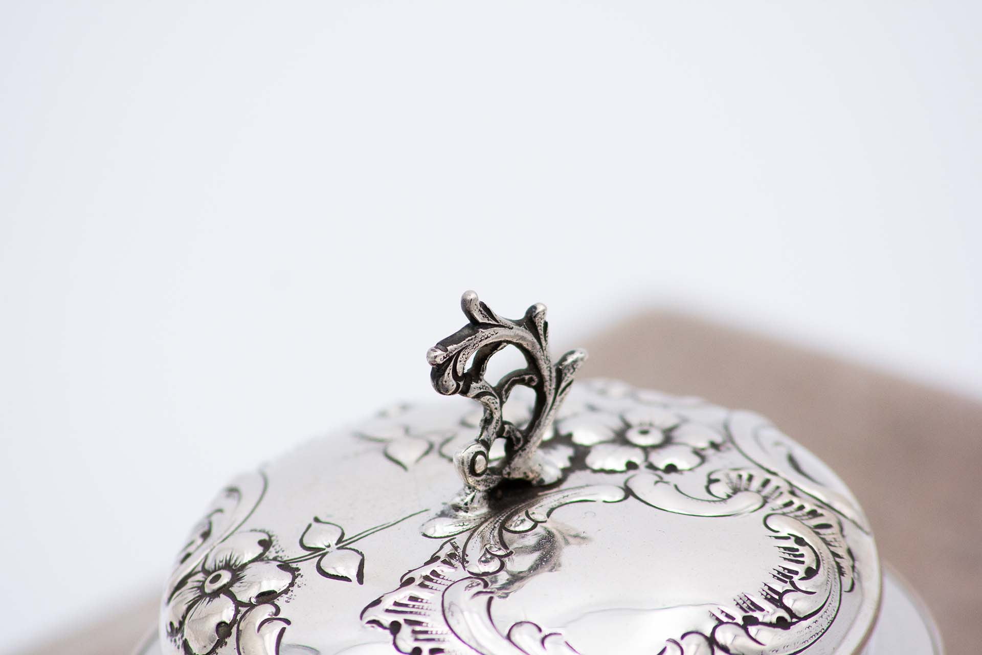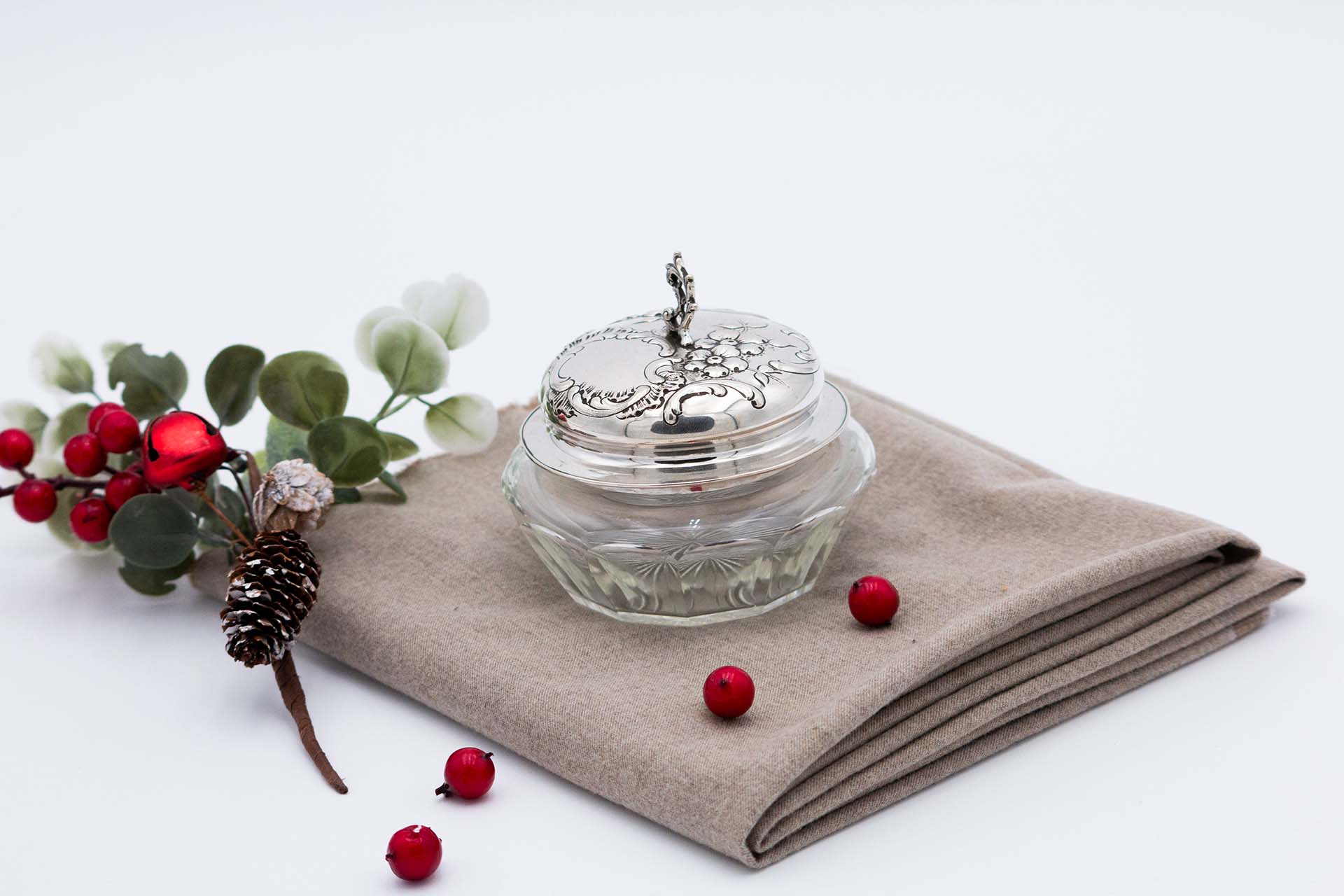 • Descrição: Bomboneira em vidro facetado com tampa em prata relevada com motivos florais e pomo recortado.