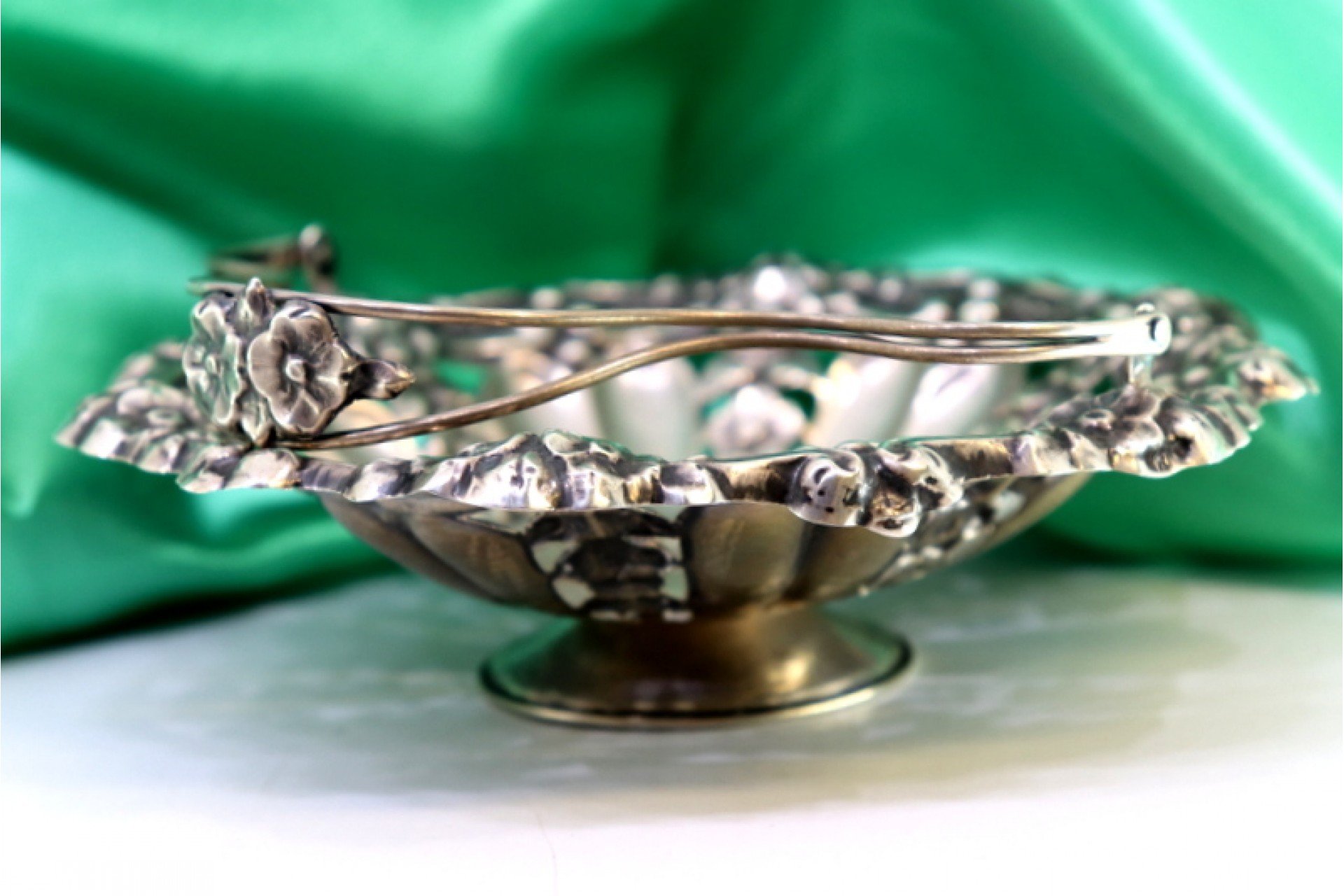 • Descrição: Bomboneira em prata recortada com relevos florais e pega basculante.