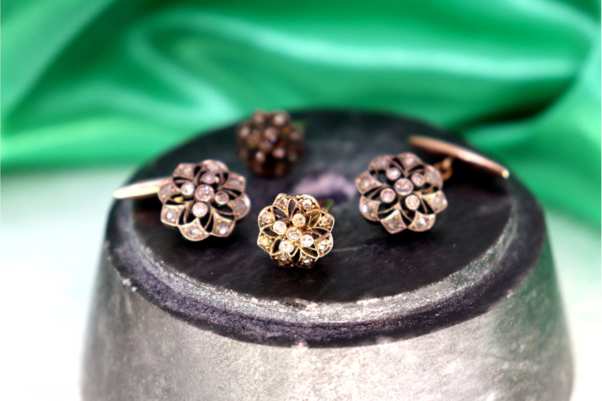• Descrição: Botões de punho e abotoaduras em ouro e prata com lascas de diamantes e diamantes (8/8)  em forma de flor.