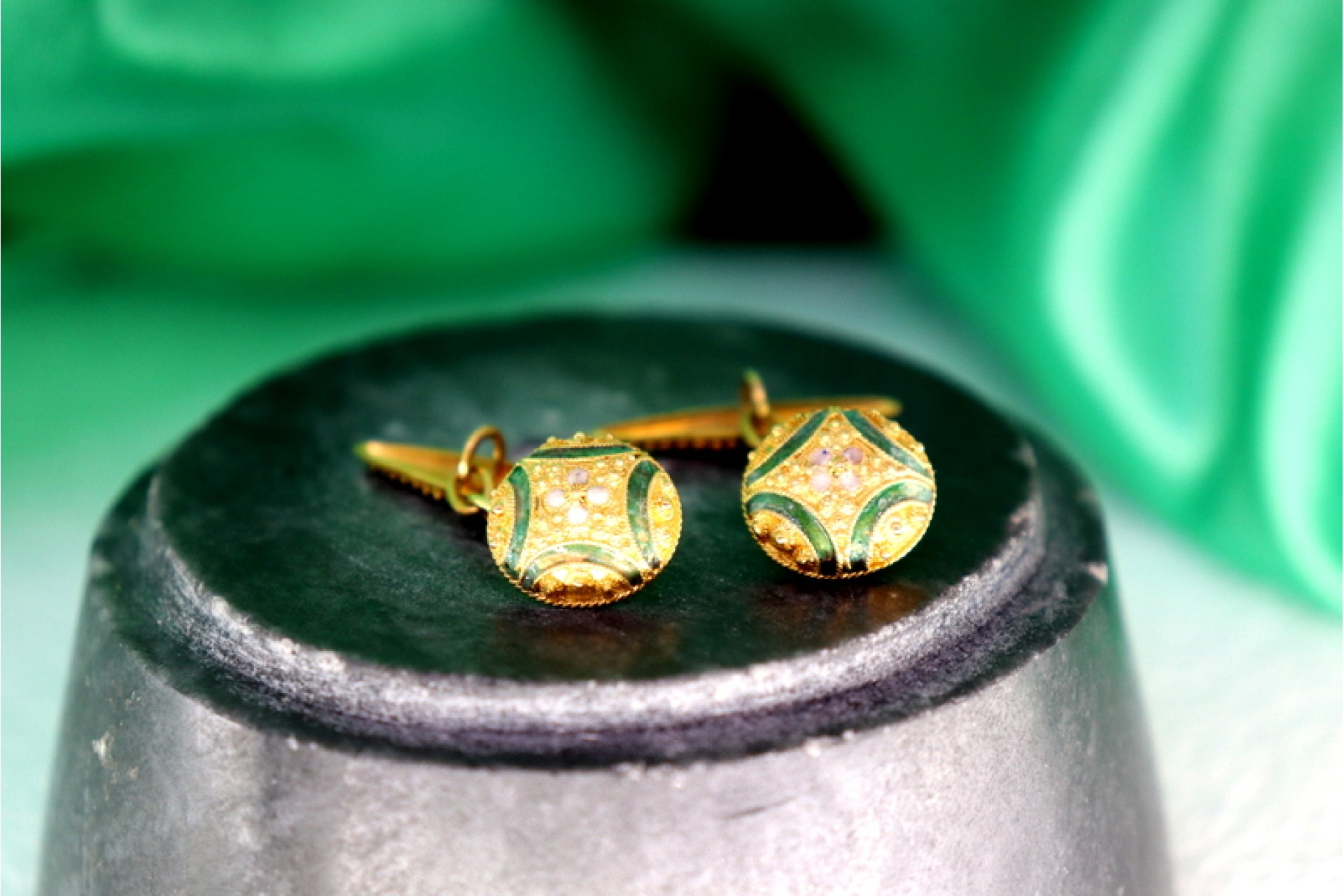 - Descrição: Botões de punho em ouro ao estilo caramujo com relevos esmaltados.