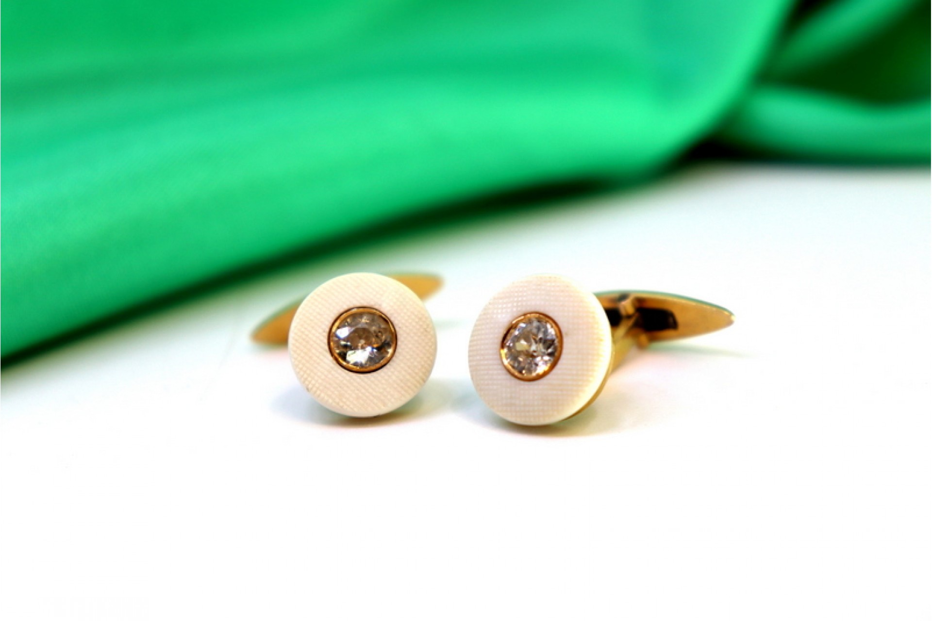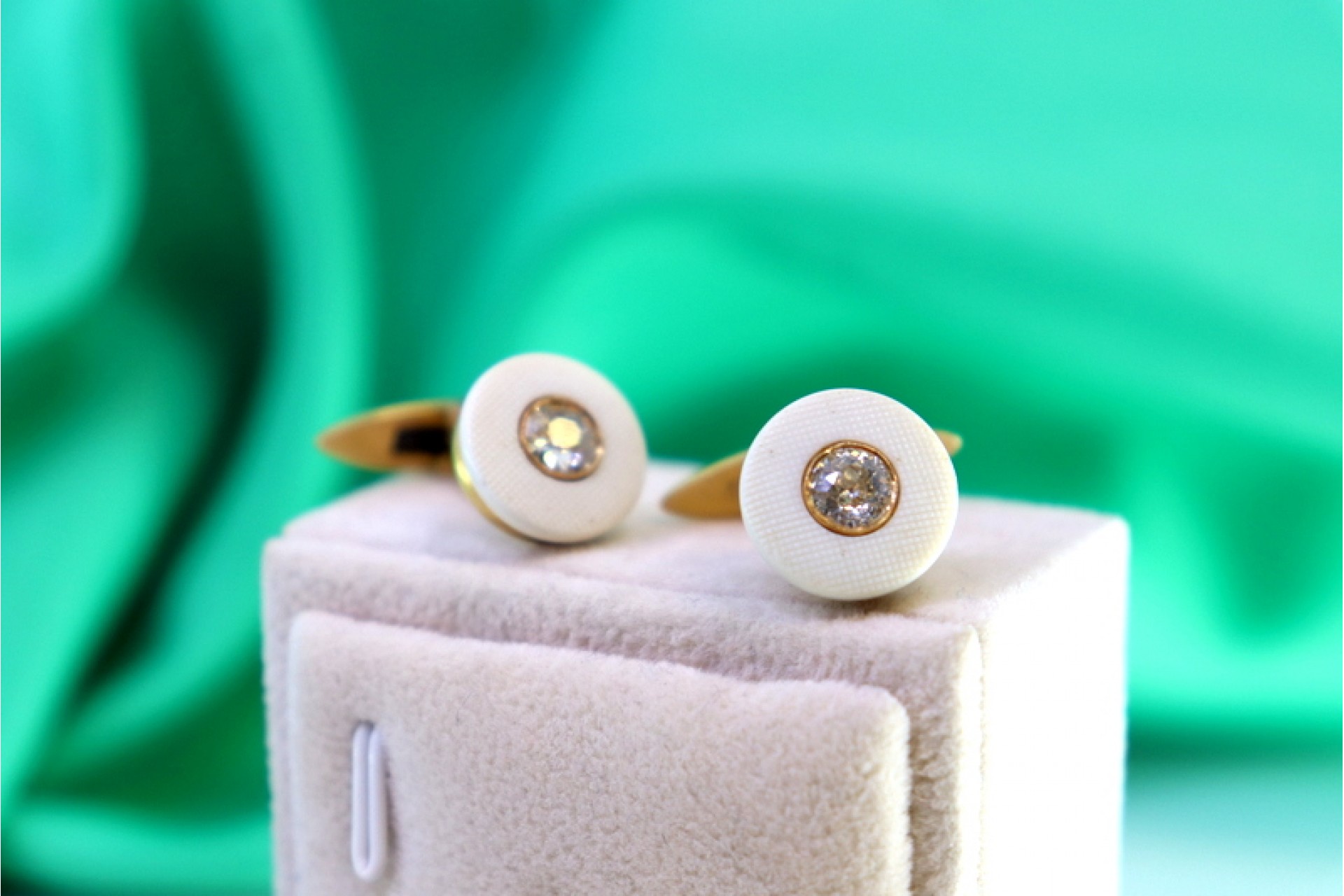 • Descrição: Botões de punho em ouro com aplicação de marfim e diamantes (2) em talhe brilhante antigo.