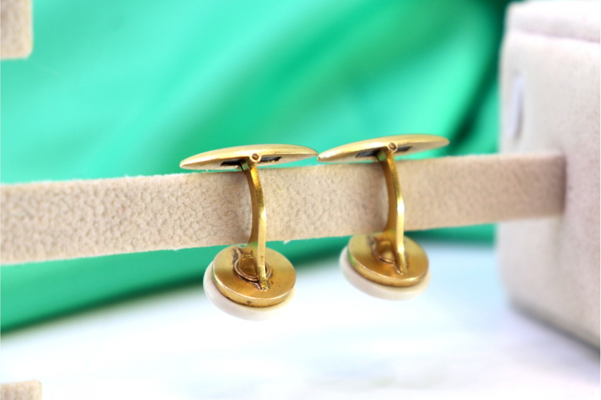 Botões de punho em ouro com aplicação de marfim e diamantes (2) em talhe brilhan
