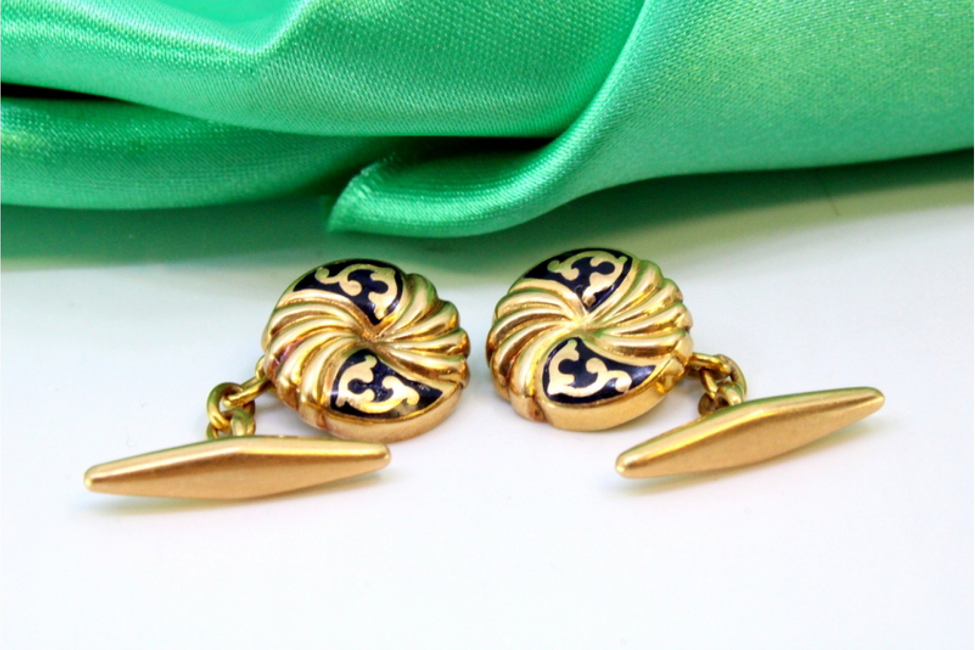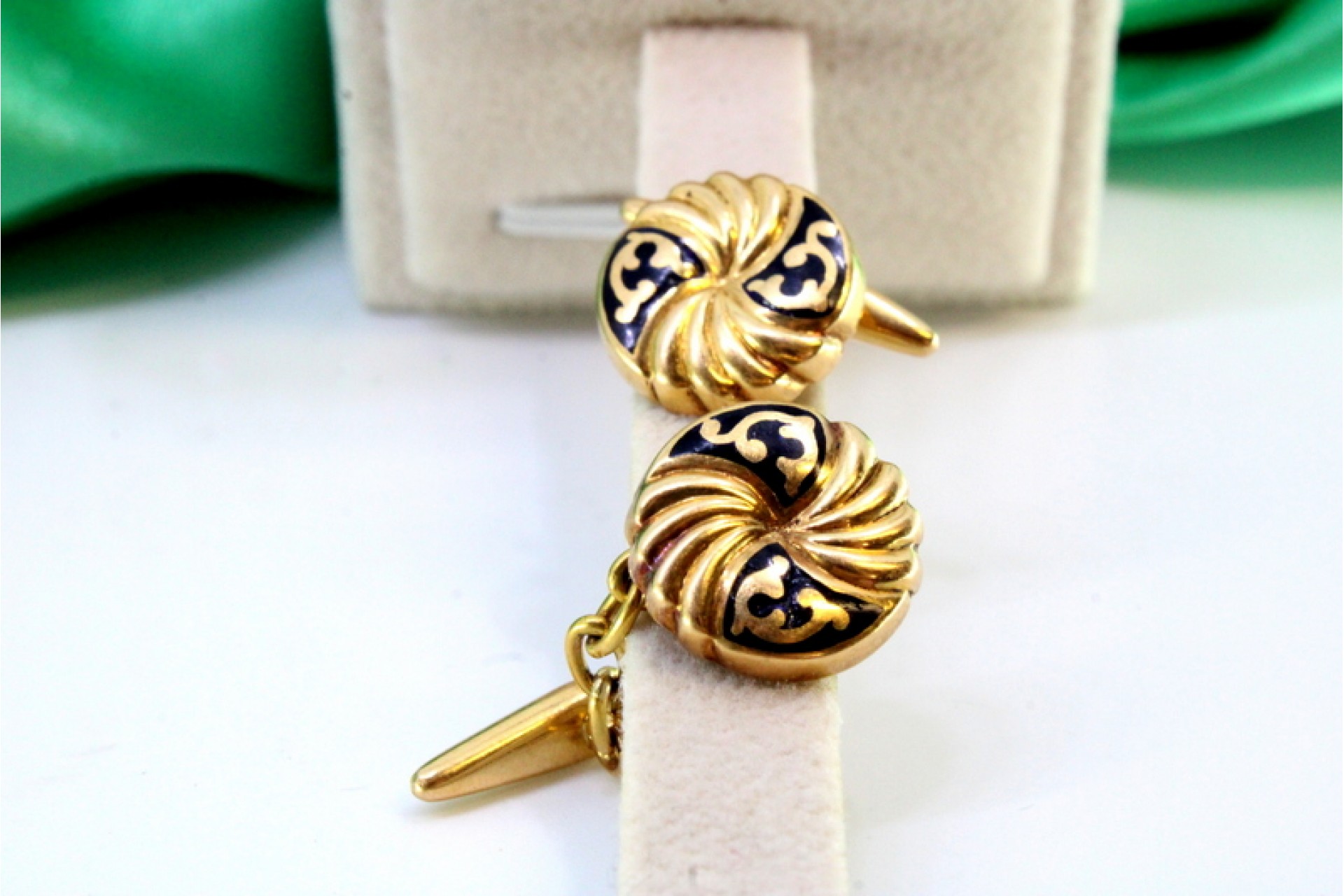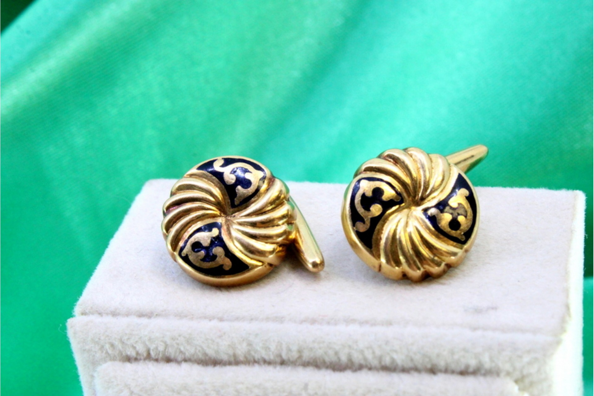 Botões de punho em ouro amarelo de formato botão com aplicações esmaltadas.