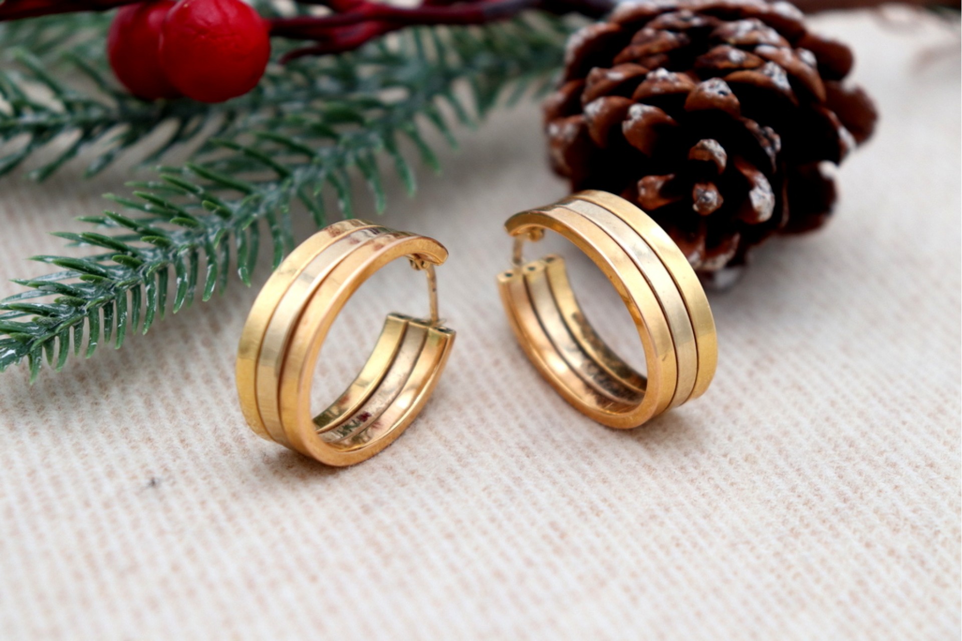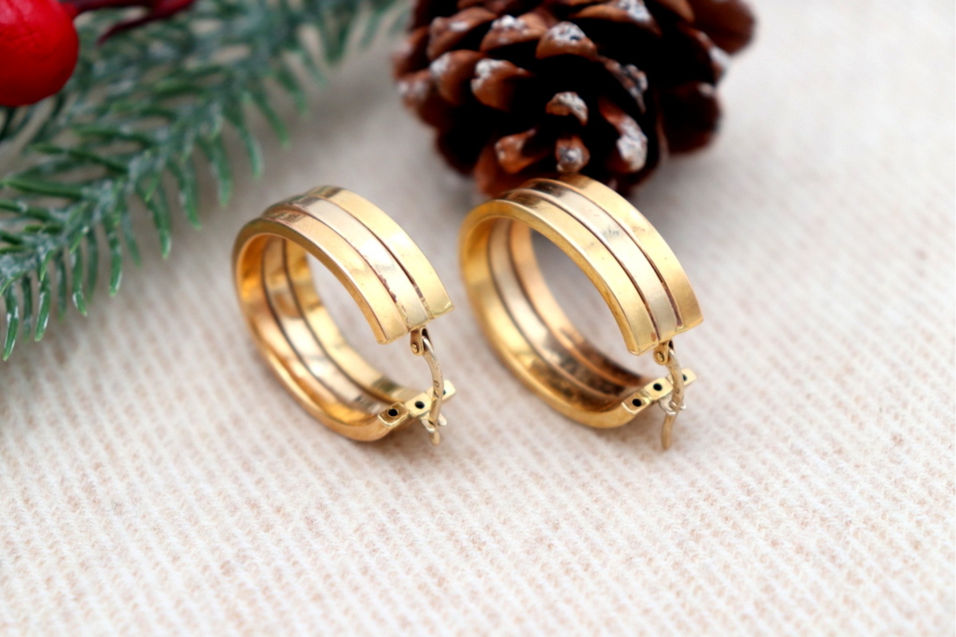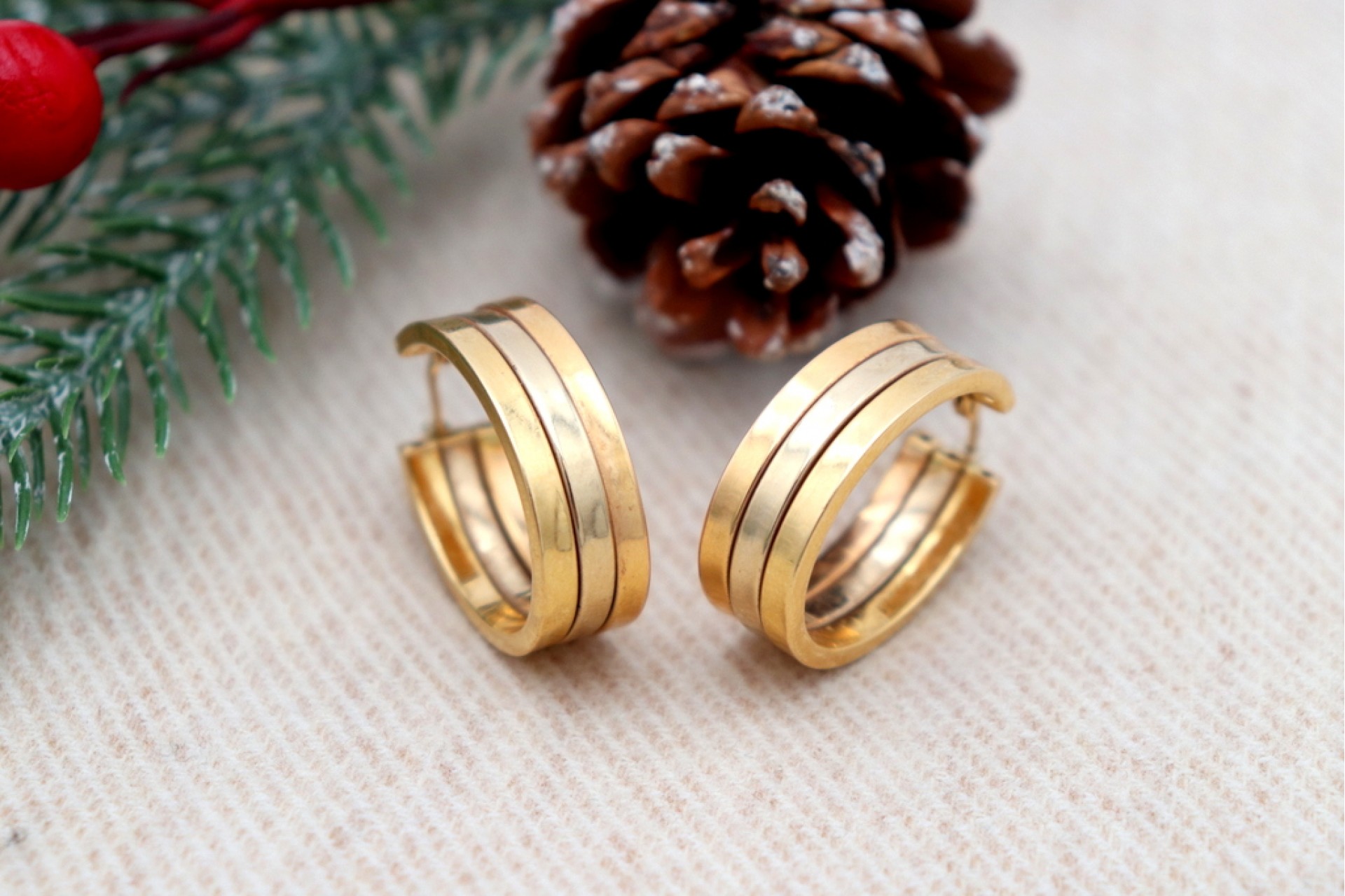 • Descrição: Brincos - argolas em ouro bicolor com três brandas e formato ovalizado.