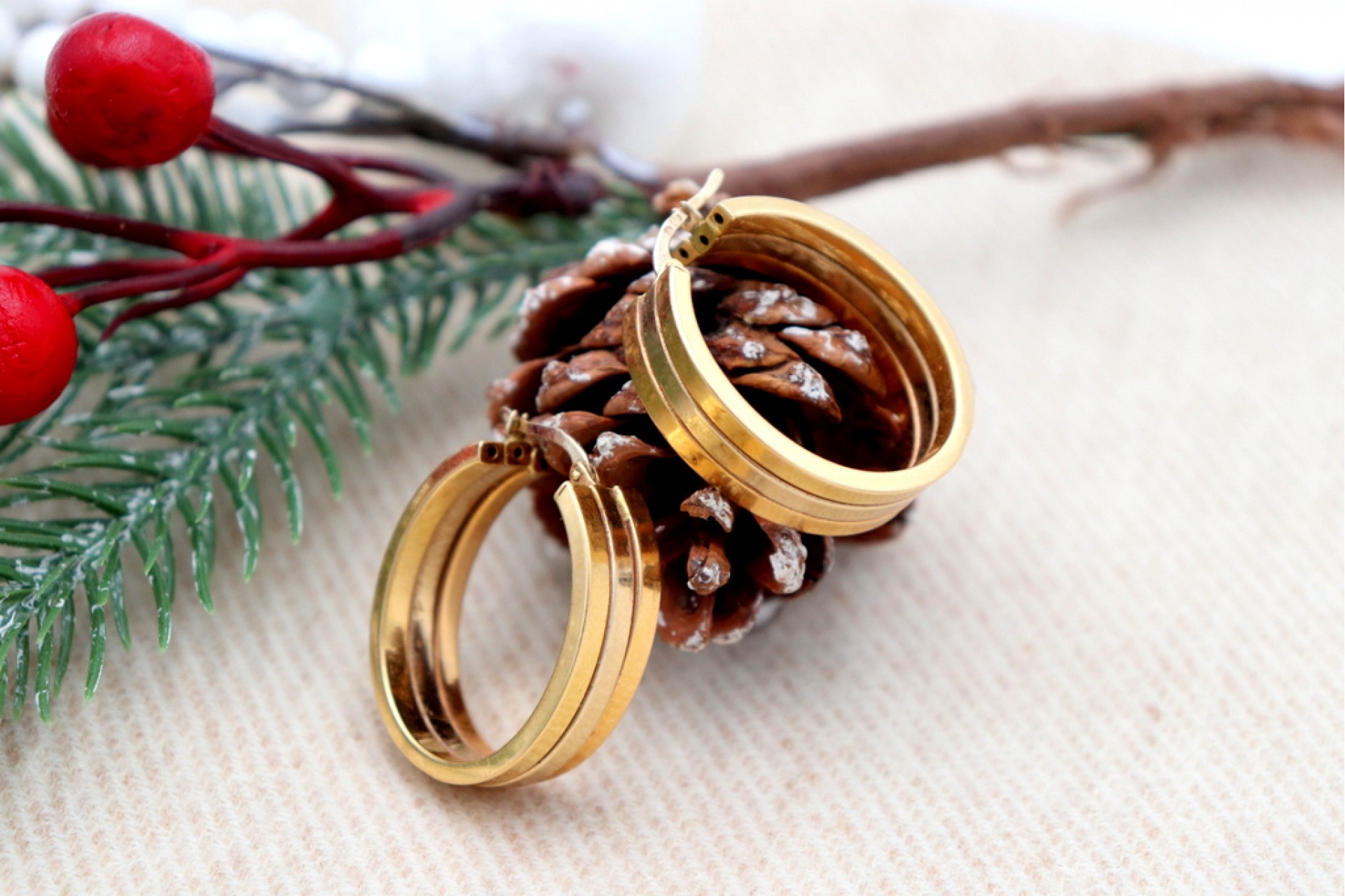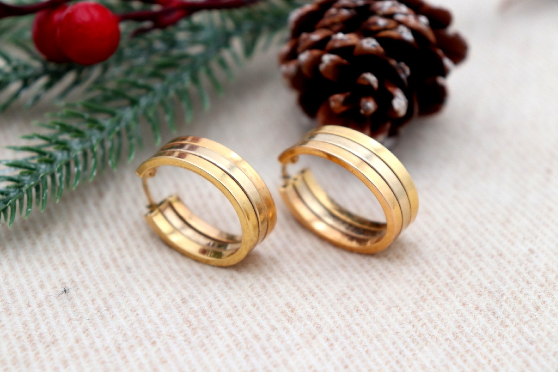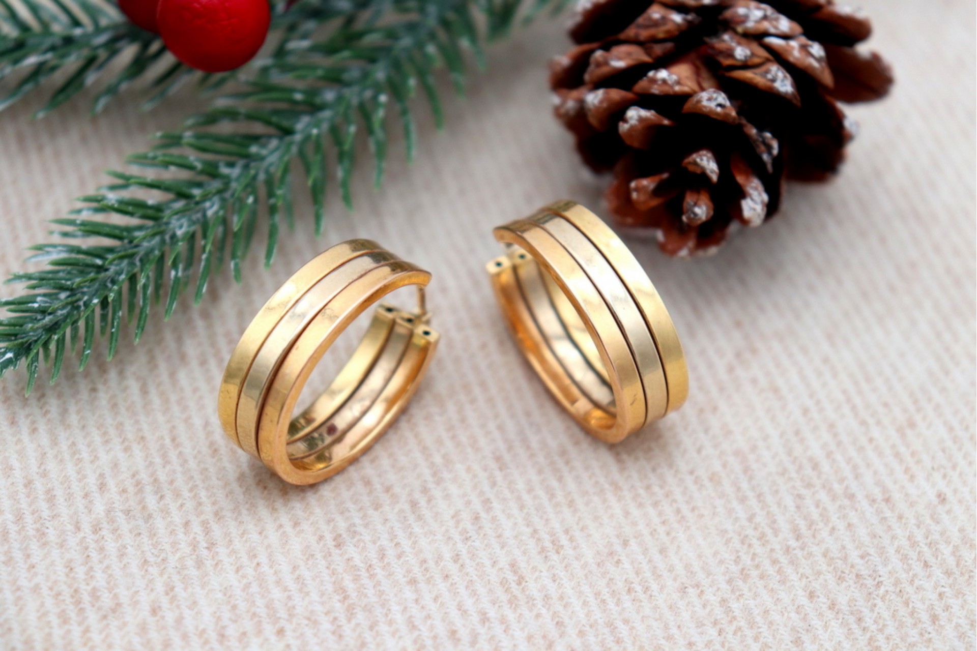 • Descrição: Brincos - argolas em ouro bicolor com três brandas e formato ovalizado.