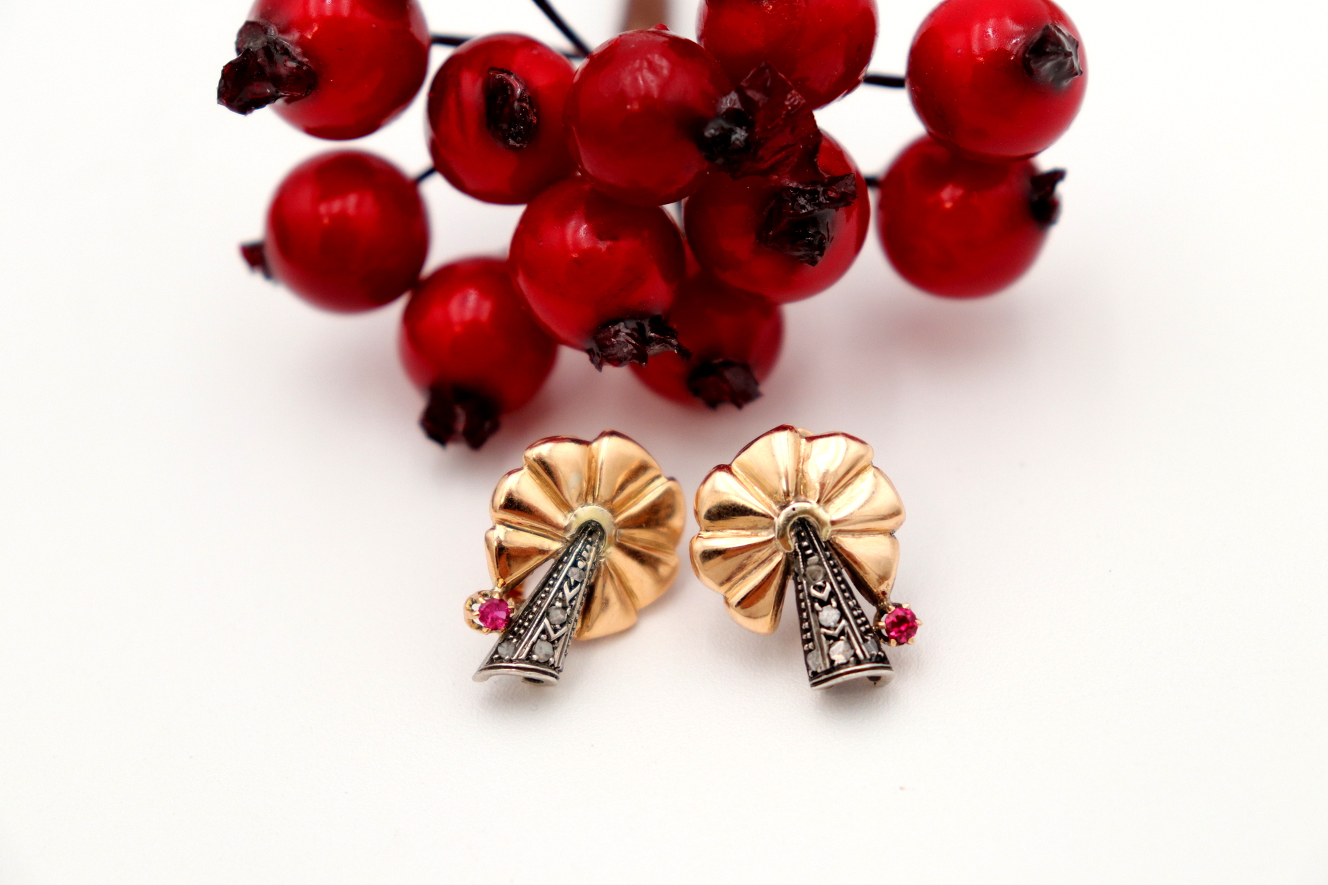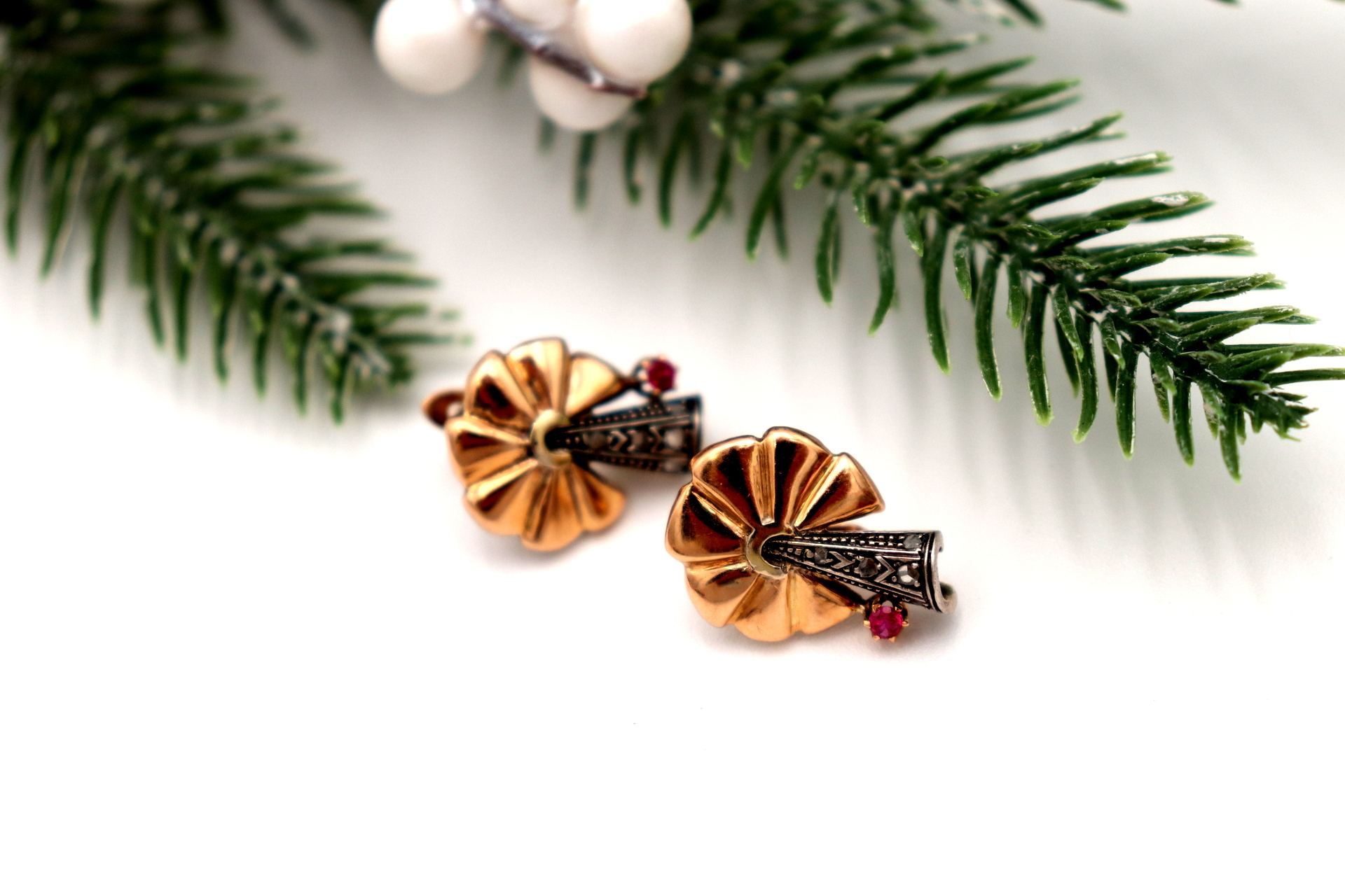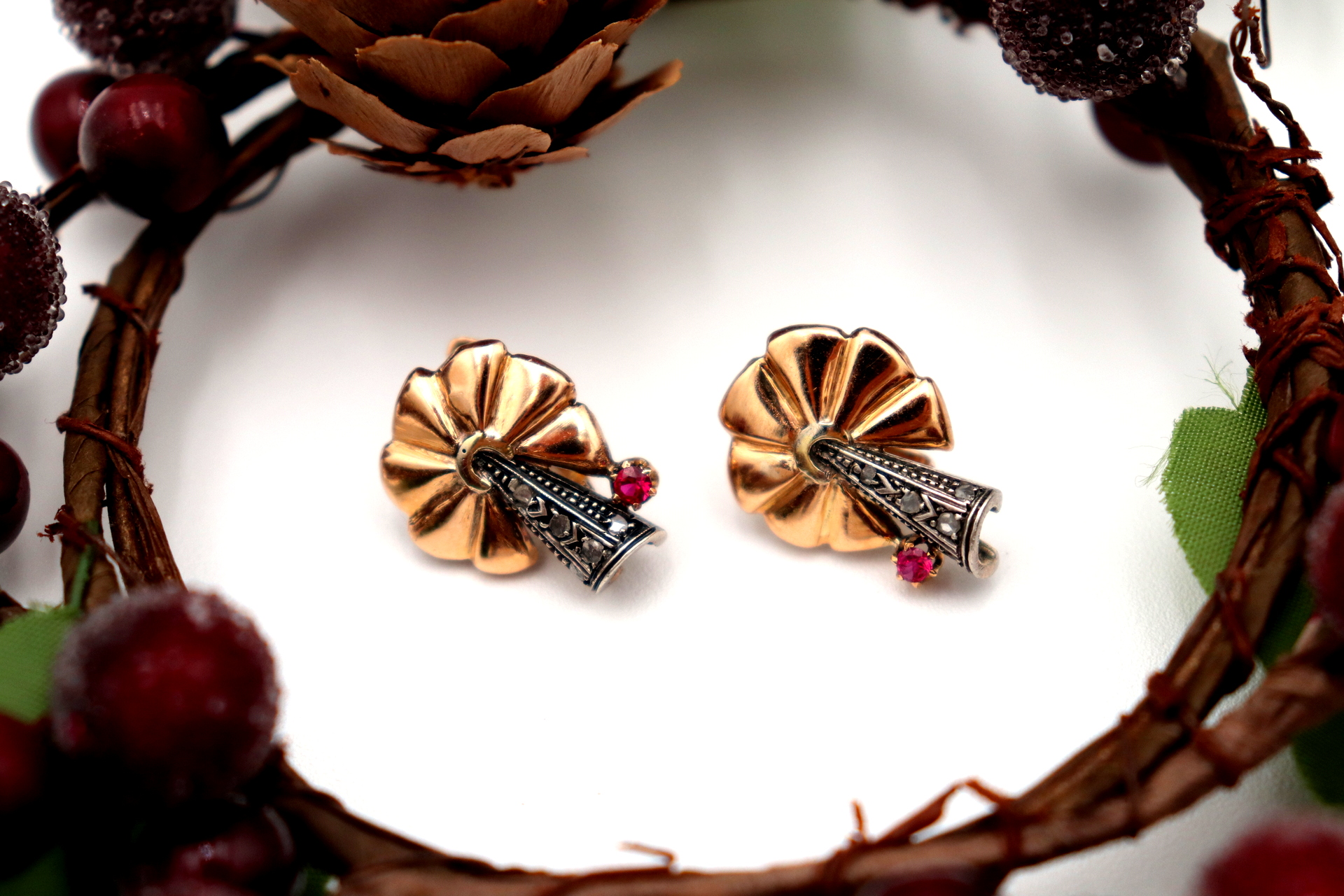 • Descrição: Brincos em ouro e prata com relevo e lascas de diamante com pedras grenat.