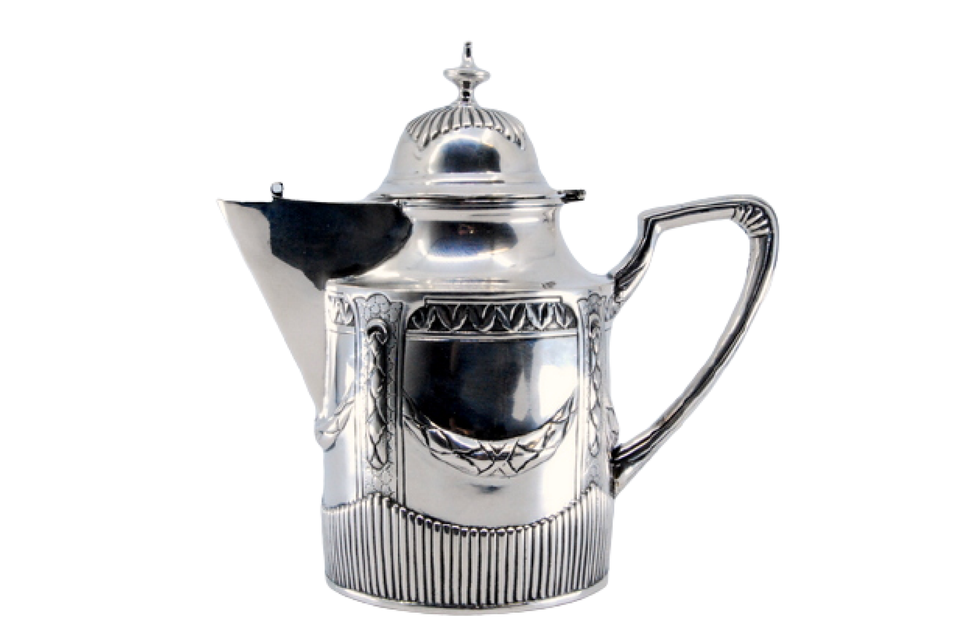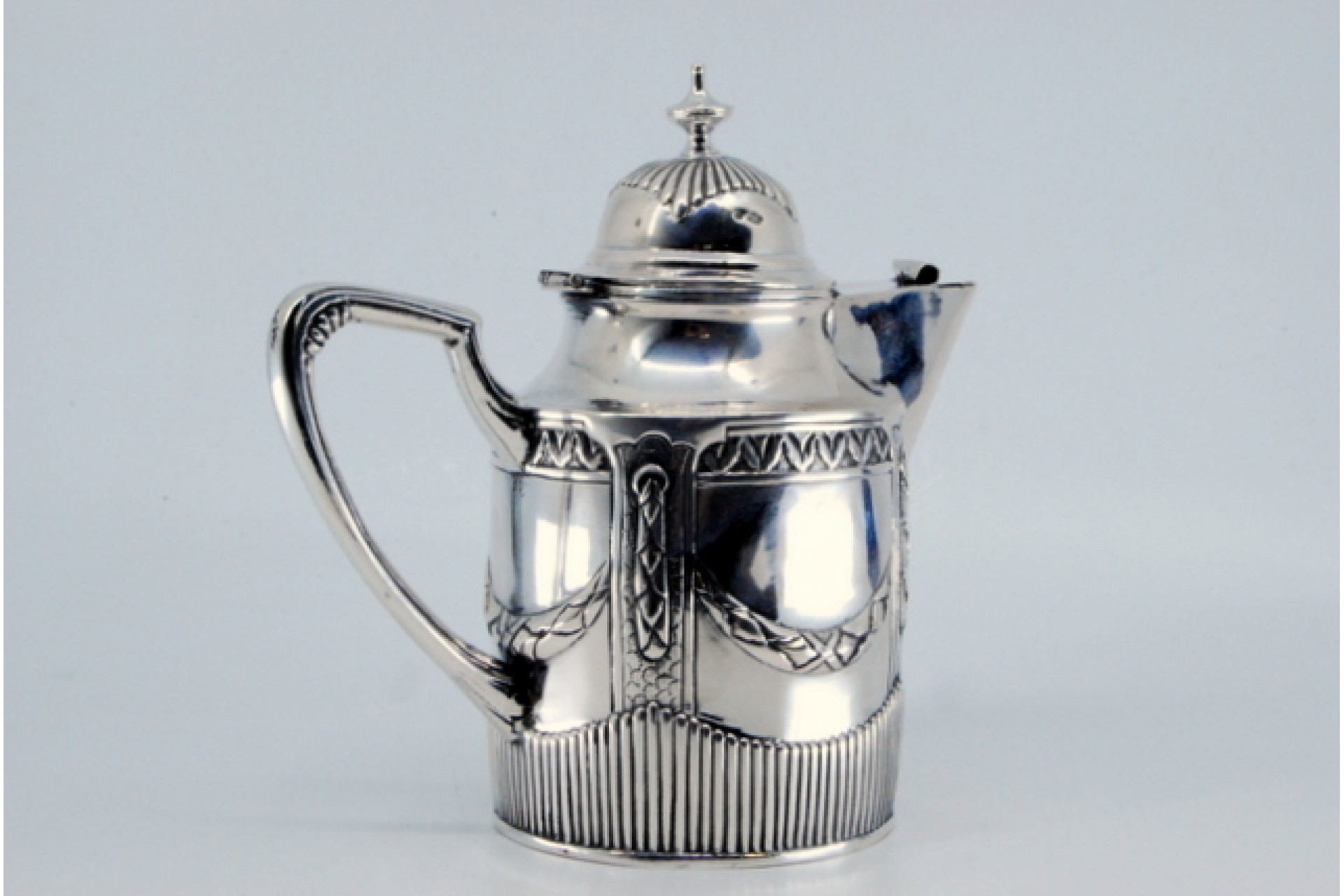 Bule em prata canelada, relevada com volutas e grinaldas.