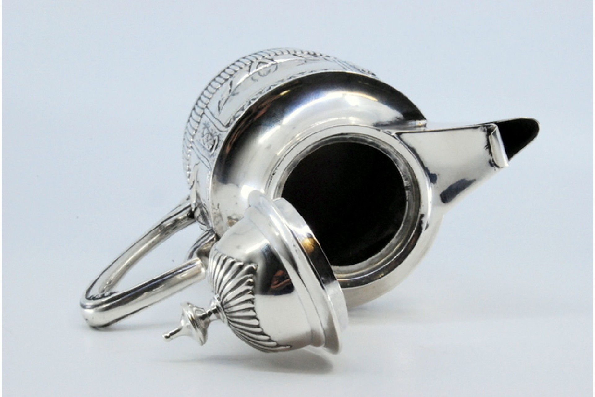 • Descrição: Bule em prata canelada, relevada com volutas e grinaldas.