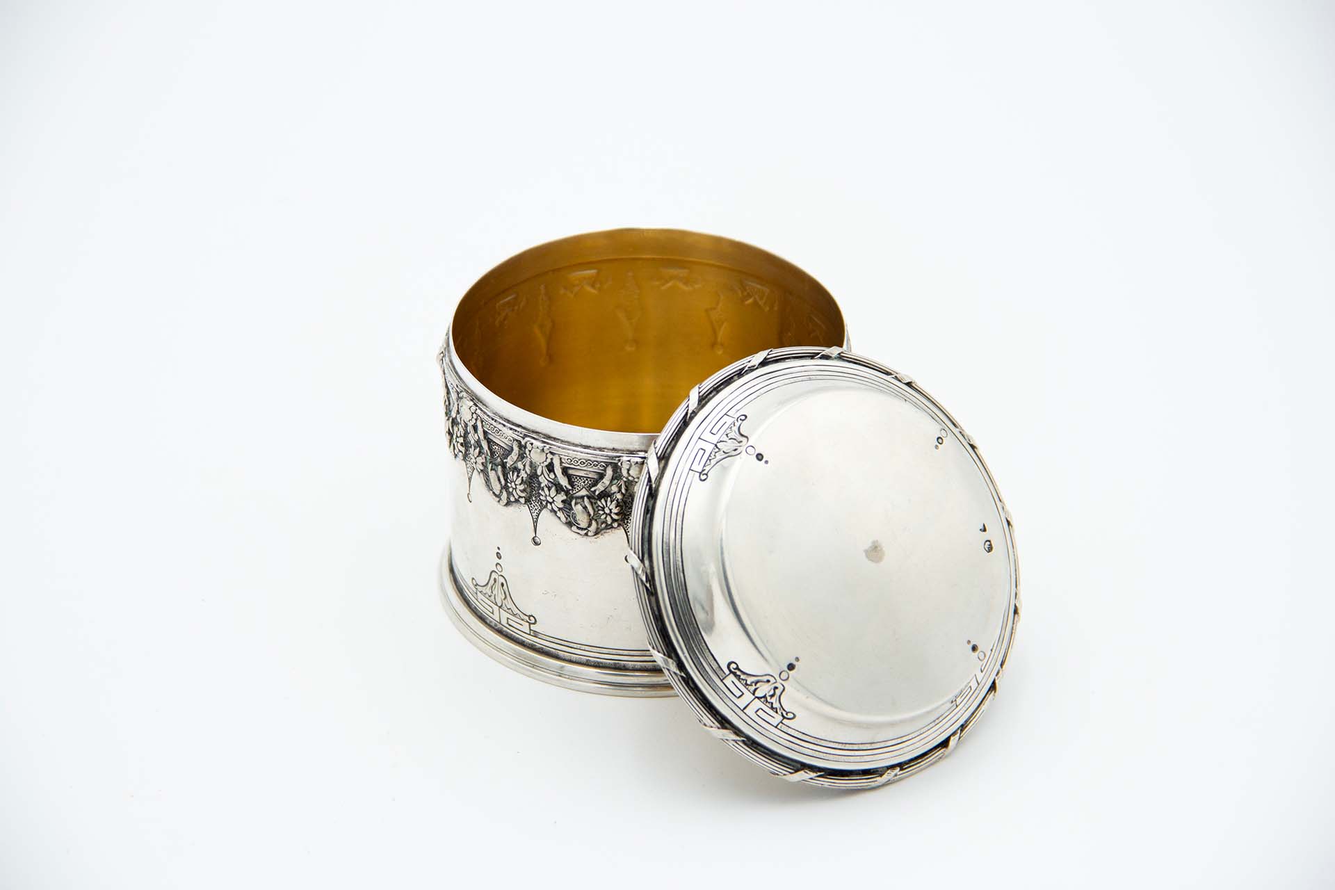 Caixa cilíndrica em prata com relevos floriados dourada no interior