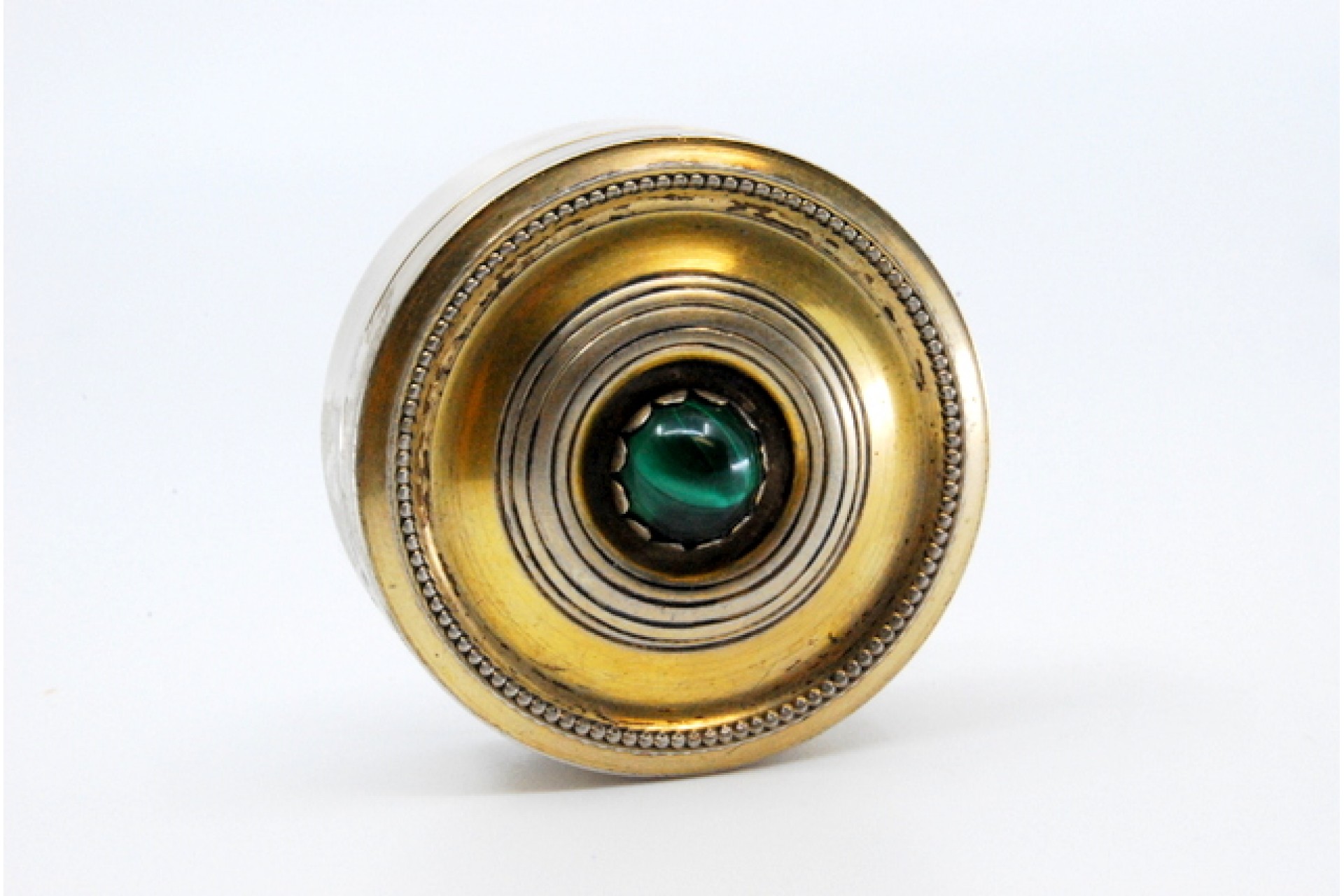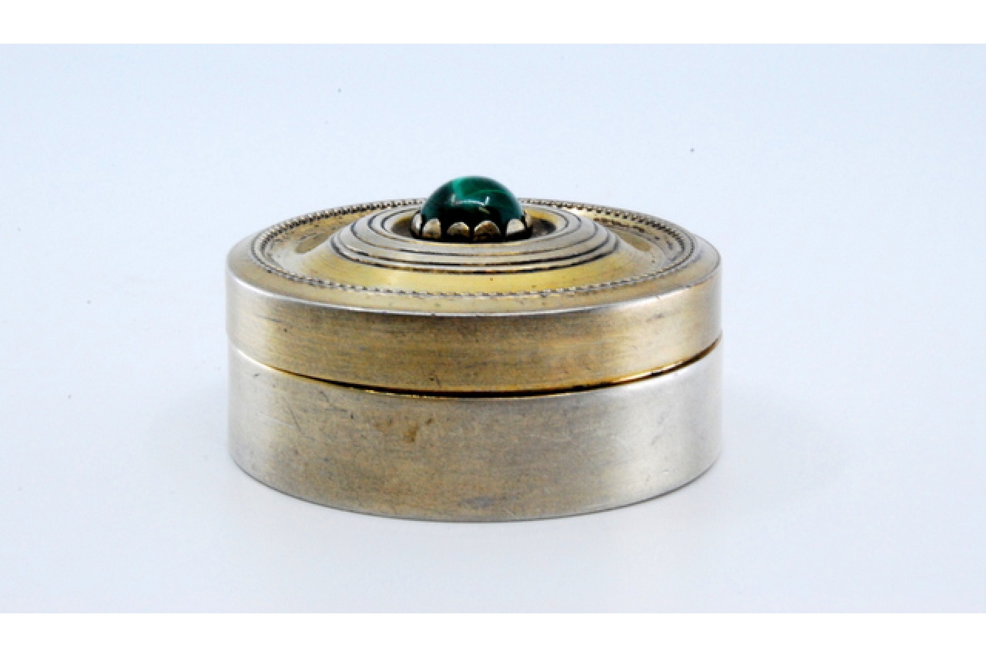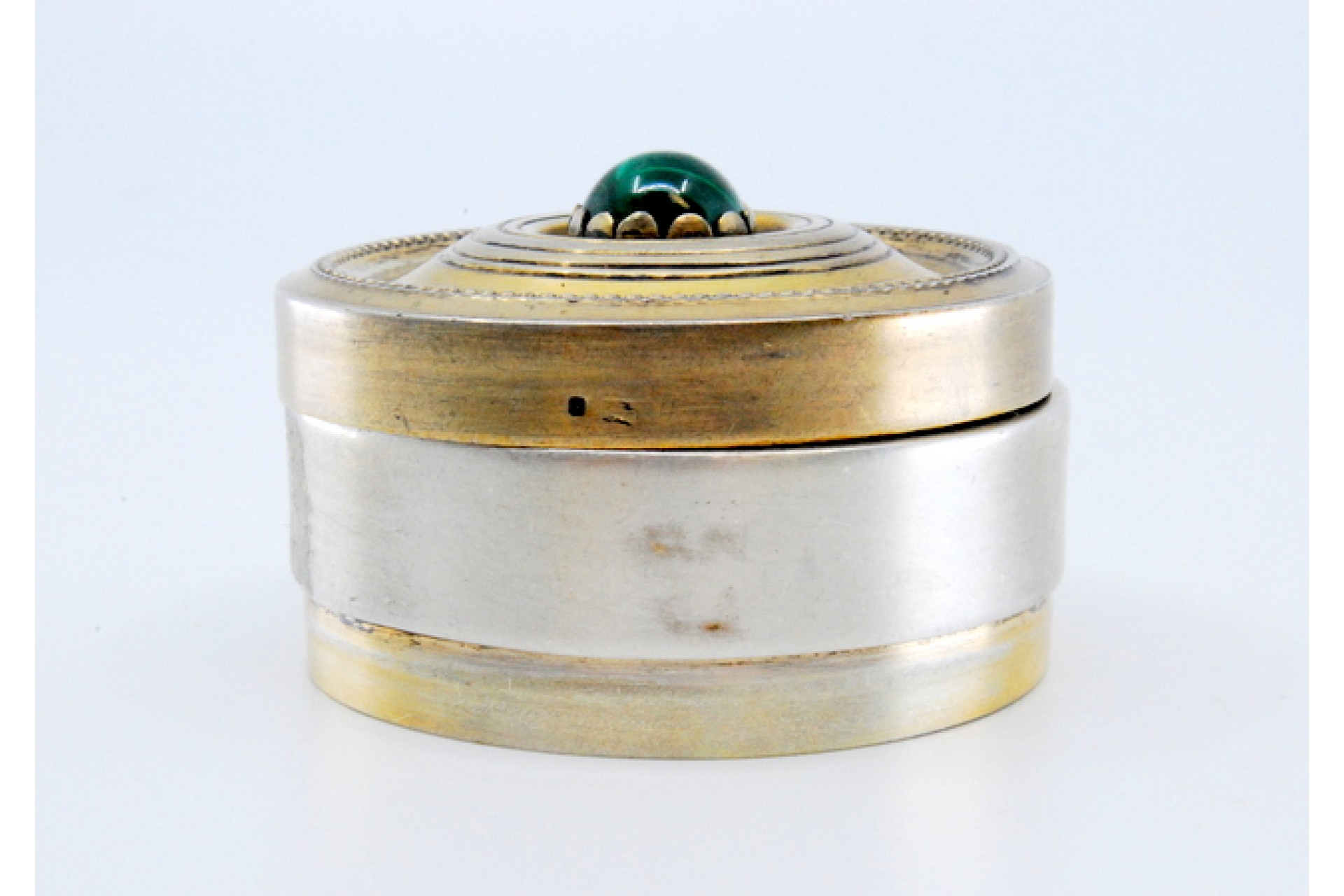 Caixa de comprimidos em prata de forma circular com frisos dourados envolvendo pedra colorida na tampa basculante.