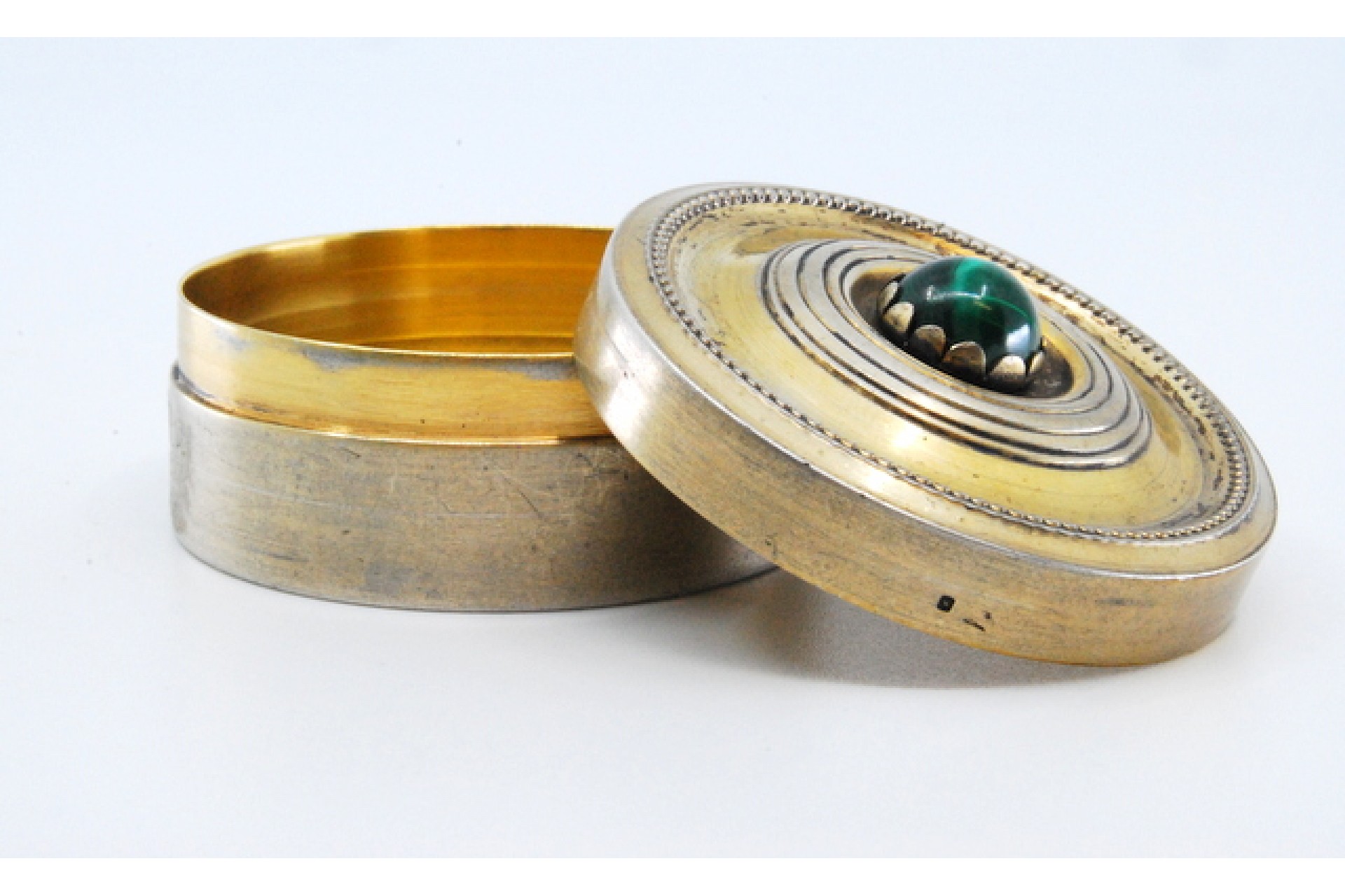 • Descrição: Caixa de comprimidos em prata de forma circular com frisos dourados envolvendo pedra colorida na tampa basculante.