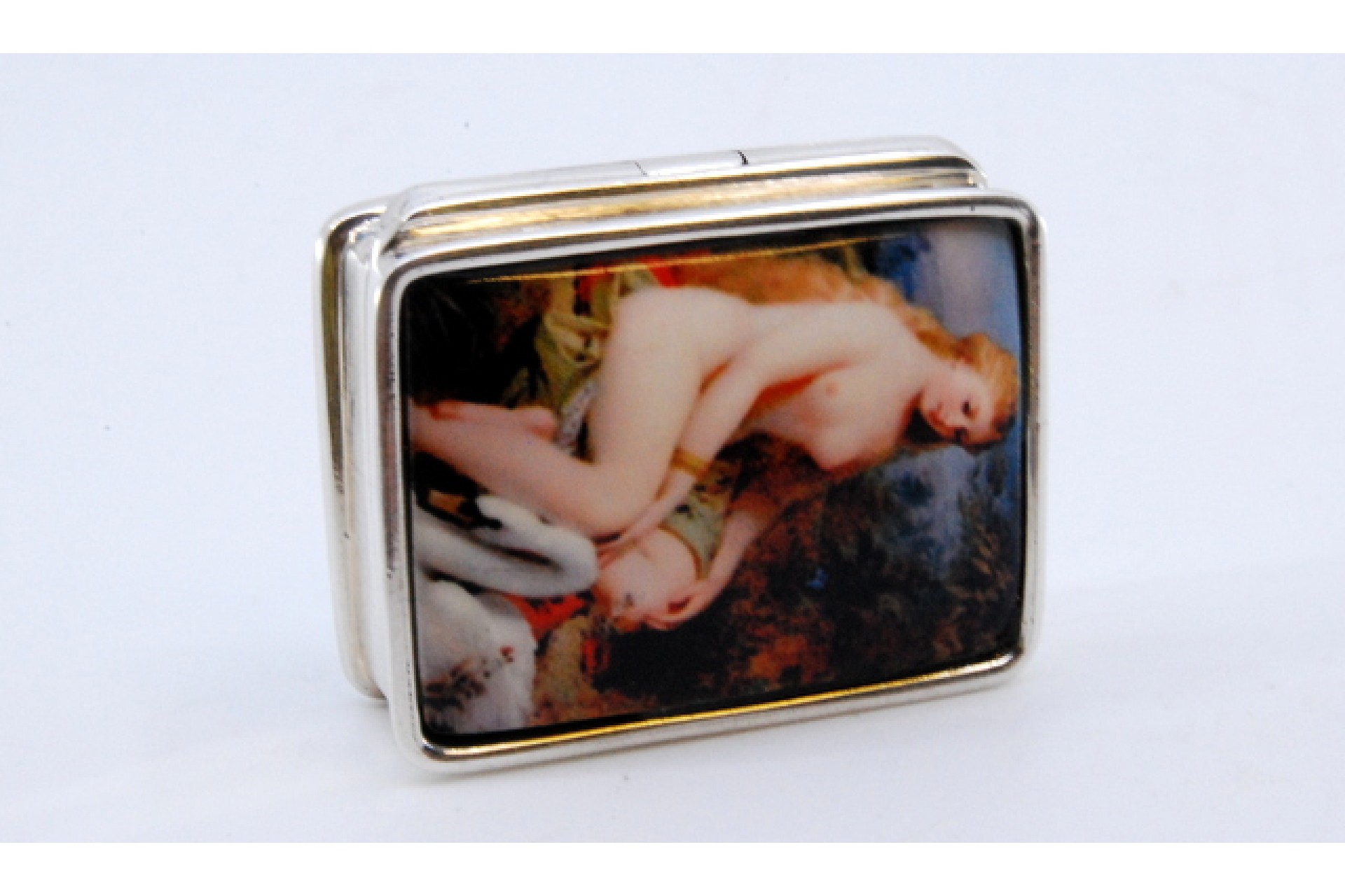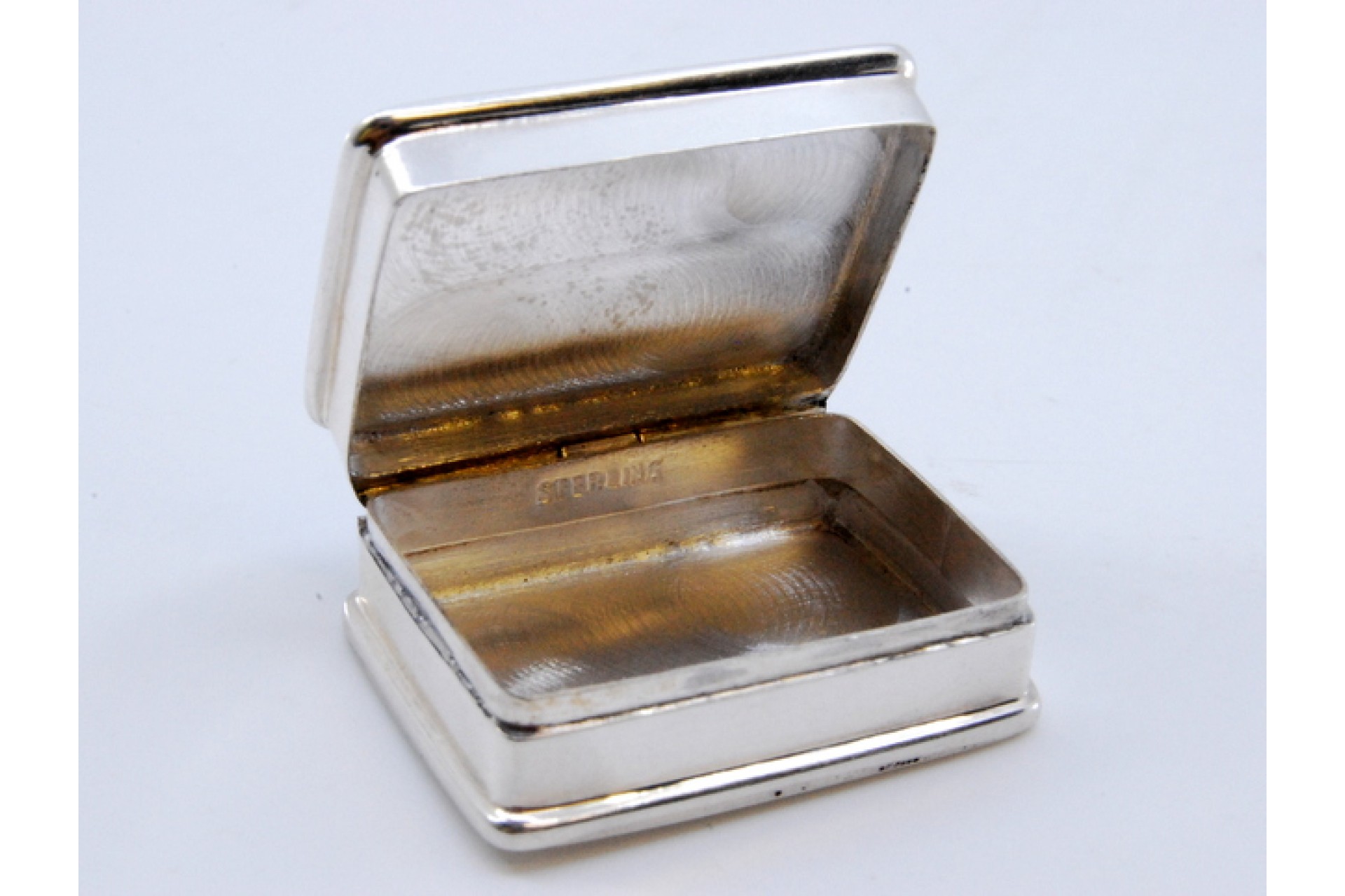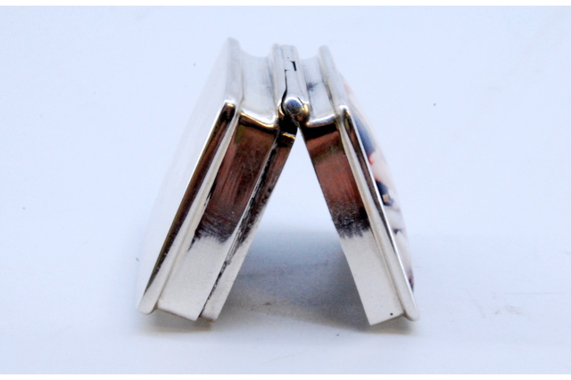 • Descrição: Caixa de comprimidos em prata com esmalte e dama antiga na tampa basculante.