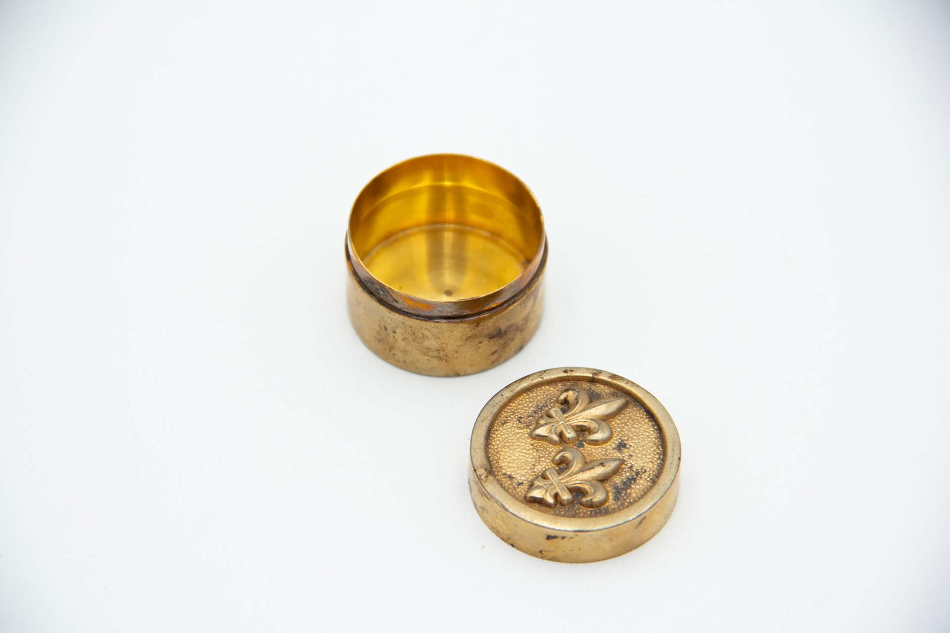 • Descrição: Caixa de comprimidos de formato cilíndrico em prata dourada com flores de liz relevadas.
