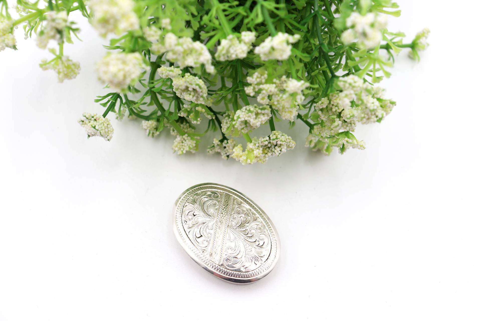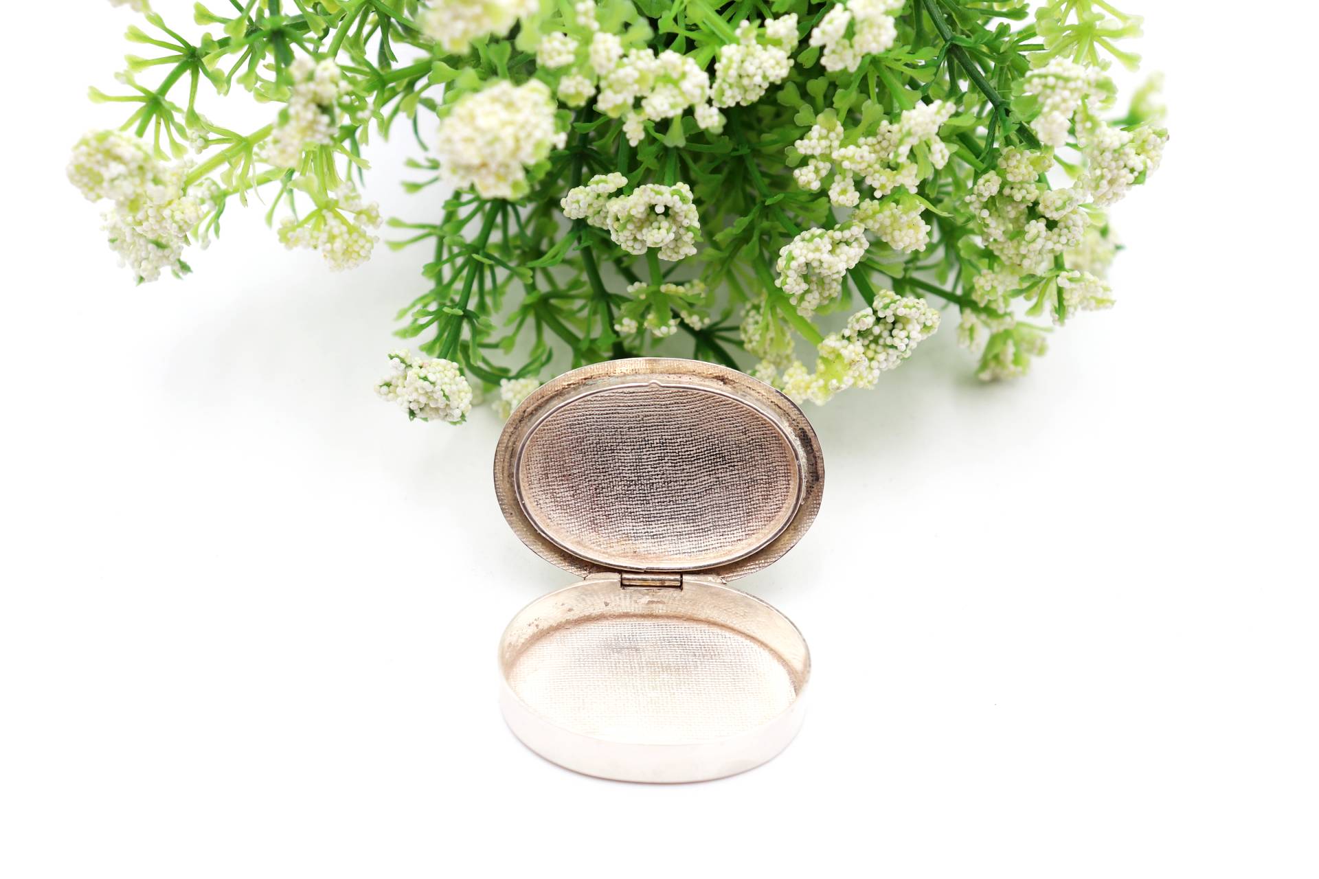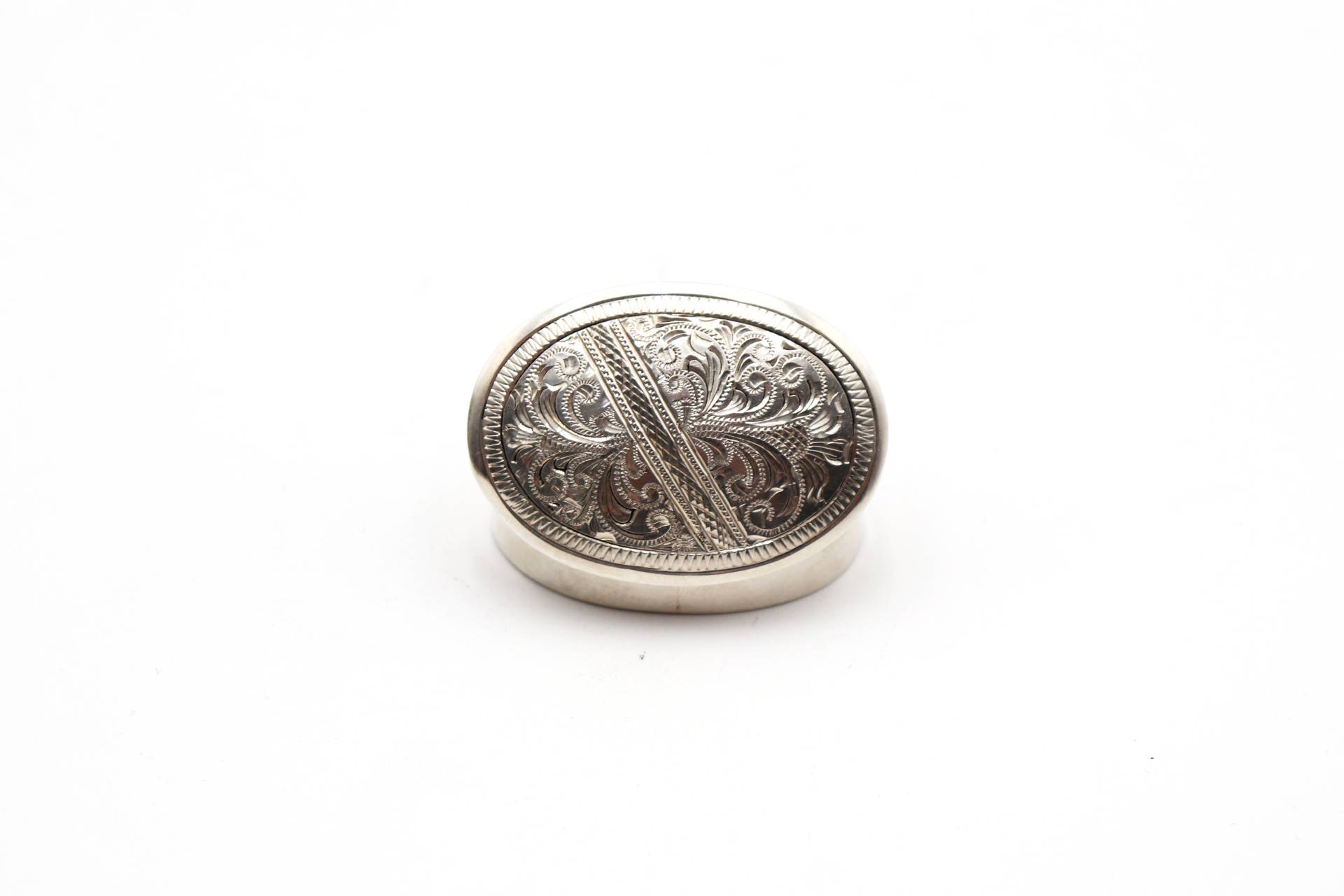 • Descrição: Caixa de comprimidos em prata com gravados vegetalistas na tampa em formato elítpico.