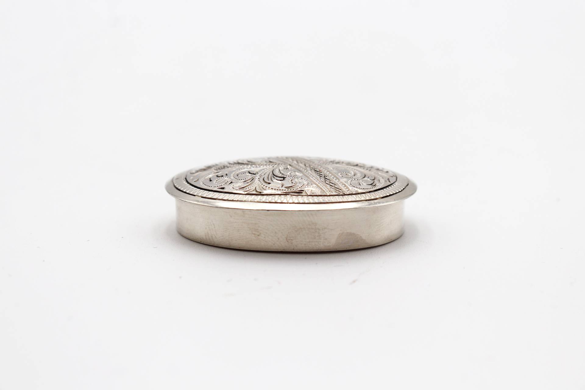 Caixa de comprimidos em prata com gravados vegetalistas na tampa
