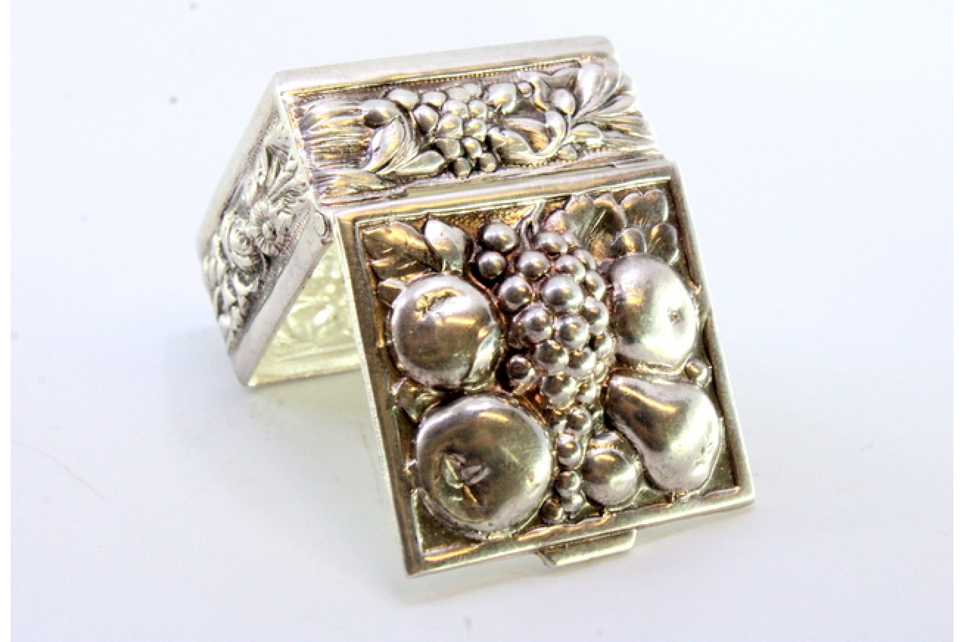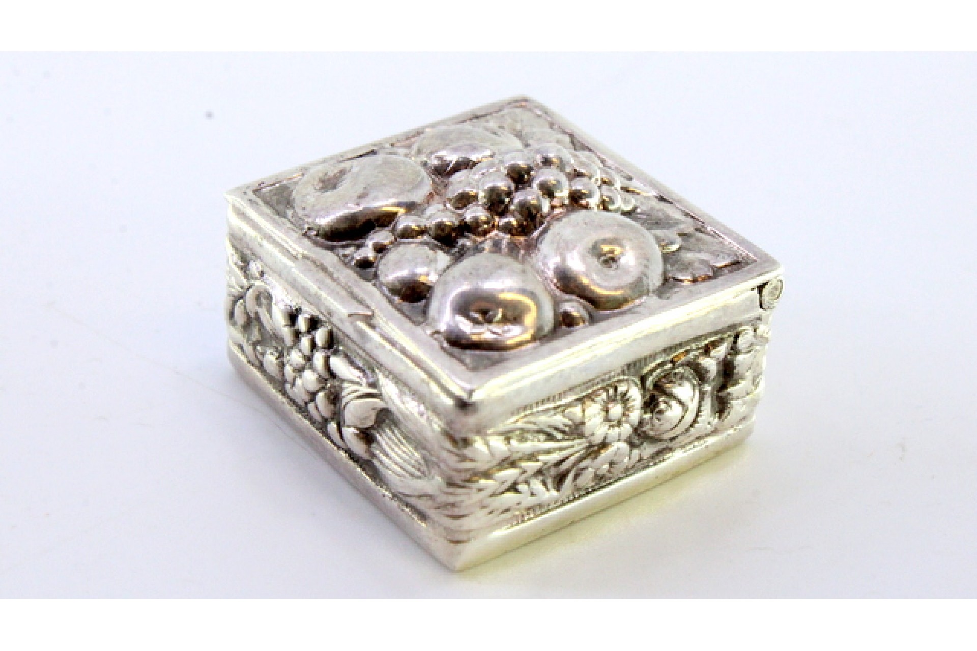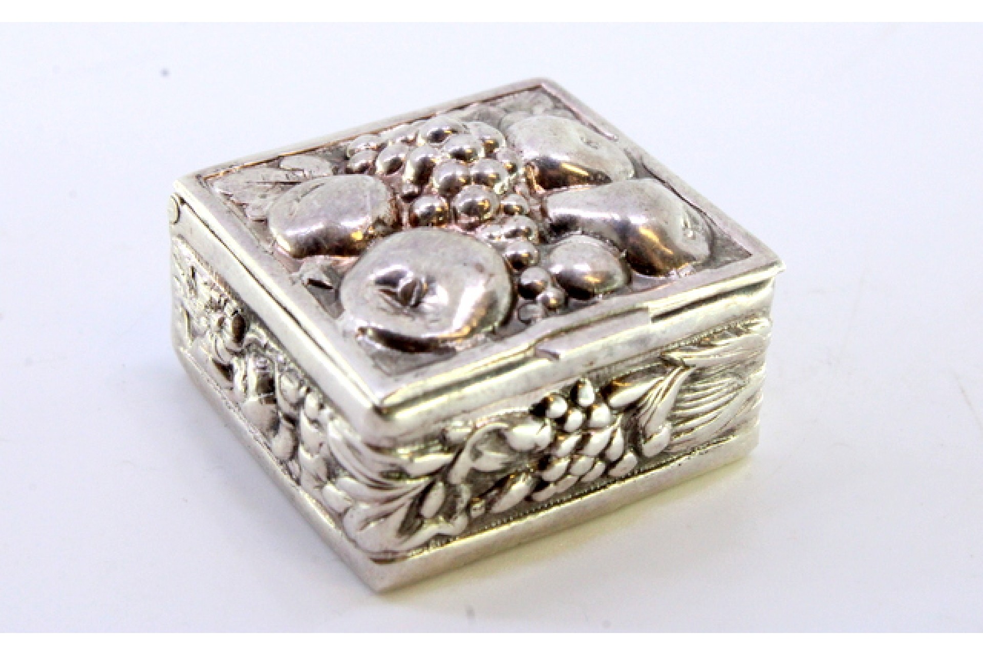 • Descrição: Caixa de comprimidos em prata com frutos relevados na tampa basculante.