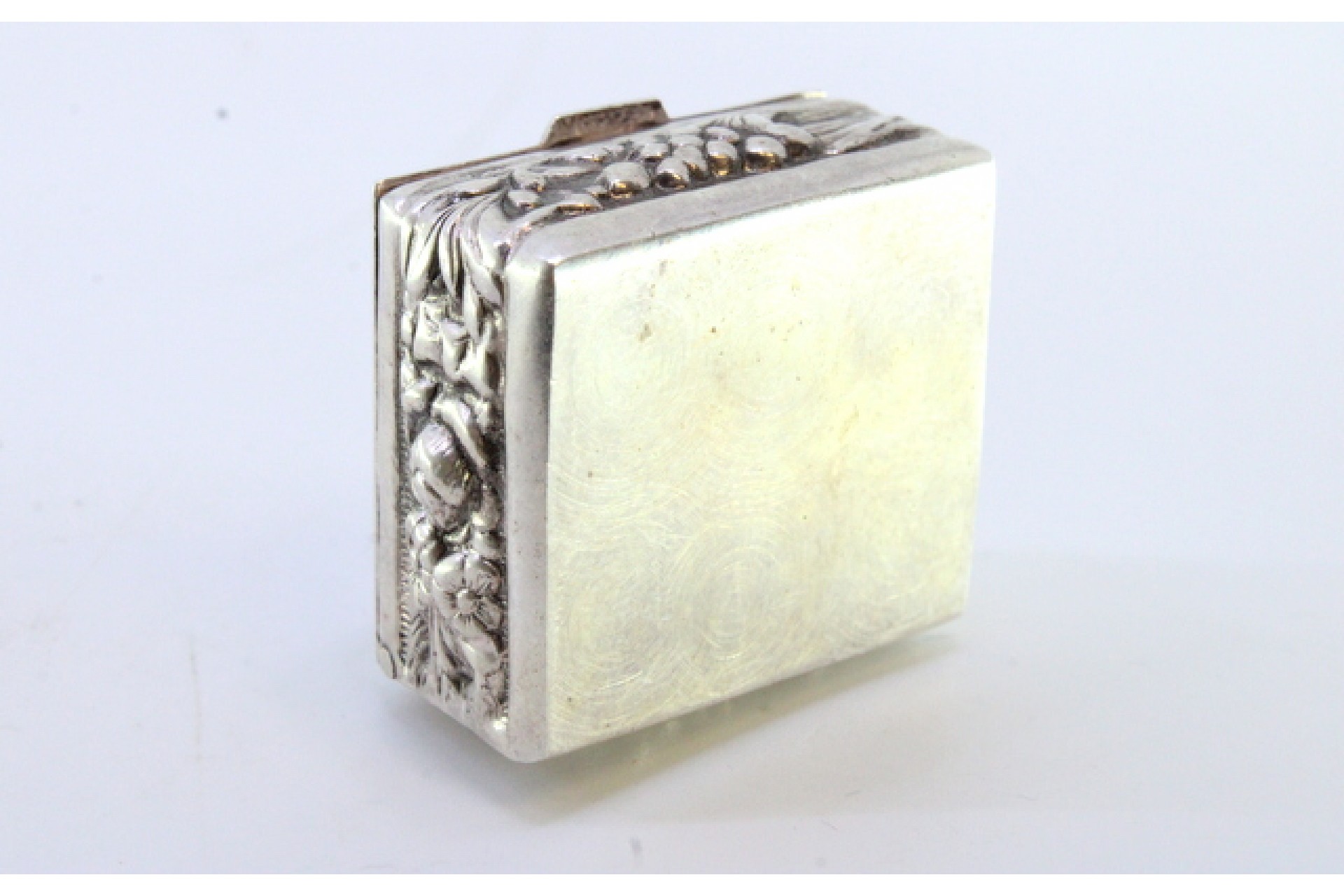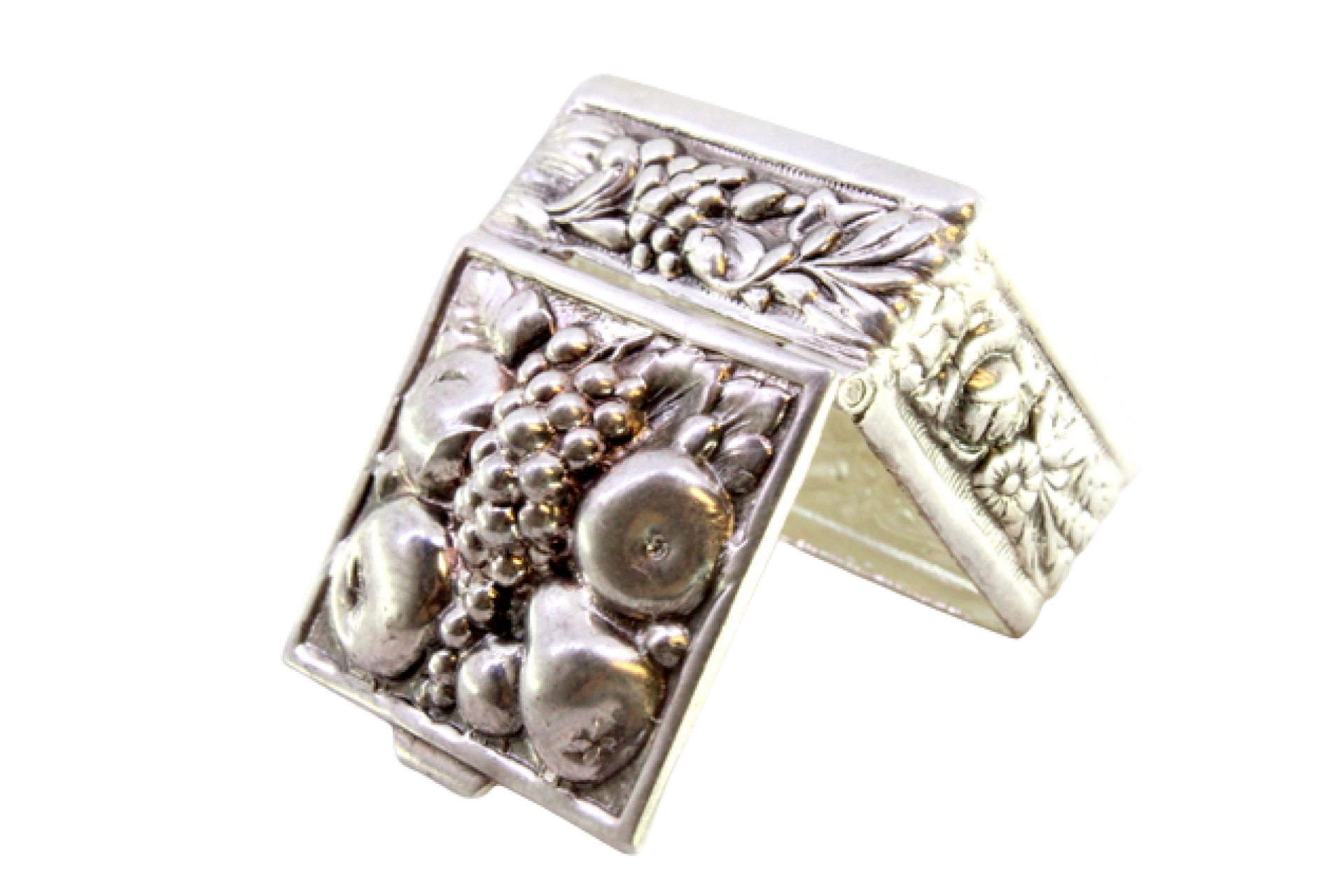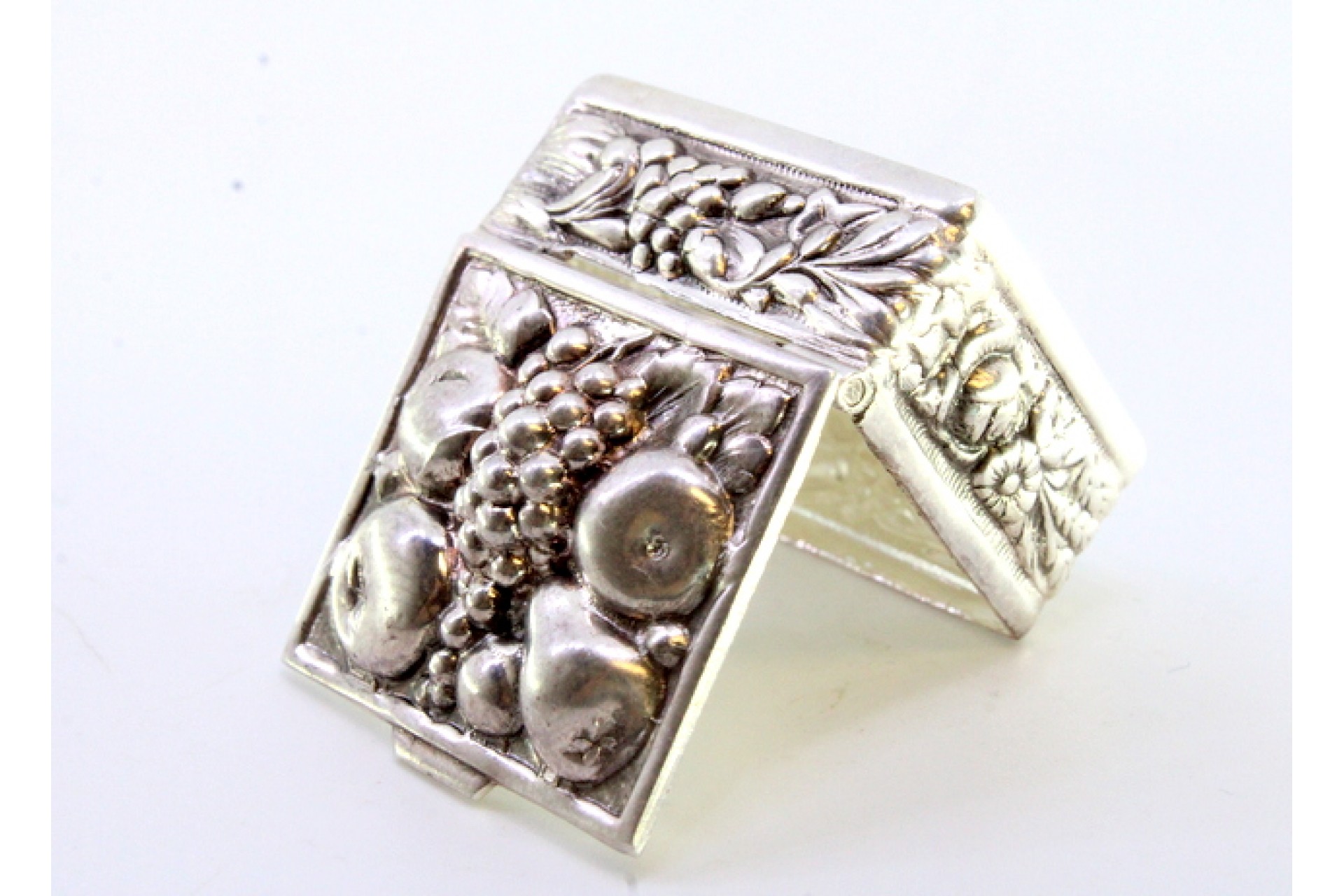 • Descrição: Caixa de comprimidos em prata com frutos relevados na tampa basculante.
