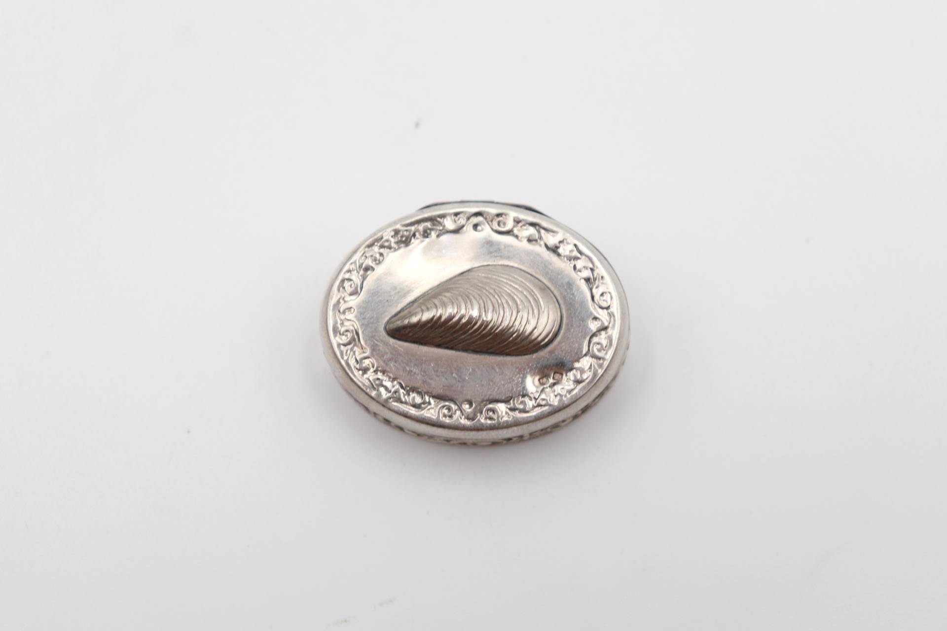 Caixa de comprimidos em prata com relevos e mexilhão em vulto perfeito na tampa