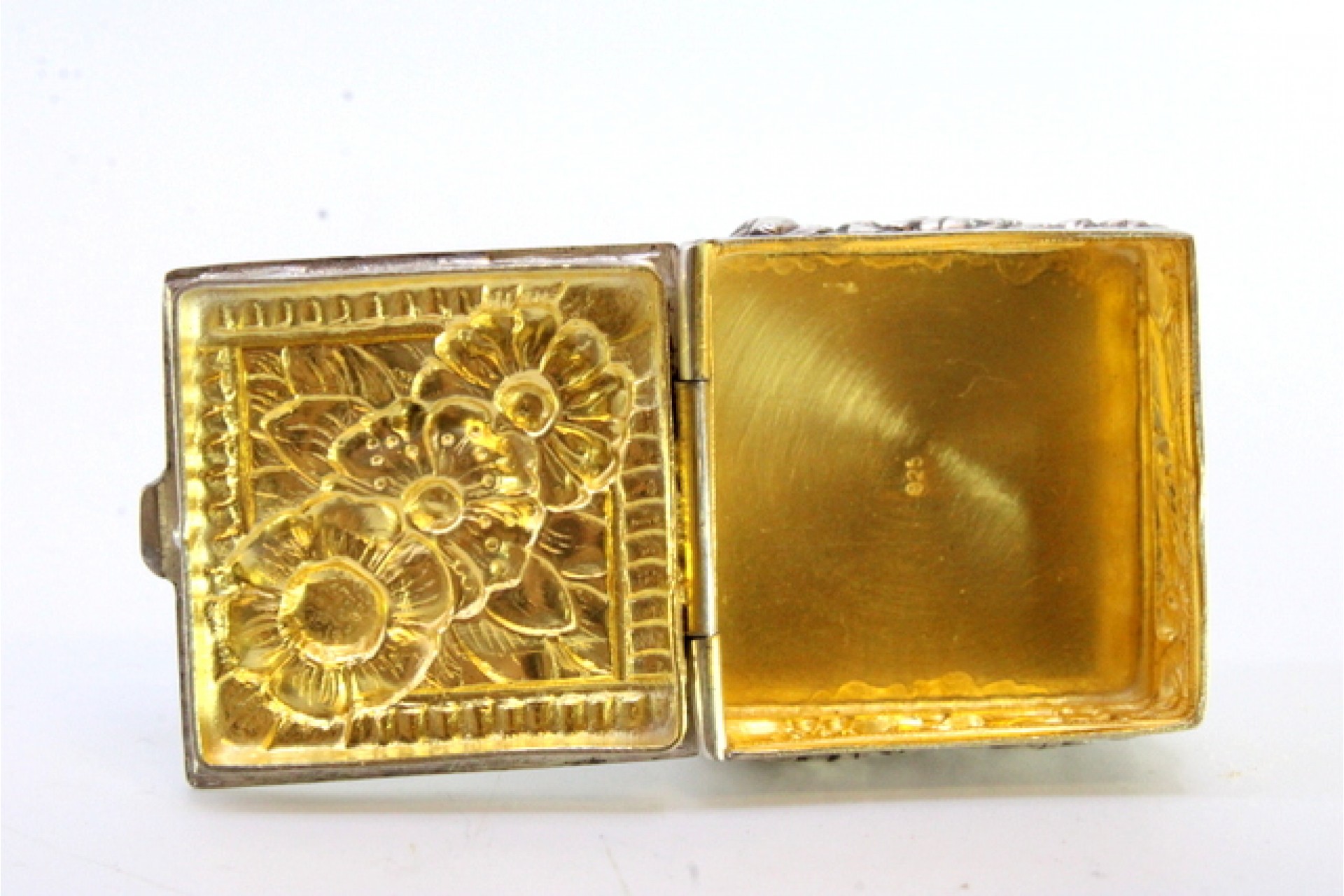 Caixa de comprimidos em prata com relevos e interior em dourado.