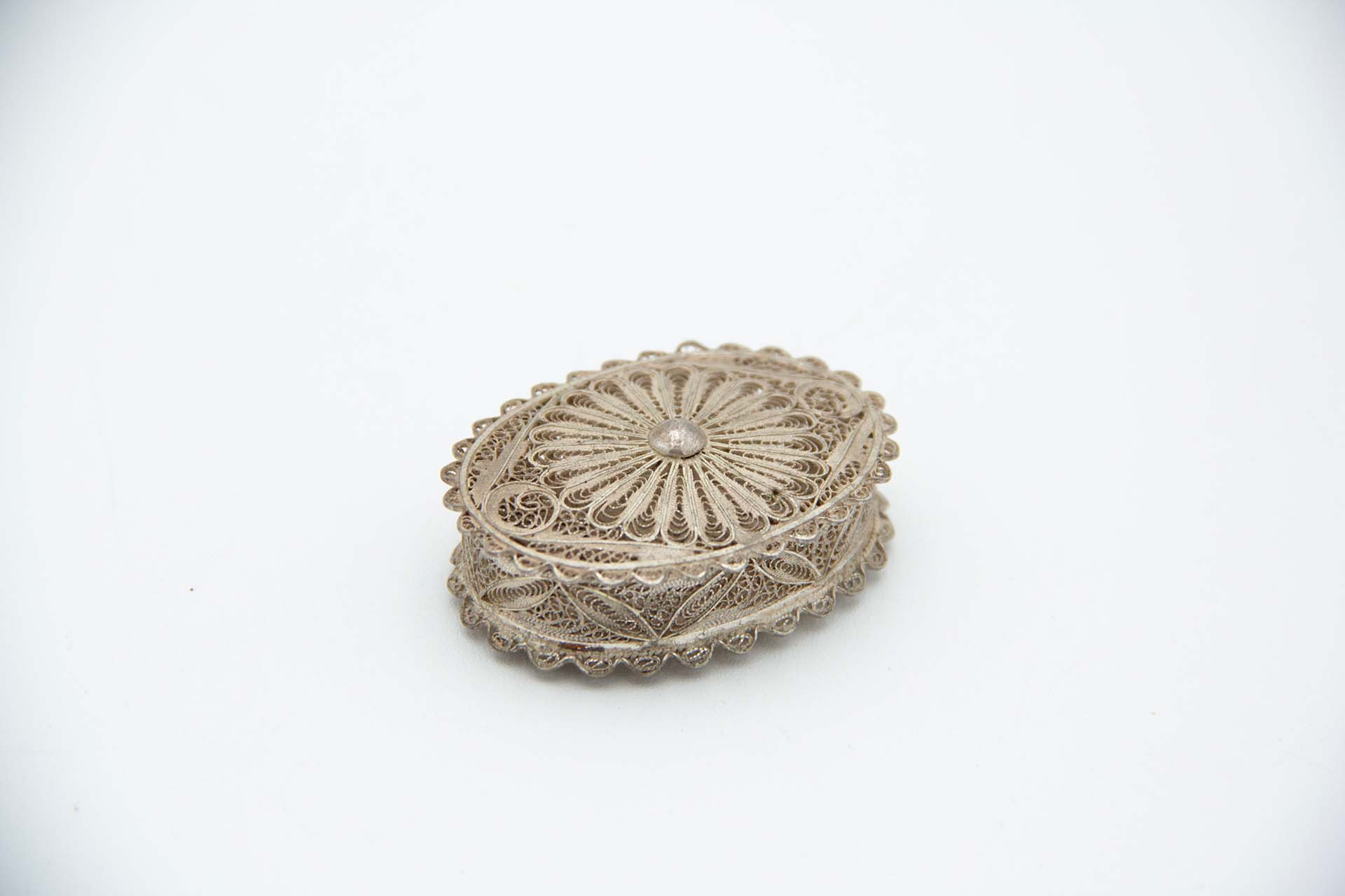 • Descrição: Caixa de comprimidos em prata de malha filigrana e de forma elíptica.